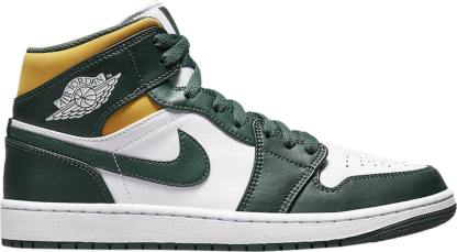 This offering of the mid-top 1 comes constructed in a leather build featuring a White base with Green overlays . laces . tongue labels . liner . and rubber outsole. Highlighting the shoe are Yellow hits on the ankle collar and Jumpman branding while White continues on the tongues . insoles . and midsole.