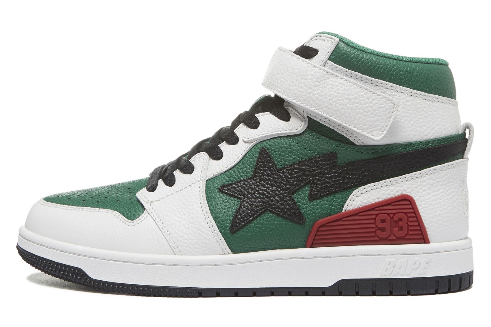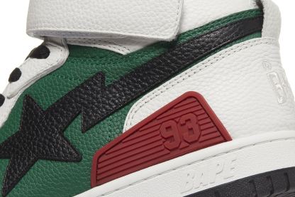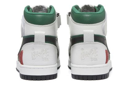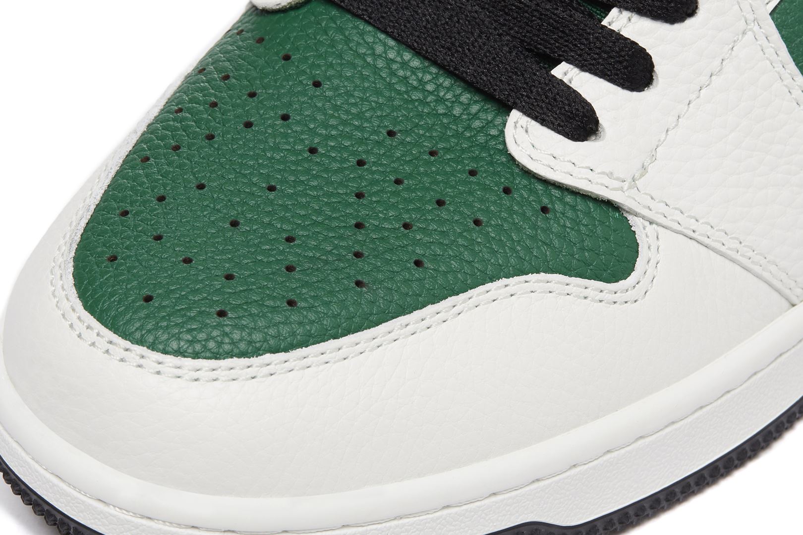 New footwear that combines luxury and urban style. A high-top model that combines green, black, and white with red as an accent.