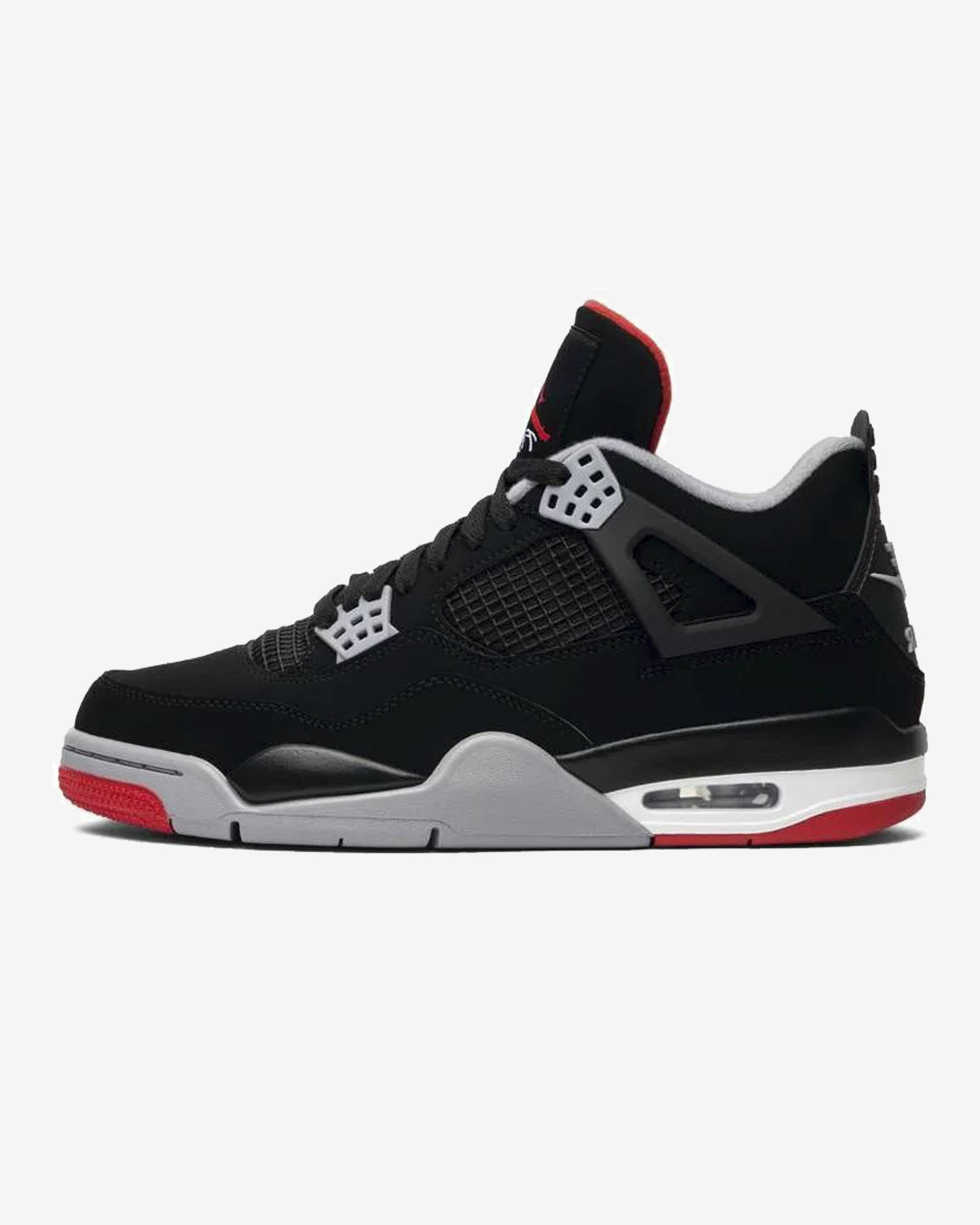 The 2019 edition of the Air 4 ‘Bred’ celebrates the 30th anniversary of the classic silhouette . appearing in the same colorway that Michael wore when he sank ‘The Shot’ during the first round of the 1989 NBA playoffs. It’s rendered in a build that’s faithful to the original . complete with a black nubuck upper . visible Air Sole cushioning underfoot and Air branding on the heel.