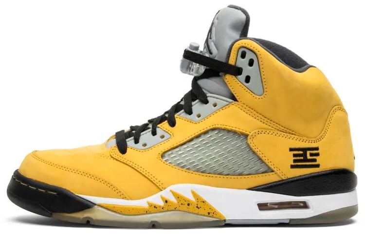 To celebrate the opening of the Tokyo 23 store in Japan . Brand prepared a special rendition of the 5. Constructed with a yellow suede upper . the shoe is accented by Wolf Grey on the tongue . eyelets and webbing on the quarter panel. Hits of black on the toe . heel and laces provide contrast . as does the Japanese character embroidered on the heel.