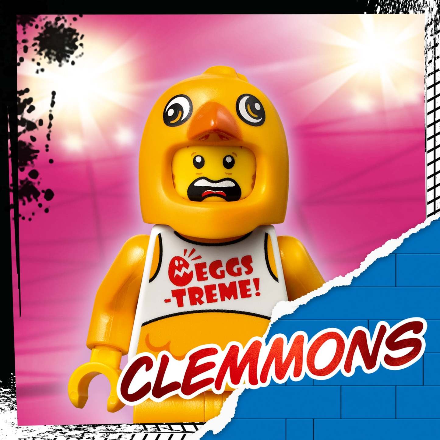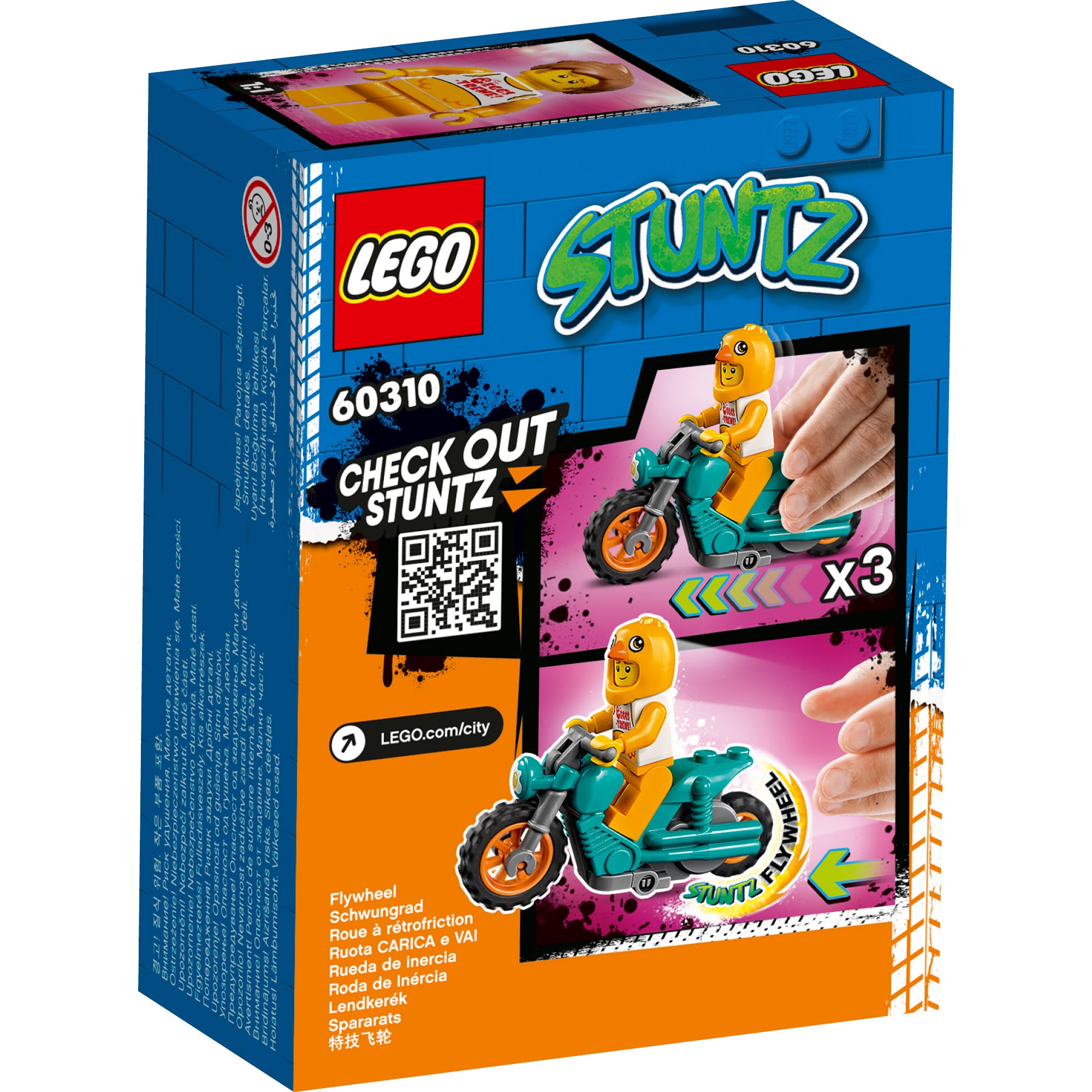 - What’s in the box? Everything kids need to build a flywheel-powered stunt motorbike, plus LEGO® City Adventures TV series character Clemmons dressed in a mascot chicken suit.