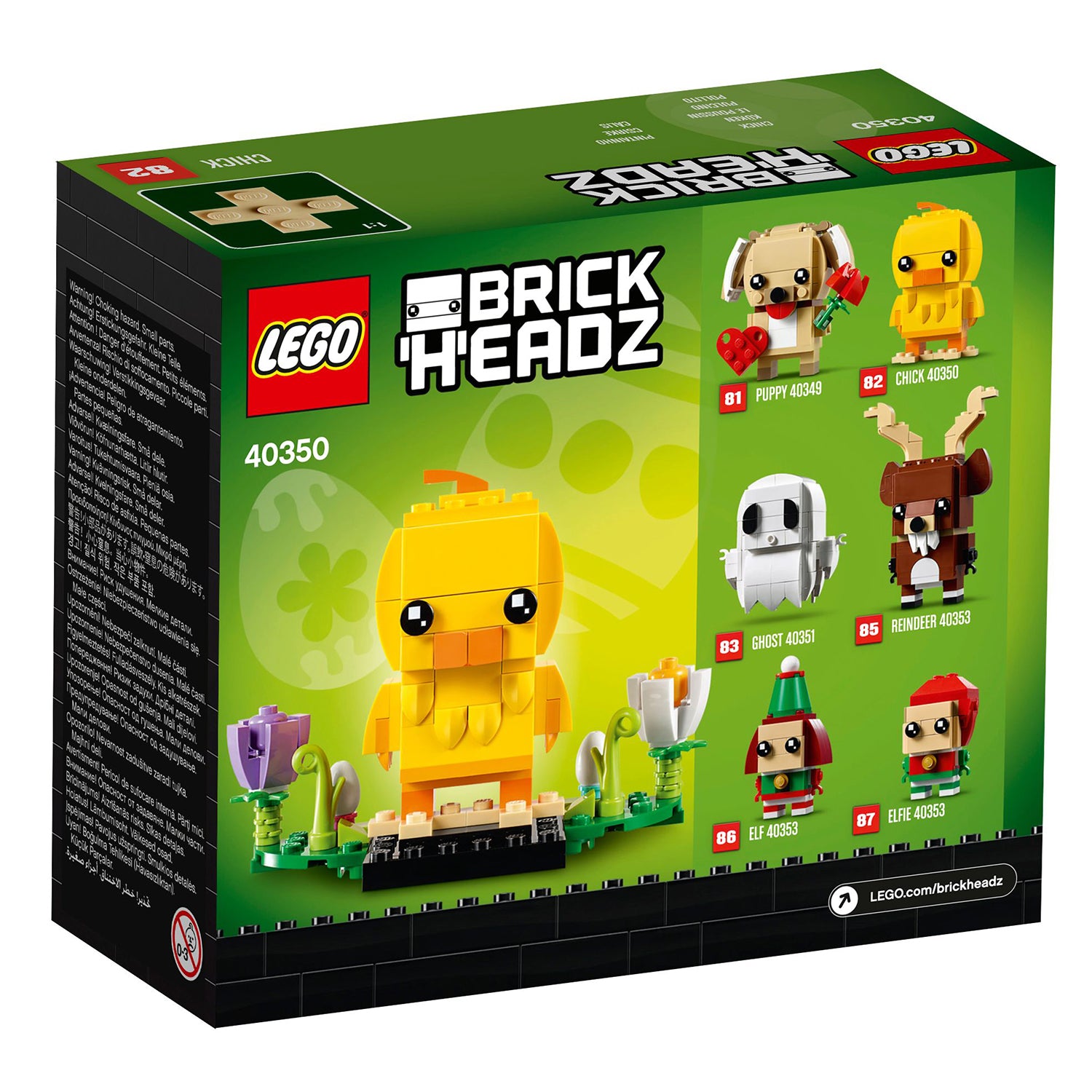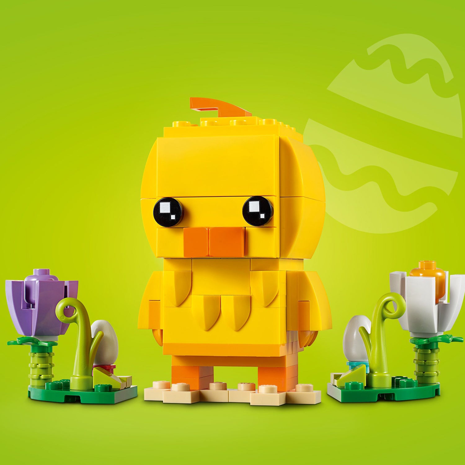 - Buildable LEGO® BrickHeadz™ interpretation of an Easter Chick with BrickHeadz eyes stands in a scene featuring colorful Easter flowers and leaves, and 2 eggs.