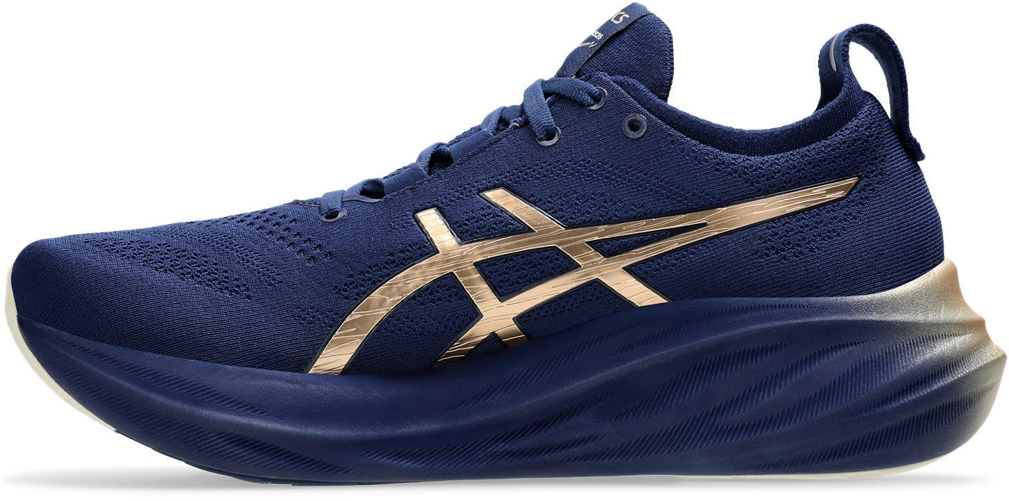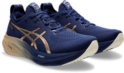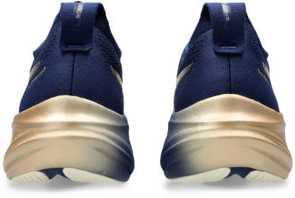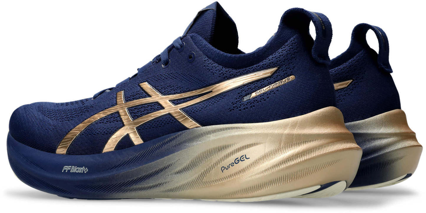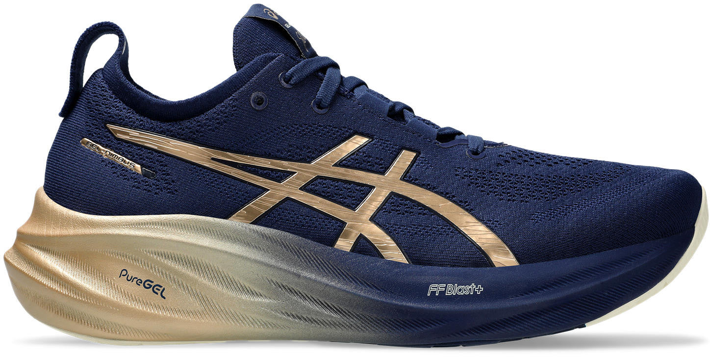 The GEL-NIMBUS™ 26 PLATINUM shoe's soft cushioning properties help you feel like you're landing on clouds. This design is revamped to help create a softer and smoother running experience. This collection is inspired by Shibori dyeing techniques and features metallic details. It's designed to stand out and be noticed.A soft engineered knit upper comfortably wraps your foot while supplying advanced ventilation. Additionally, the knit tongue and collar help provide a soft and supportive feel.By using FF BLAST™ PLUS ECO cushioning, this trainer creates a lighter and softer cushioning experience.Lastly, HYBRID AsithtcsGRIP™ outsole rubber helps create better traction, improved softness, and advanced durability.