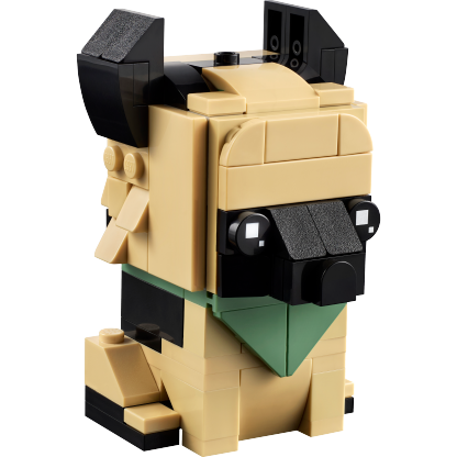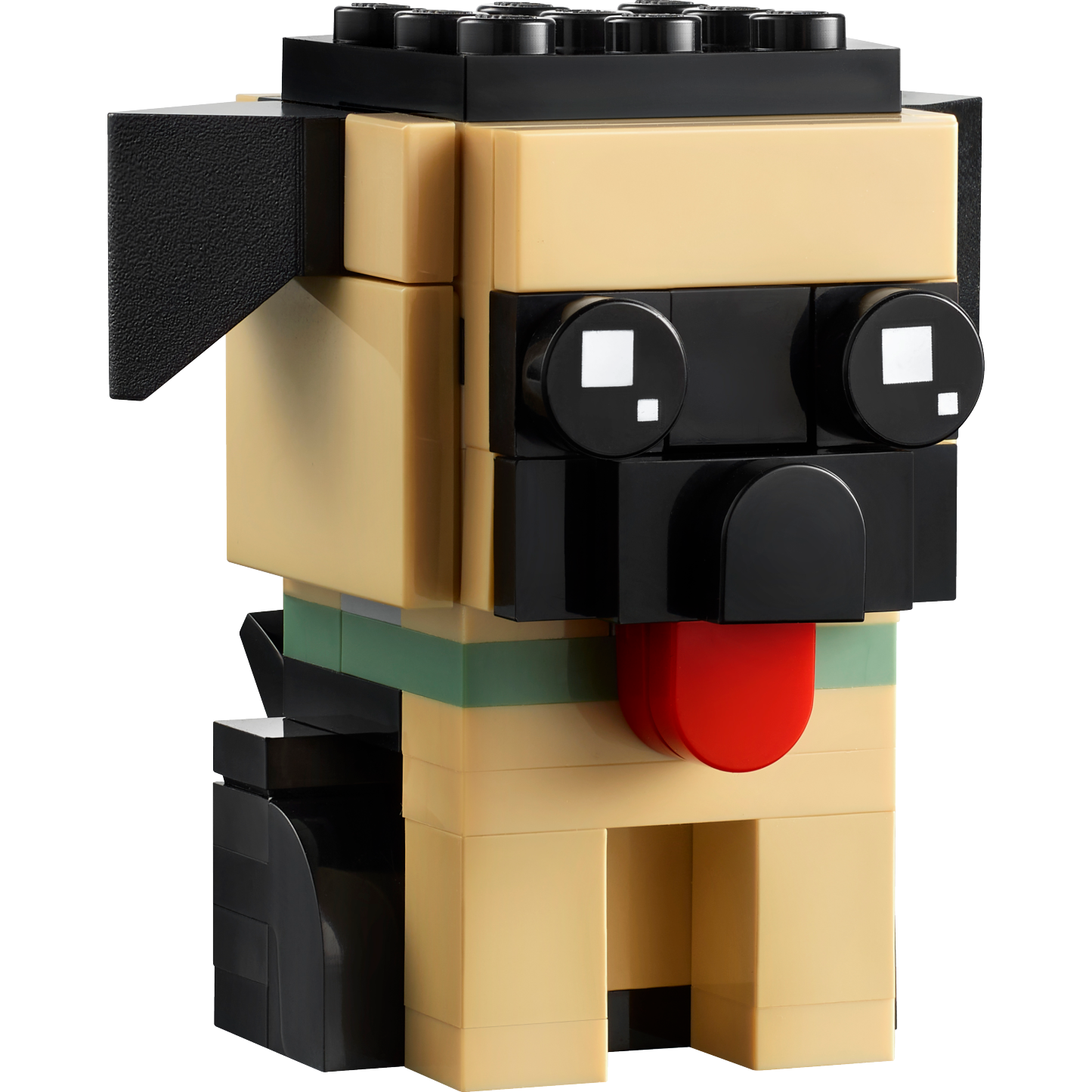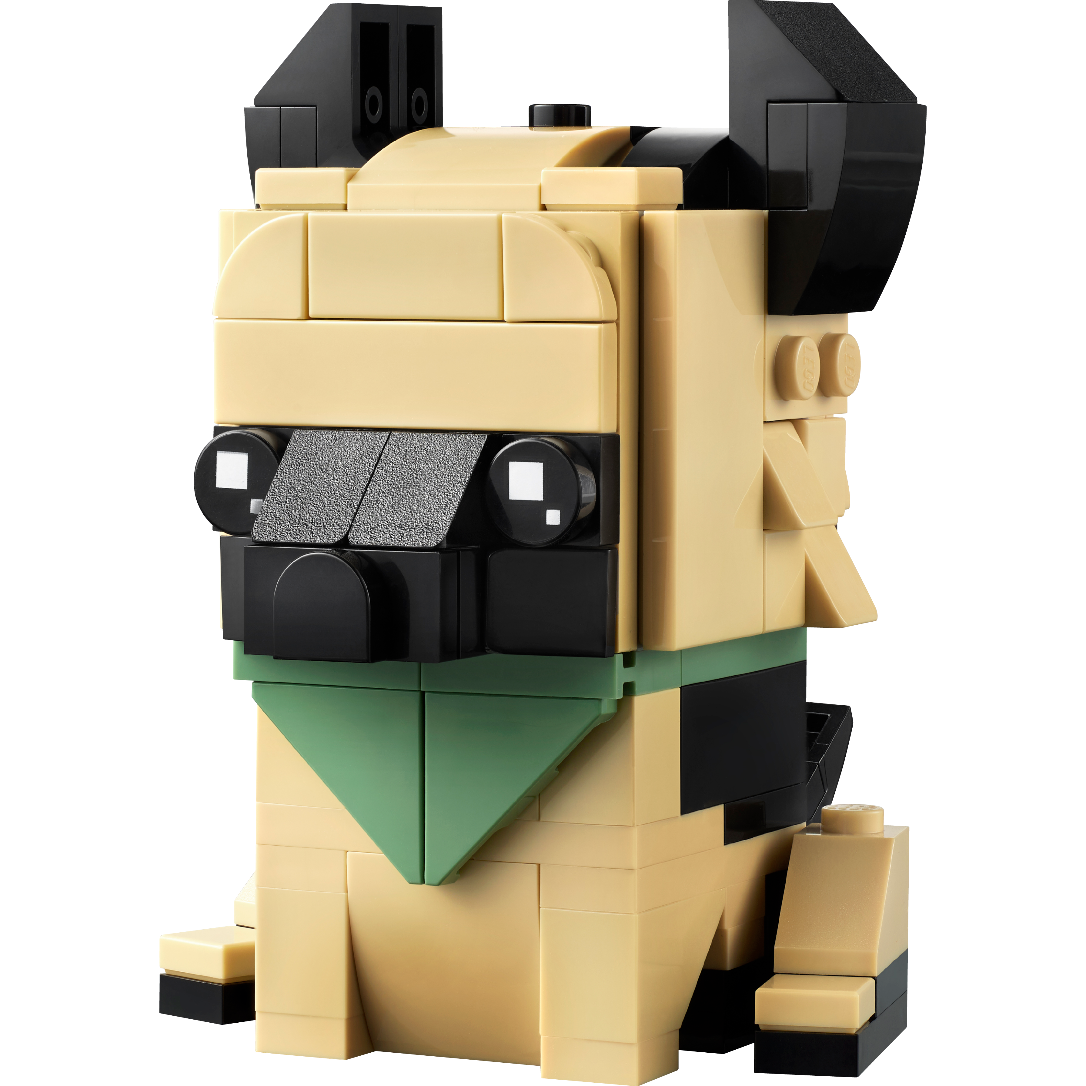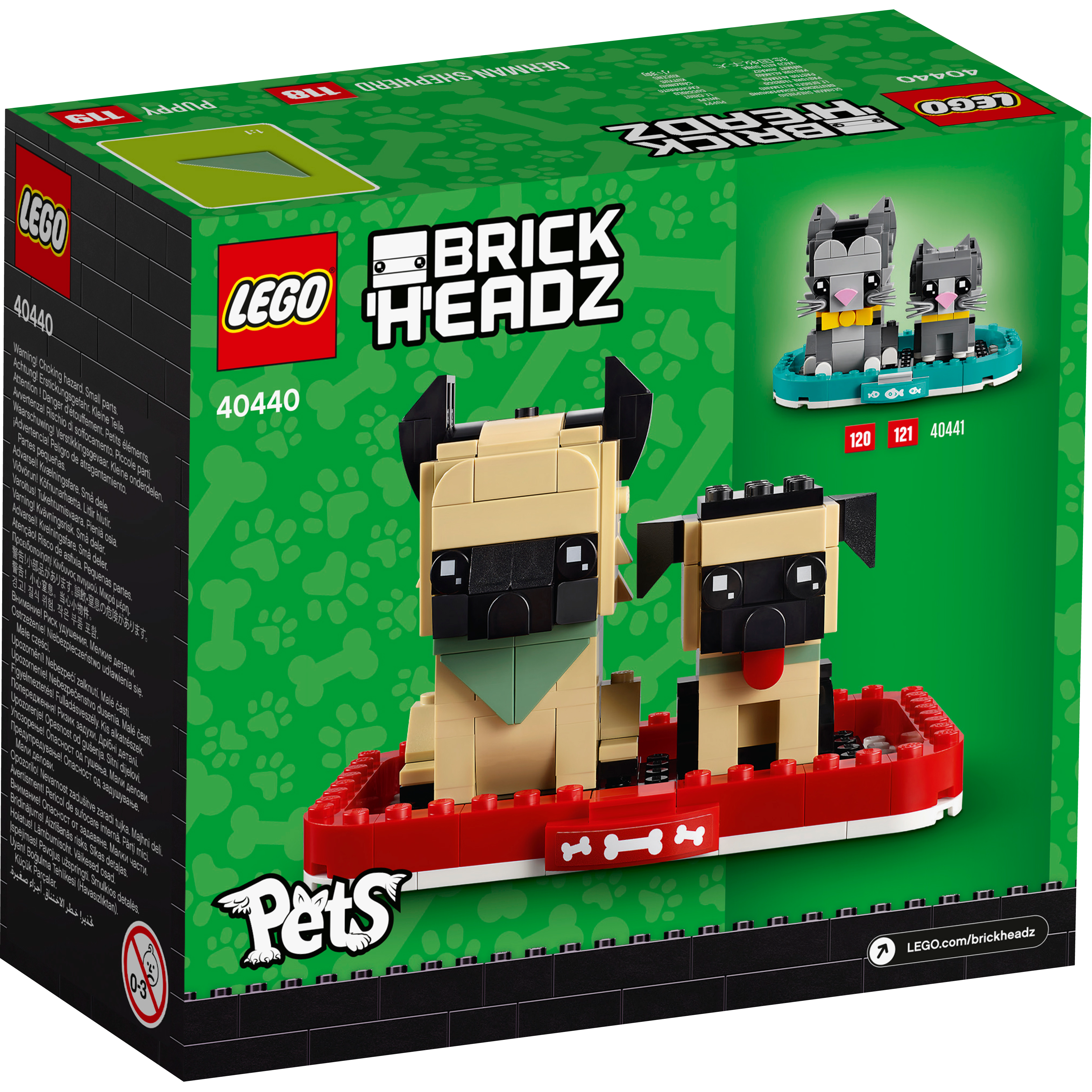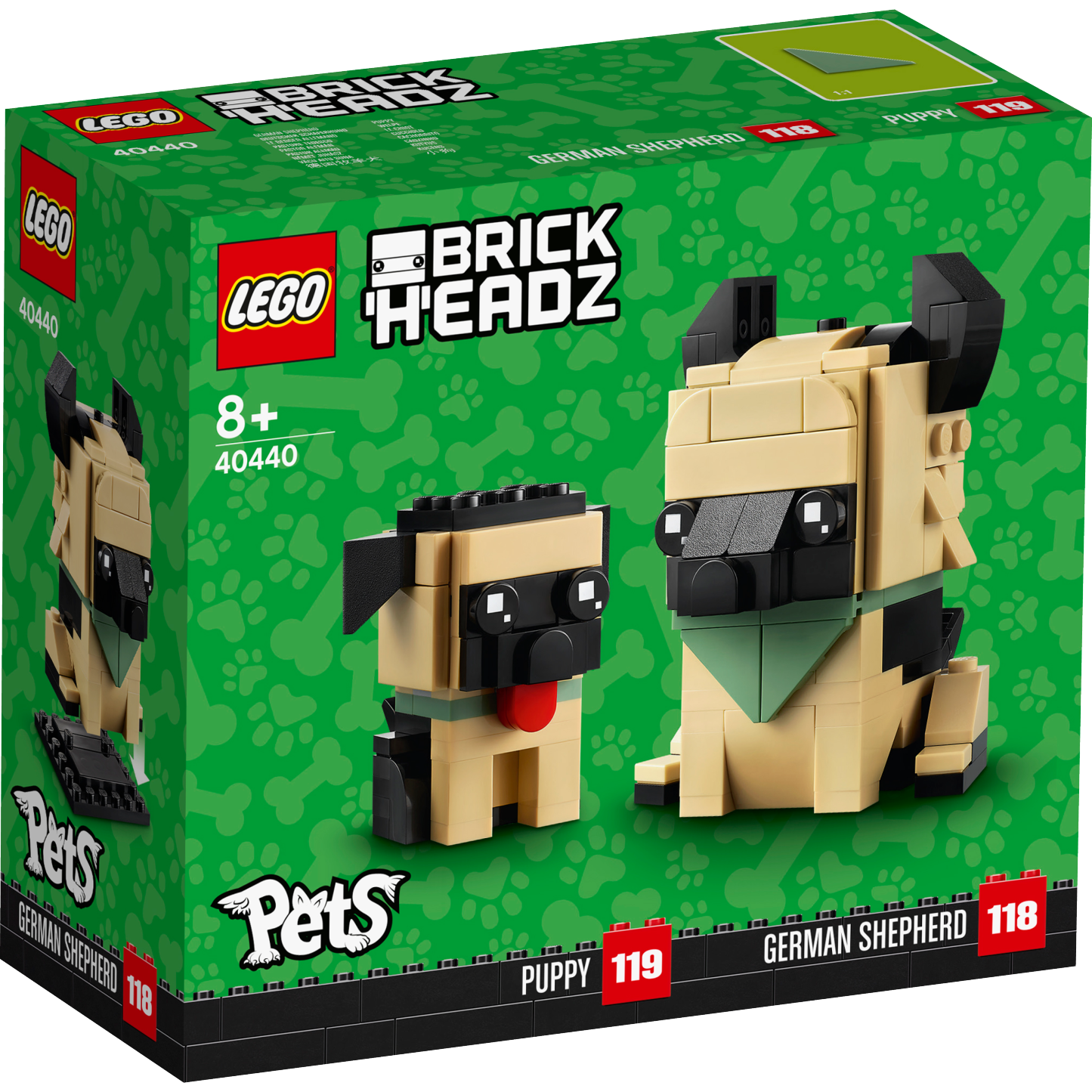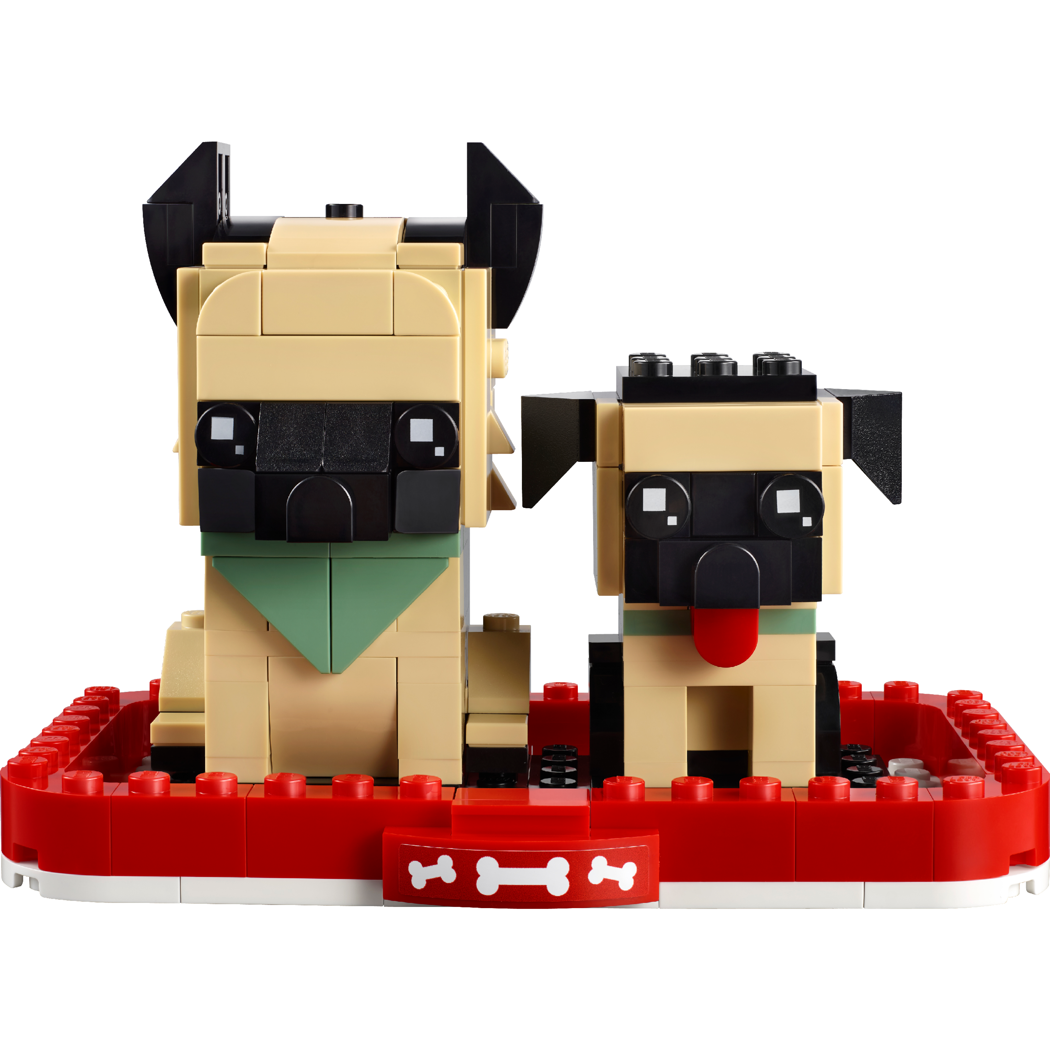 - Collectible construction set featuring fun LEGO® BrickHeadz™ models of a German shepherd dog and a puppy sitting together in a basket.