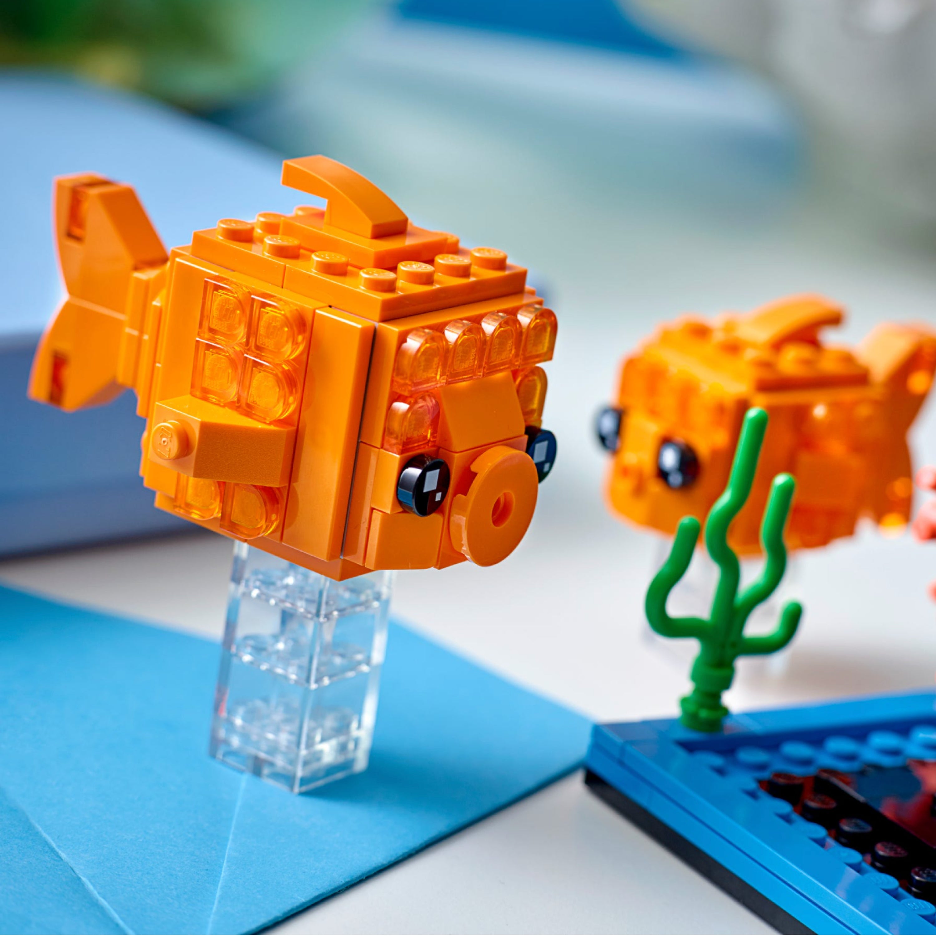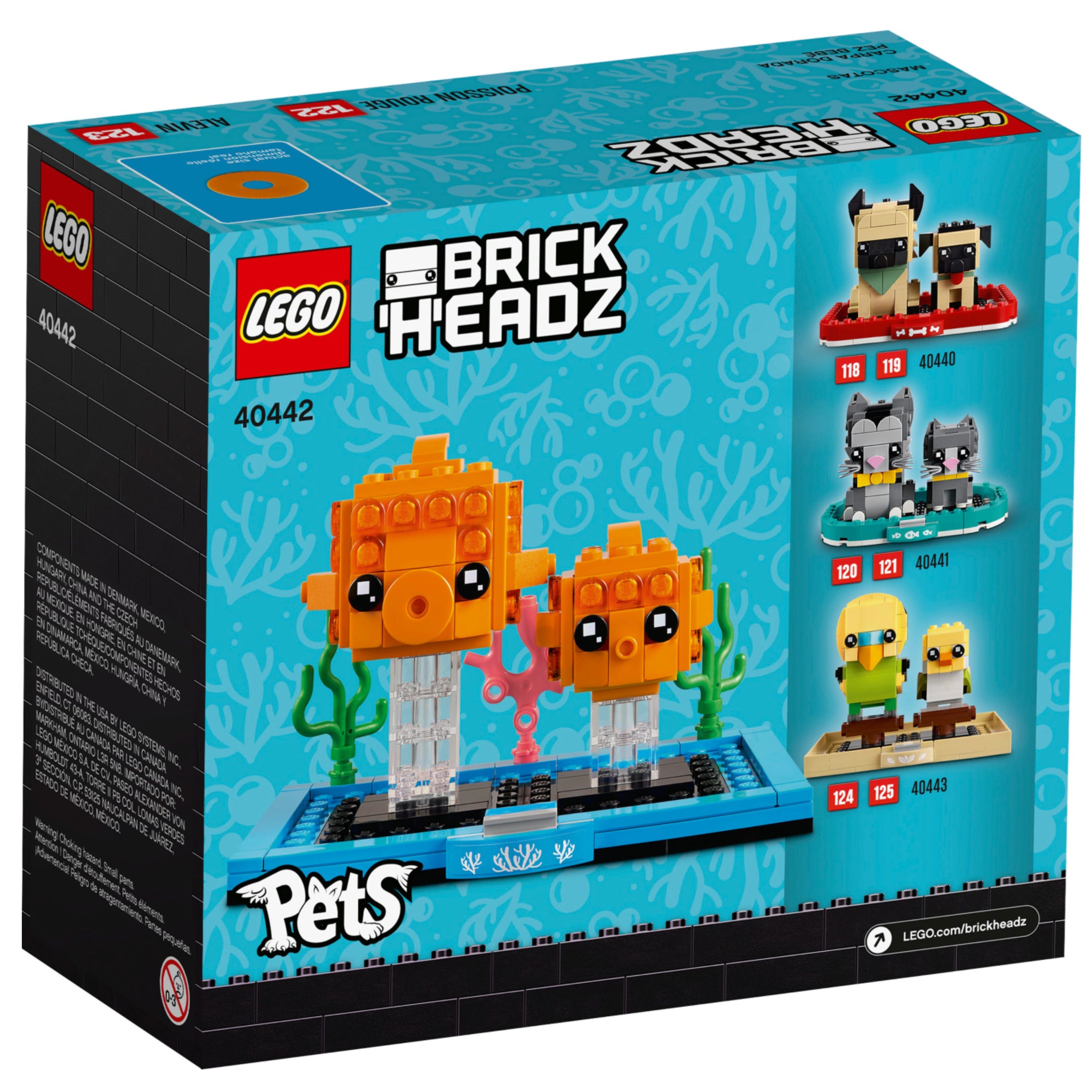 - Collectible construction set featuring fun LEGO® BrickHeadz™ models of a goldfish and fry together in a water environment.