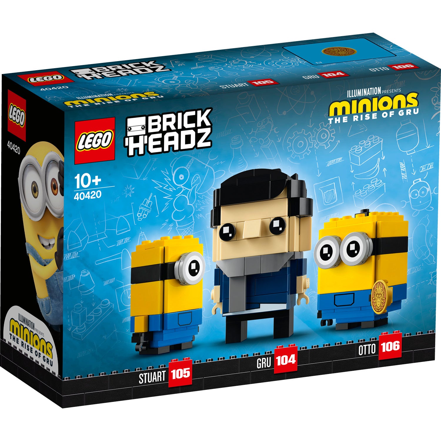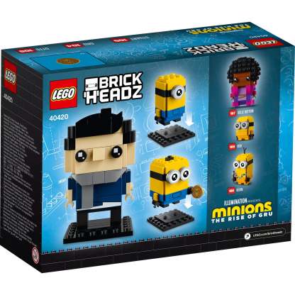 LEGO® BrickHeadz™ Gru, Stuart and Otto (40420) features 3 characters from the Minions movie: Gru, Minion Stuart and Minion Otto with a zodiac stone. They are all part of the LEGO BrickHeadz collection and come with their own character ID and a sturdy baseplate for easy display, either individually, as a group or alongside other BrickHeadz models.
