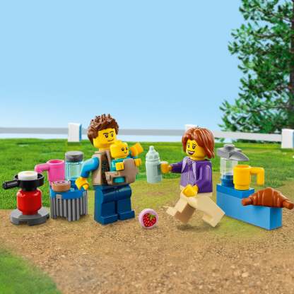 - Accessories include a cool baby carrier for the minifigures, camping stove and pan, plus fried egg and croissant food elements.