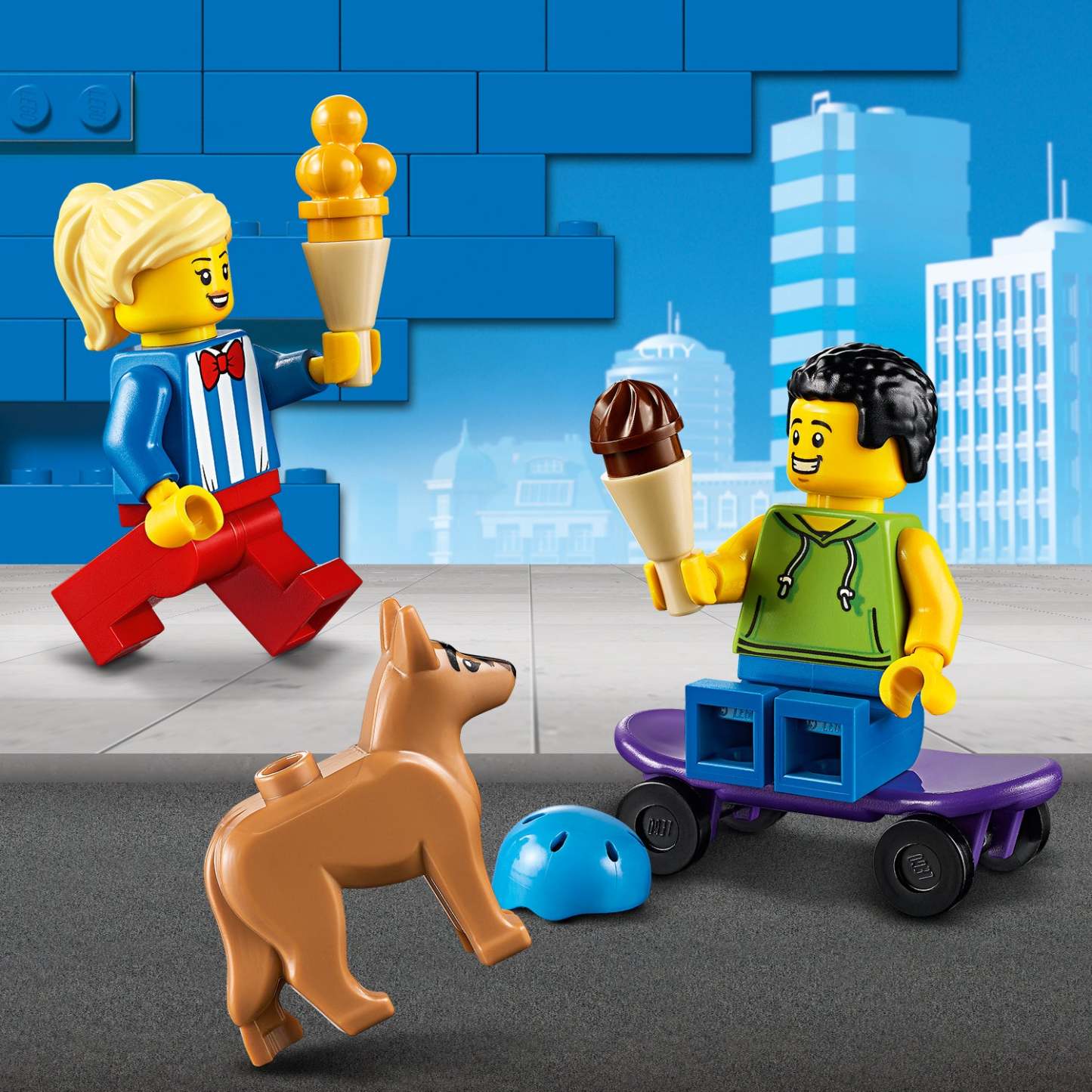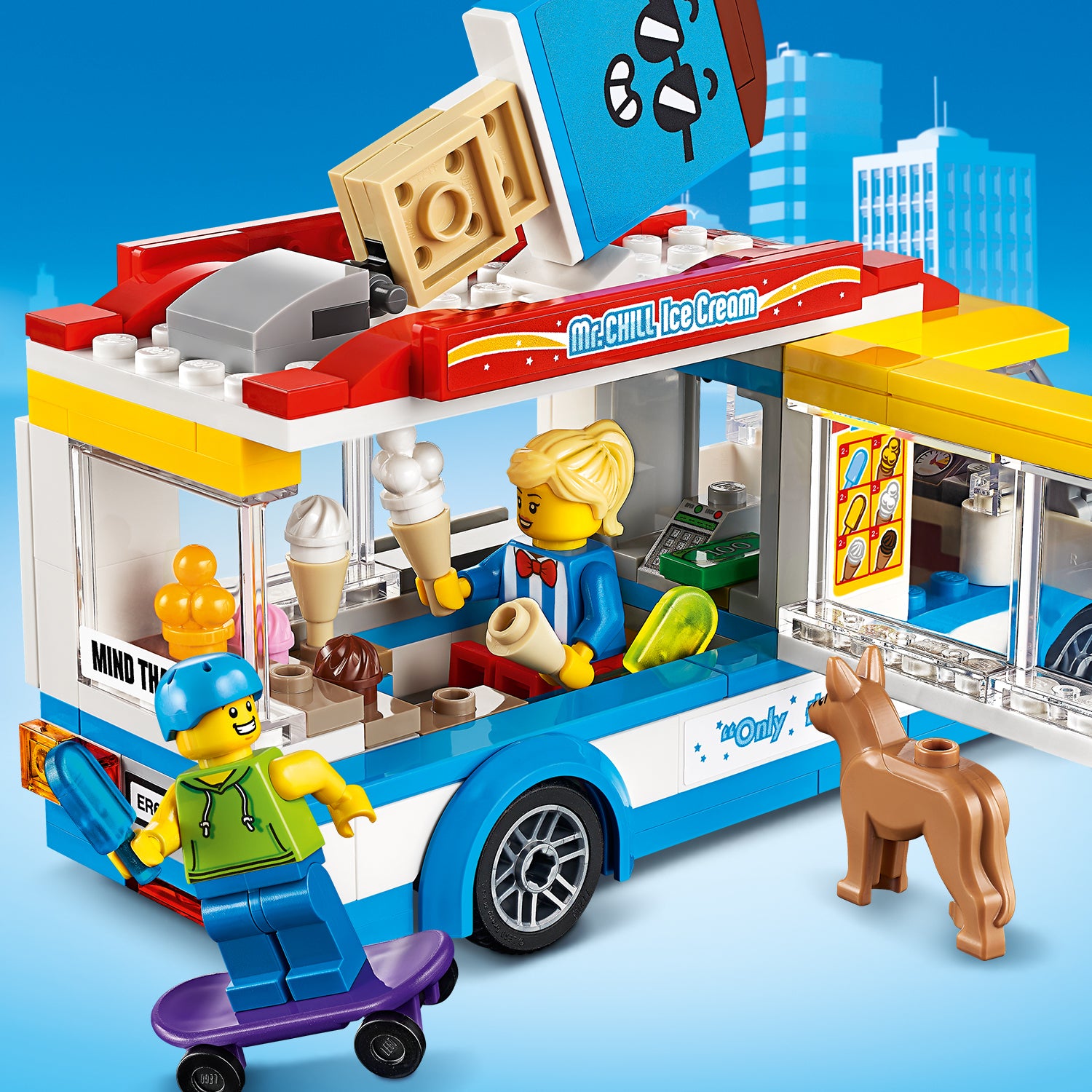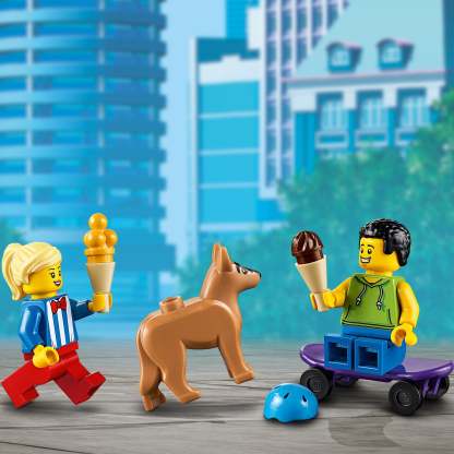 - Building set for kids featuring a brightly coloured ice-cream truck with ice-cream lady and skateboarder minifigures, plus a dog figure. Perfect for imaginative, independent play.
