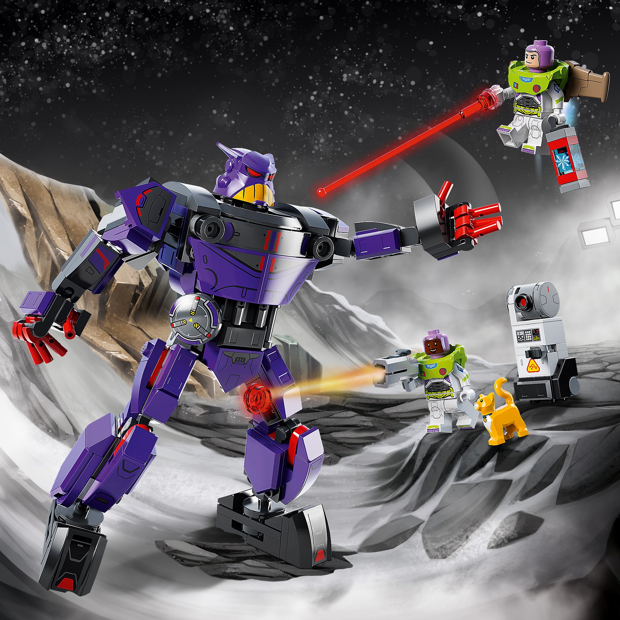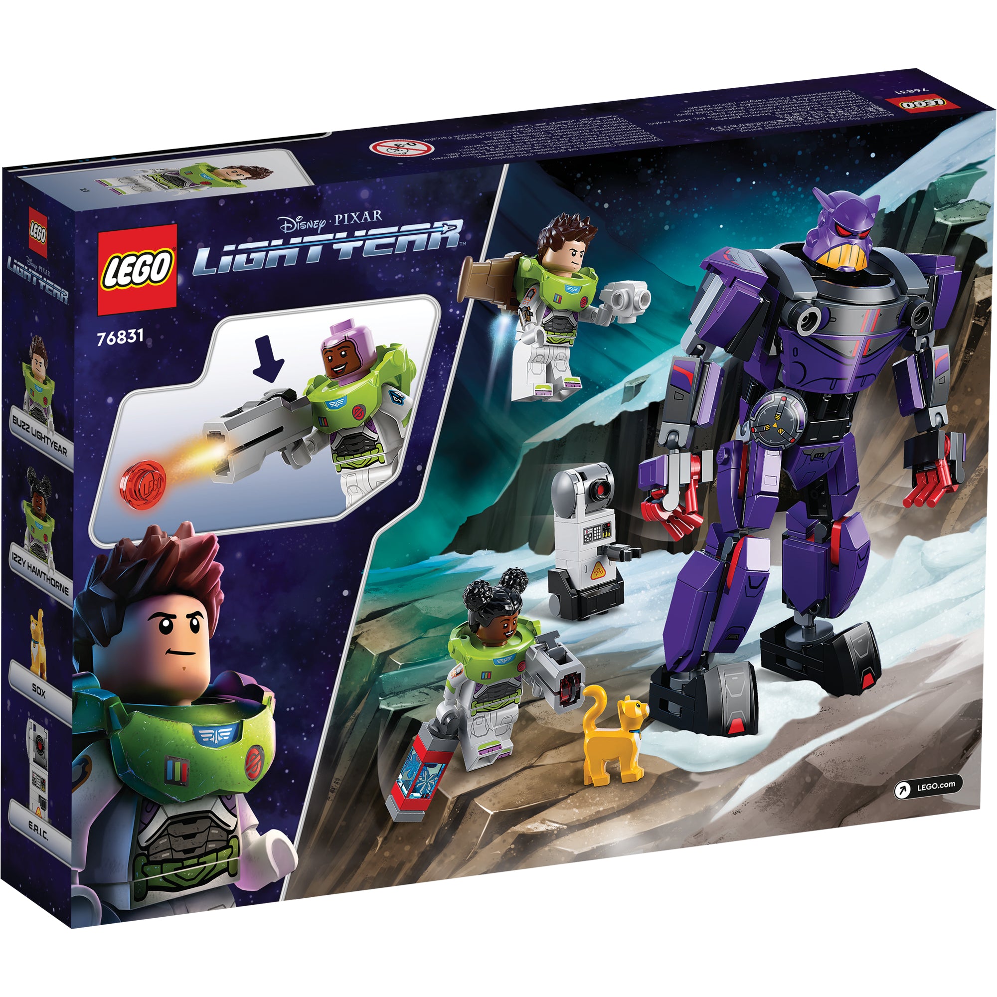 - Characters from the film – Zurg Battle (76831) comes with 2 minifigures, including Disney’s Buzz Lightyear, a LEGO® robot cat figure, a buildable robot and a posable mech