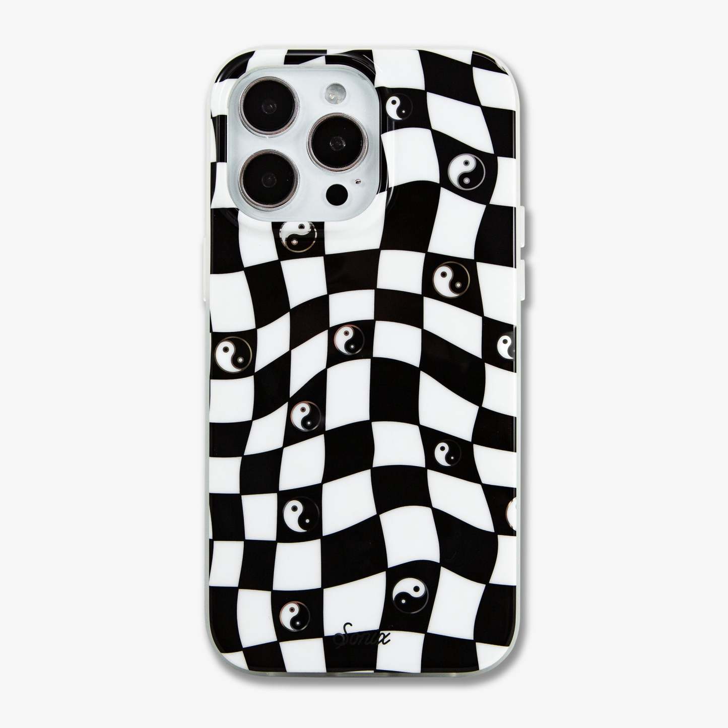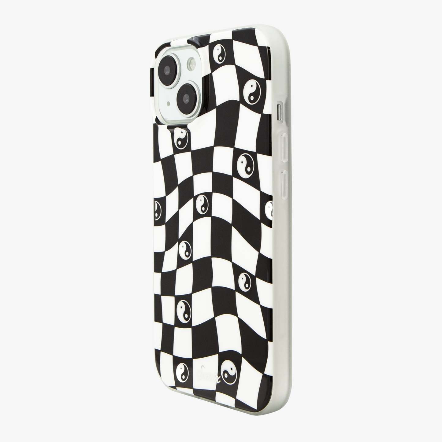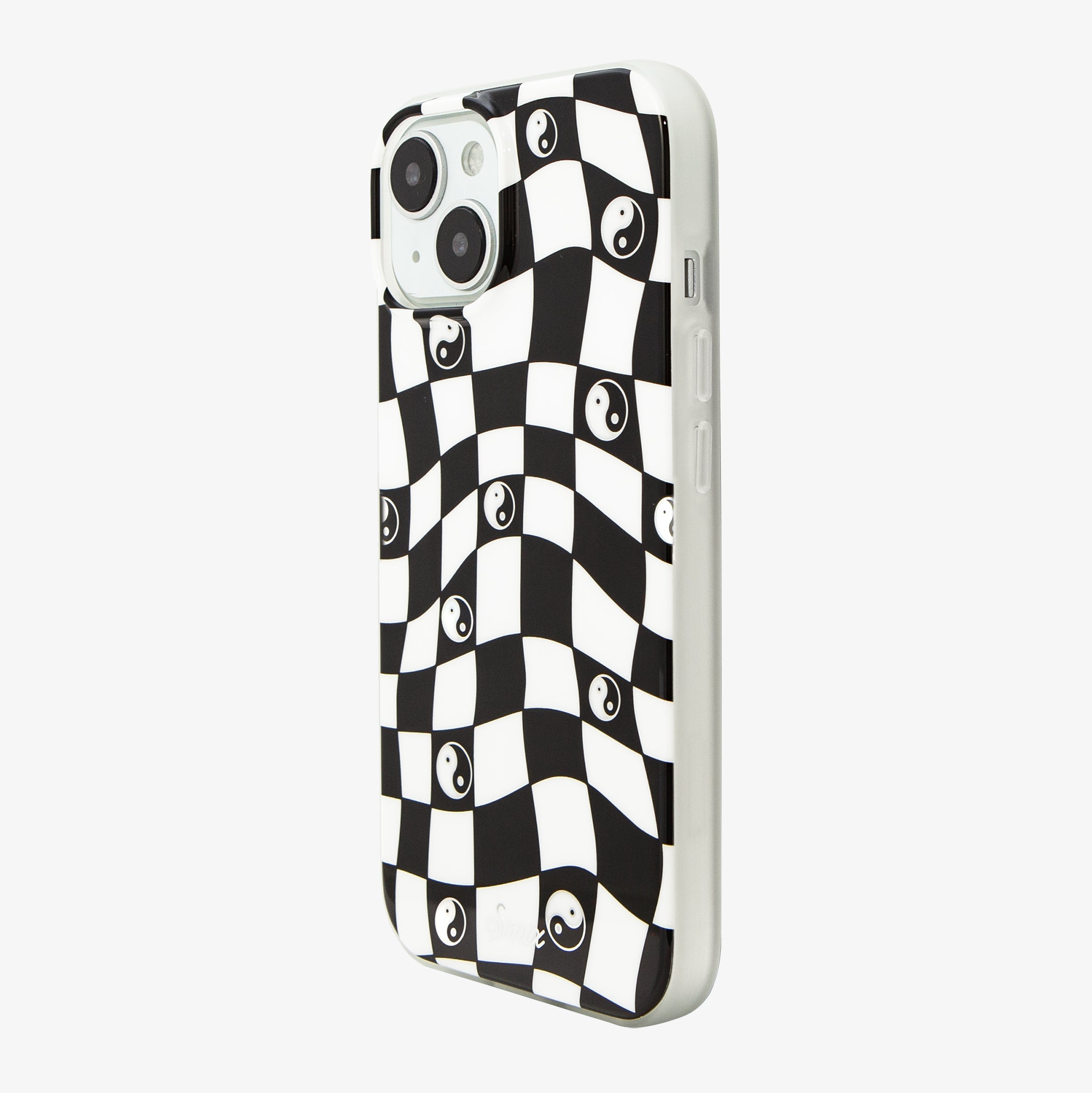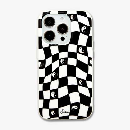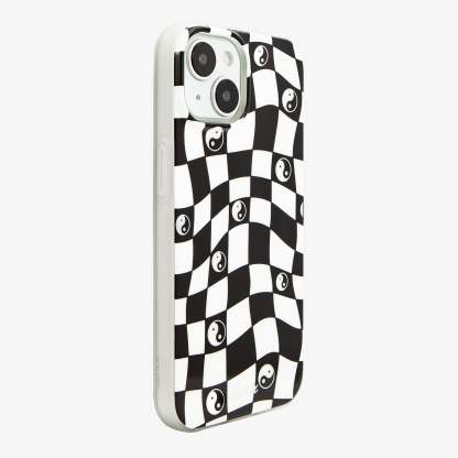 Our Yin Yang MagSafe Compatible iPhone Case features a classic black and white checkerboard fashioned in a warped design, a nod to the three-dimensional movement of time. The Yin and Yang symbol floats across the board, reminding us of the balance we carry with us as we move through every day. A bit of silver sparkle?adds an element of fun to the dark spaces.
