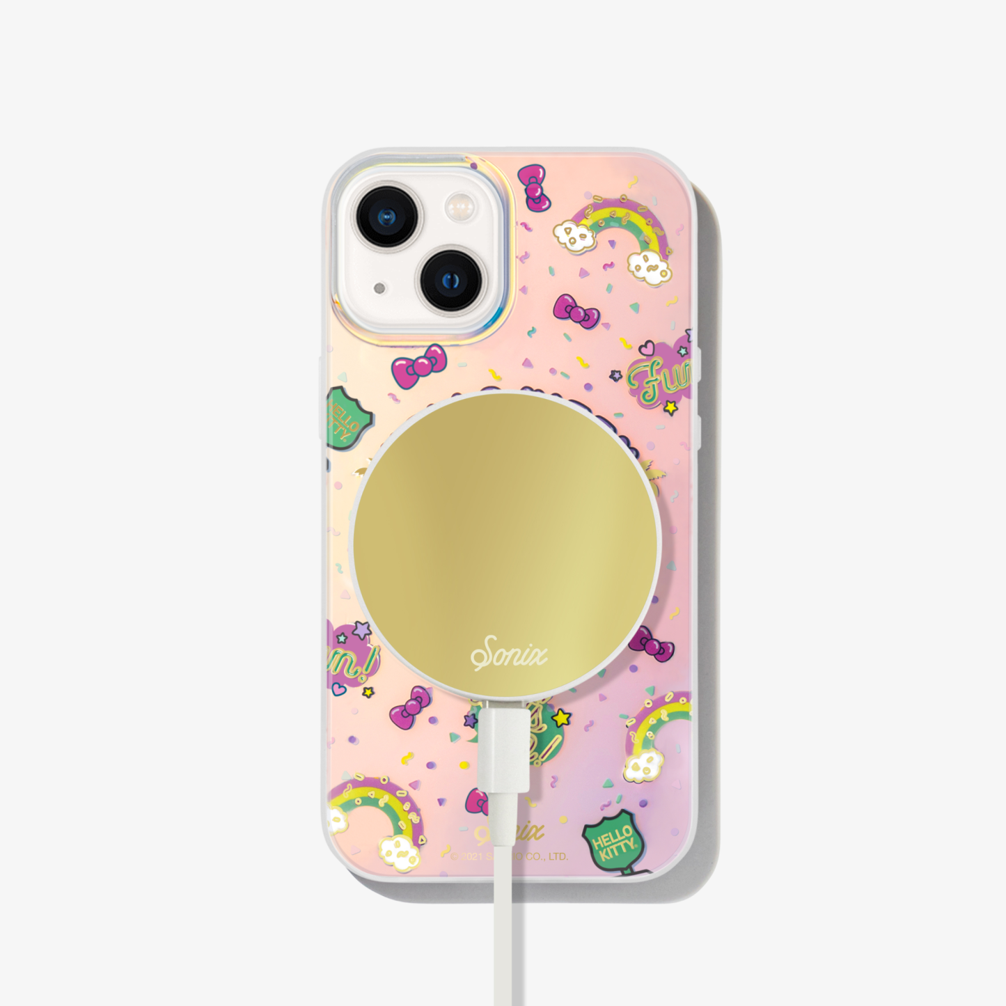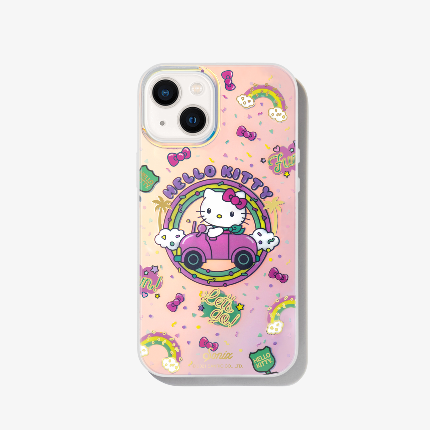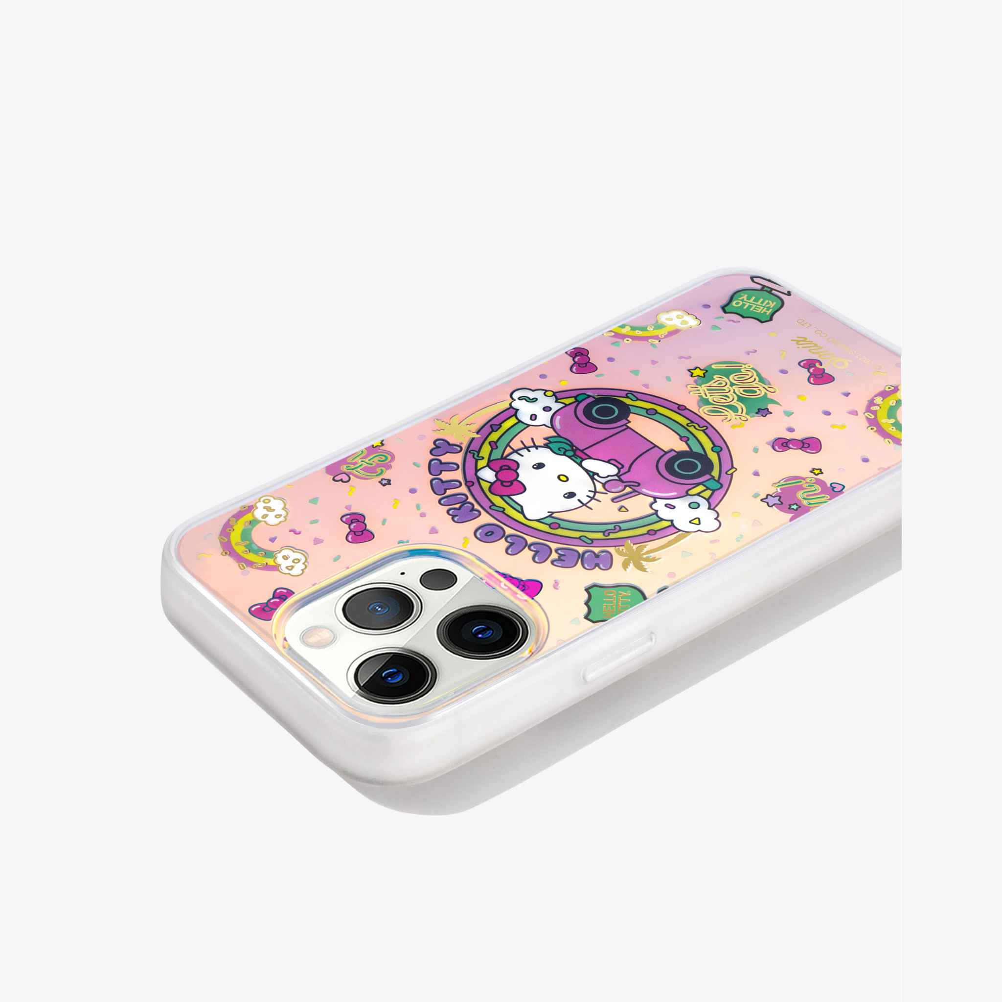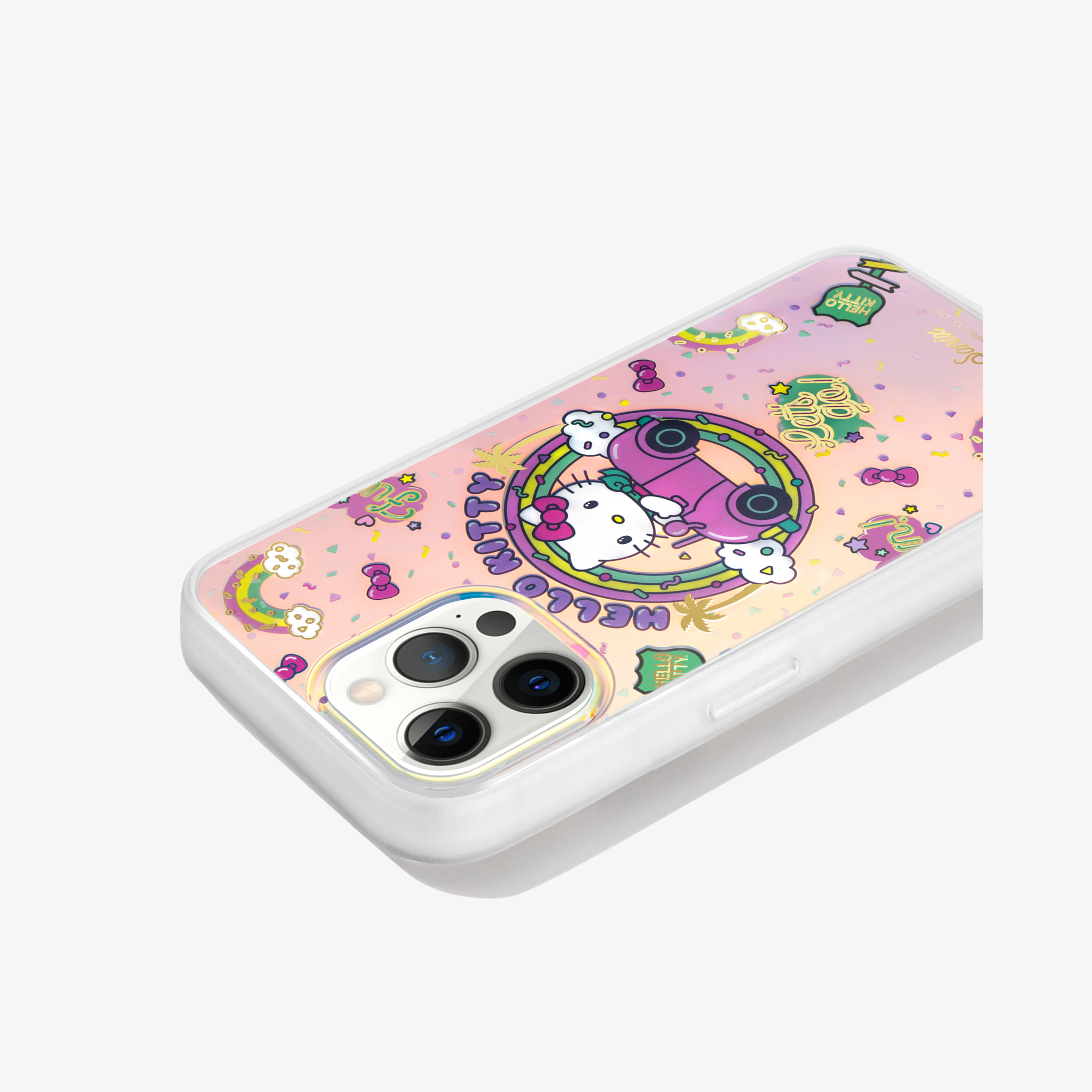 Cruisin�� Hello Kitty, MagSafe® Compatible iPhone case is an iridescent case featuring rainbows, palm trees, and Hello Kitty in her sweet new ride - ready for every adventure!
