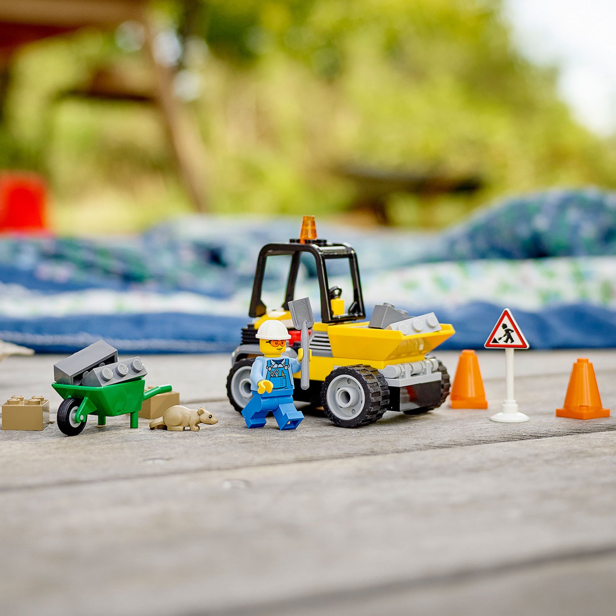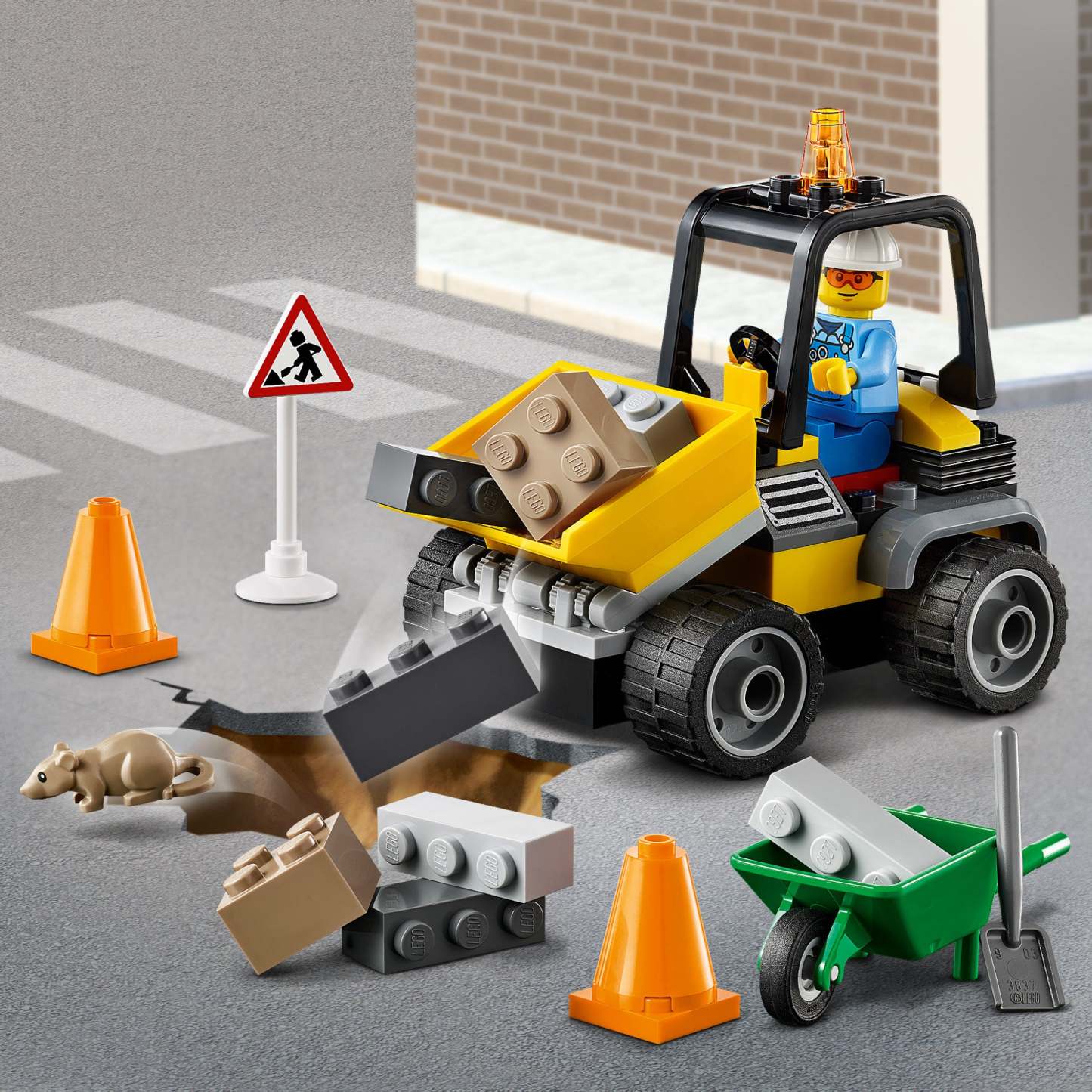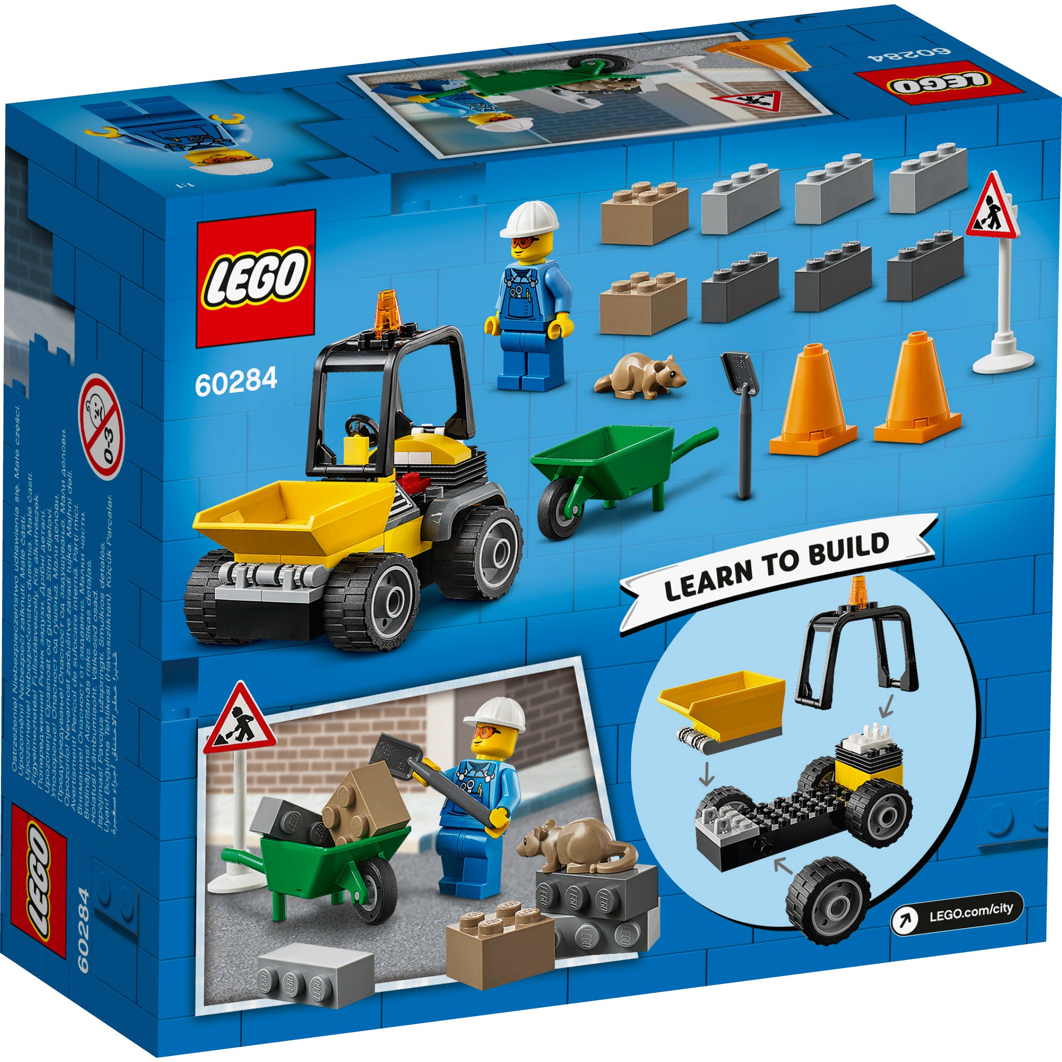 - This LEGO® City Roadwork Truck (60284) playset includes a front-end loader, wheelbarrow, traffic cones, roadworks sign and a shovel, plus a worker minifigure and rat figure.
