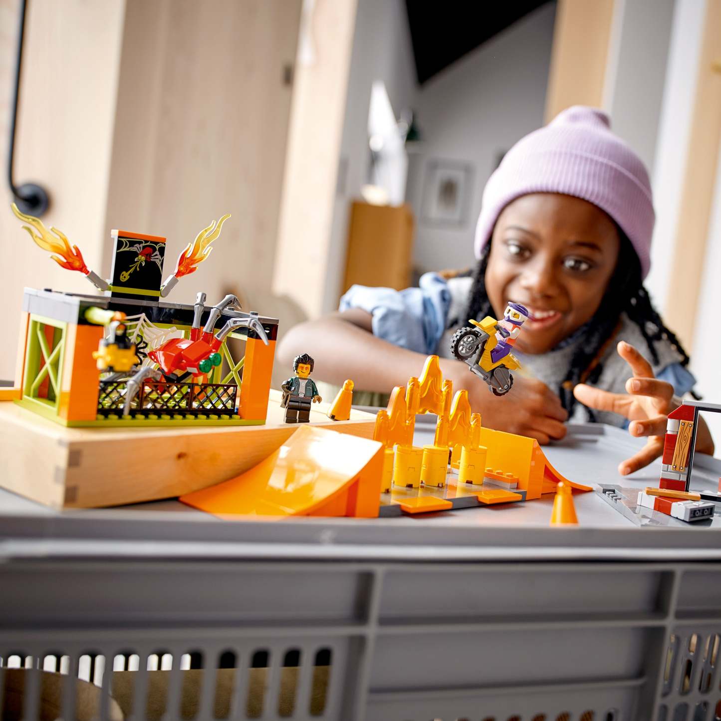 - What’s in the box? All kids need to build a modular toy stunt park with 2 launch ramps, obstacles, fire, spider cage and a flywheel-powered stunt bike, plus a LEGO® City TV Tread Octane minifigure.