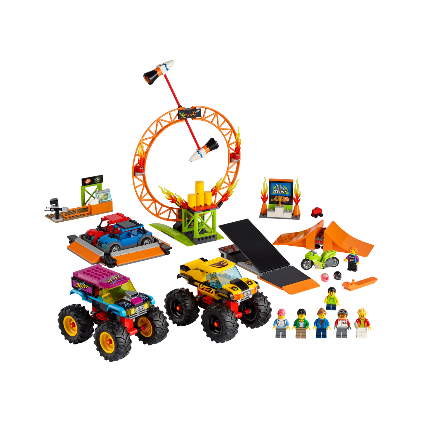 - What’s in the box? All kids need to build 2 monster trucks, 2 cars with collapsible roofs, a ring of fire, launch ramps, flywheel-powered stunt bike, hotdog stand, podium, 6 minifigures and more.