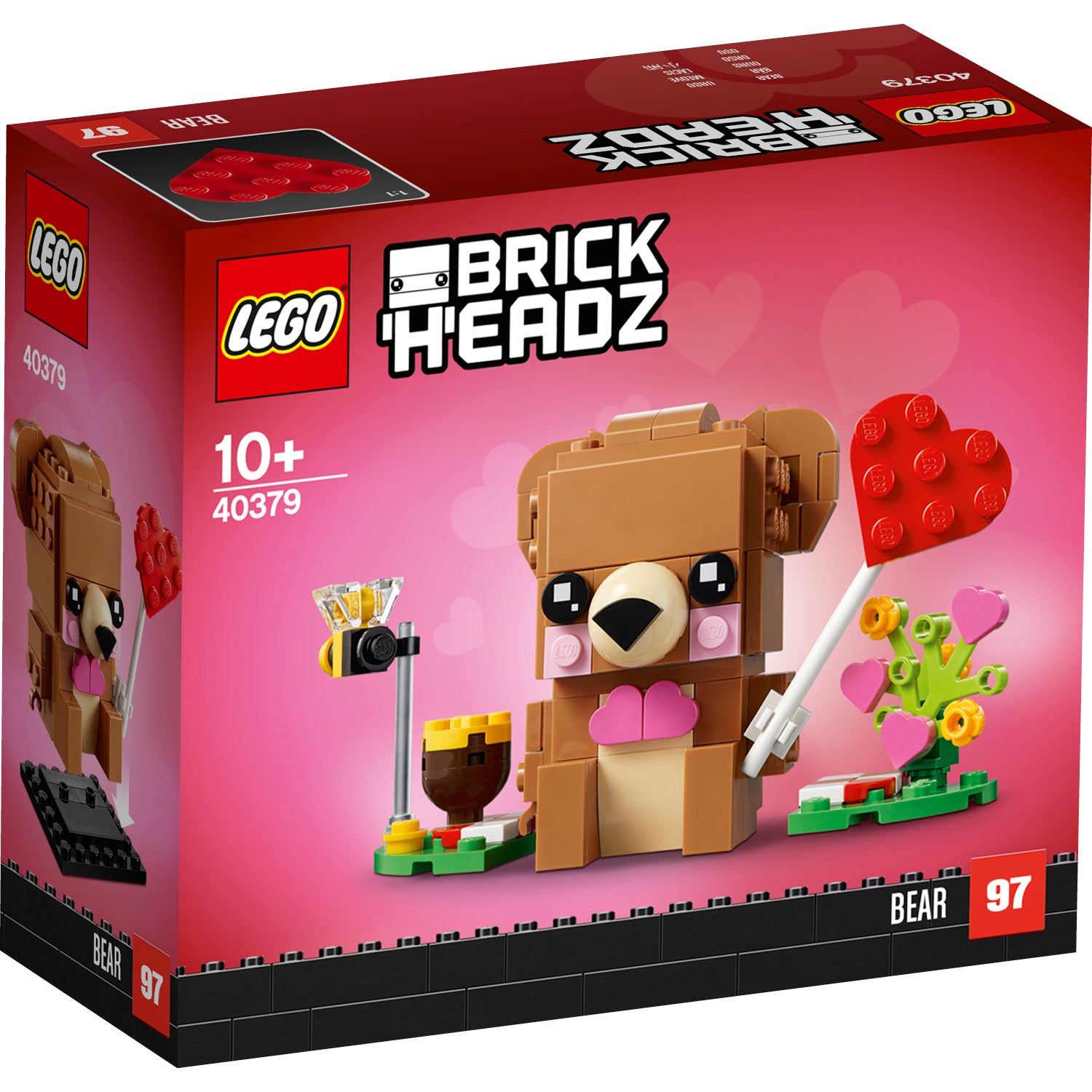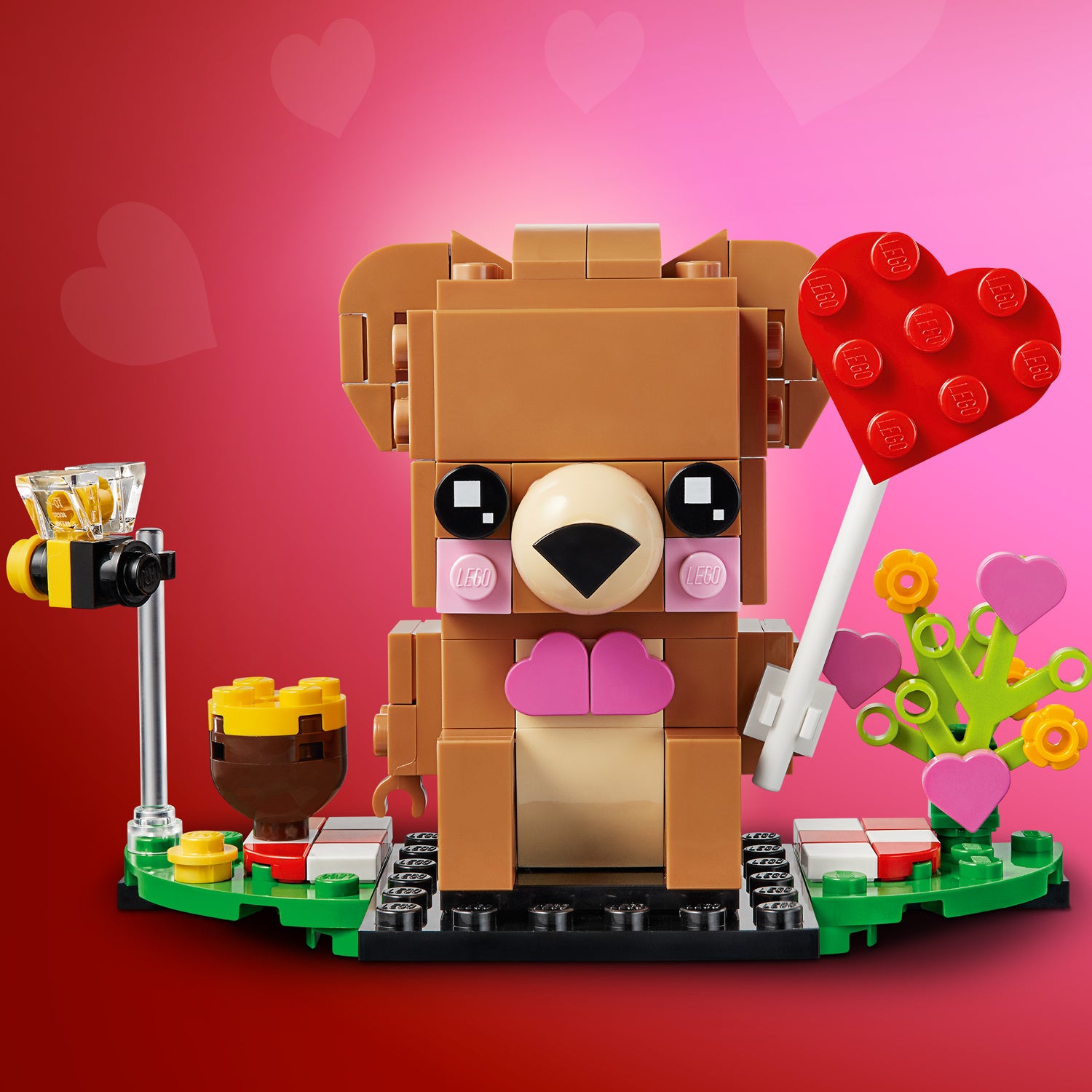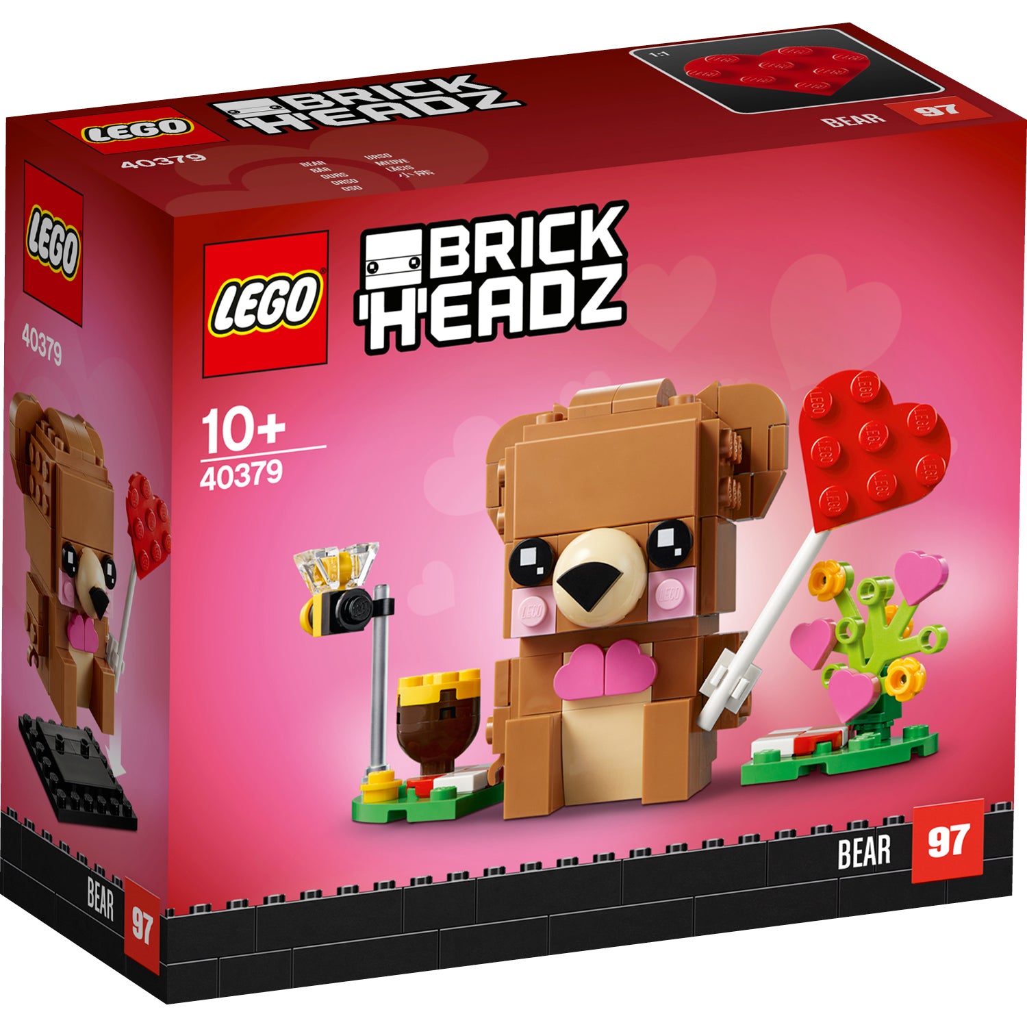 - This collectible LEGO® BrickHeadz™ buildable model of a cute brown bear holding a large red heart, sits on a picnic blanket together with his little bee friend, a honey jar and colorful flowers.