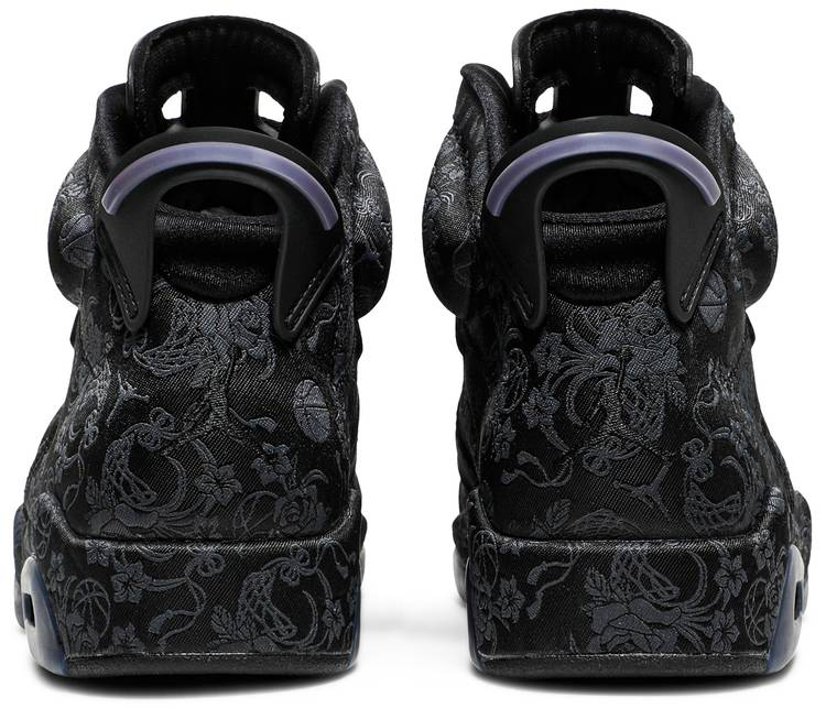 The women’s Air 6 Retro. enlivened with a tonal floral and basketball print throughout the textile upper and midsole. The sneaker’s lone contrasting pop of color lands atop the tongue . where a metallic gold Jumpman hangs from a burgundy woven lace shield. Standard Air 6 details remain intact . including a spoiler-like heel tab and visible Air sole cushioning.