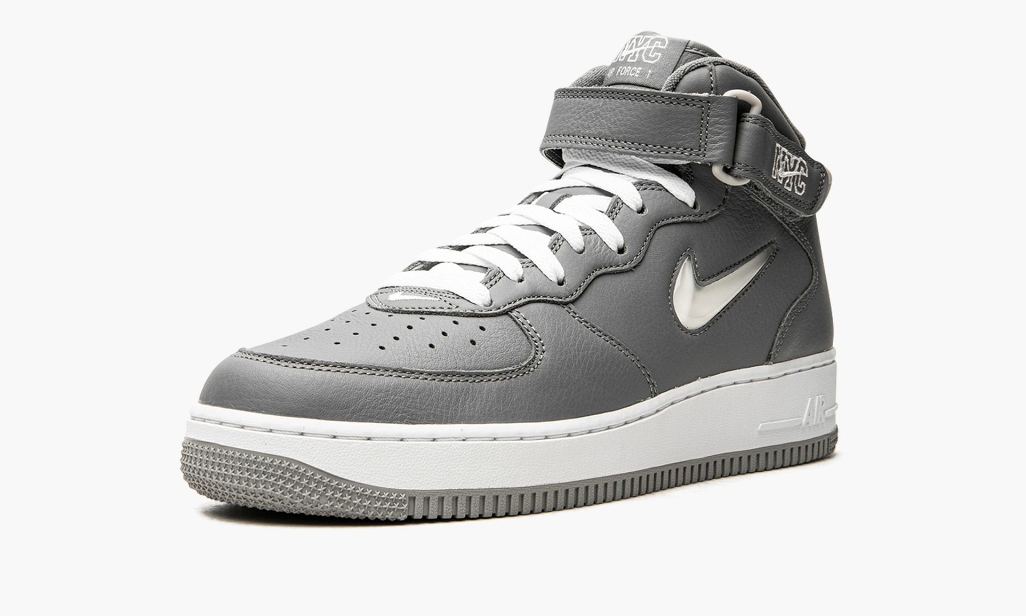 The Mid Jewel “NYC – Cool Grey is a Fall 2021 release by that honors New York City’s fondness for the retro basketball shoe with unique branding. The ever-popular “Cool Grey theme that notably appeared on the 11 back in 2001 is the color of choice for the leather used on the shoe’s upper. The design’s lifestyle aesthetic is enhanced with a milky, jeweled Swoosh on the sides and graffiti-inspired “NYC embroidery on the adjustable ankle strap. Additional “NYC branding is printed on the nylon tongue tag alongside old school “Air detailing. A small white Swoosh is stitched onto the toe. The Mid Jewel “NYC – Cool Grey is inspired by classic Mid releases from the mid-to-late shoes that honored New York City. Release date: November 1, 2021