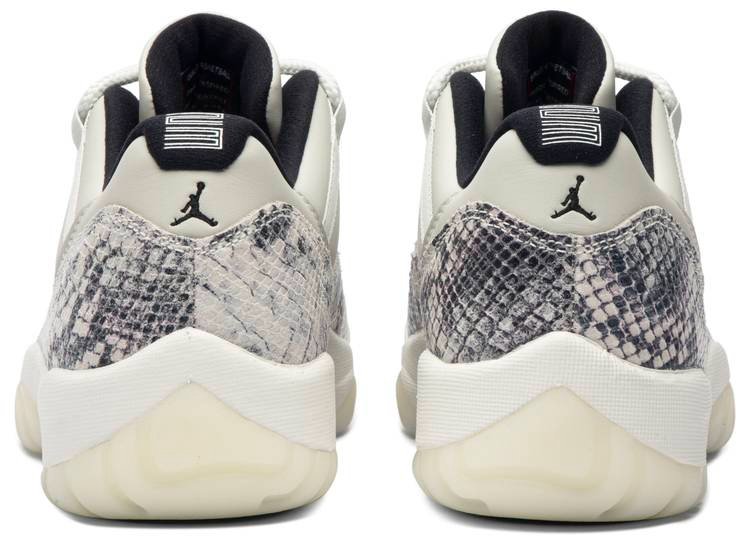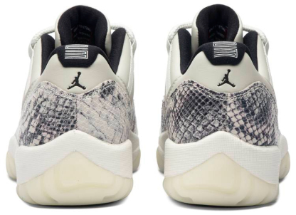 The 11 Retro Low's iconic identity was founded when Michael returned to the game in 1995. Surfacing in June 2019 . this 'Light Bone Snakeskin' variant reaffirms the classic's allure with a contemporary snakeskin print on the leather upper's mudguard. Rope laces winding through the lateral webbing customize fit. Signature Jumpman insignias are positioned on the tongue and heel. A translucent rubber outsole and carbon fiber plate form the base.