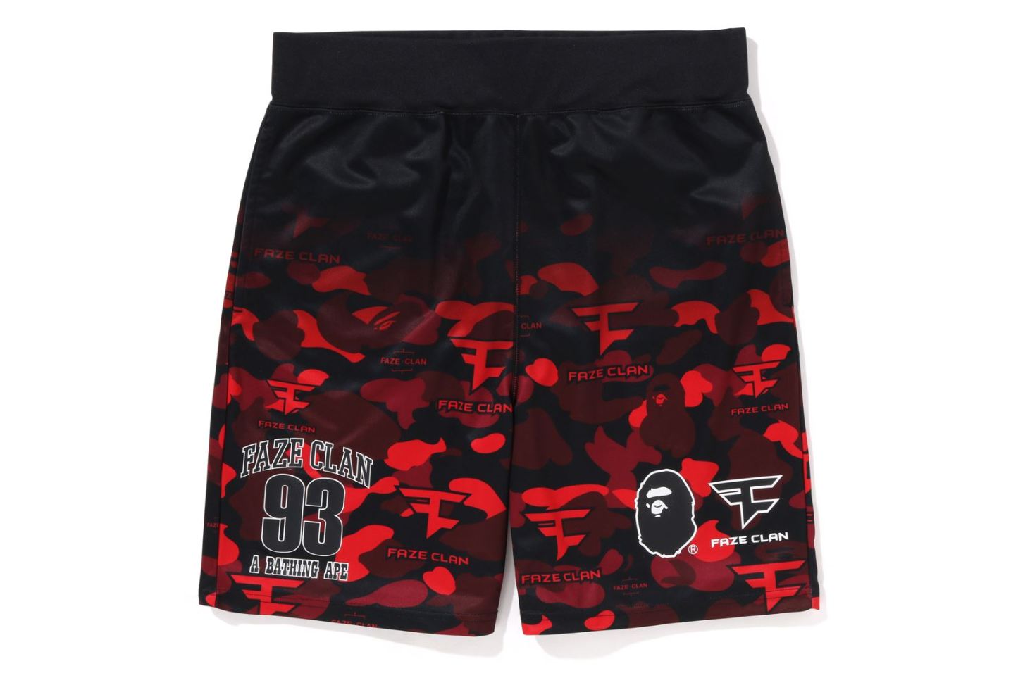 Game shorts made of polyester material with a red and black COLOR CAMO pattern expressed with the FAZE CLAN logo. A design with the APE HEAD/FAZE CLAN logo on the right hem of the front, the number 93 and brand name on the left hem, and the brand name printed in rubber on the right back hem. Slash pockets on both sides of the body, and a patch pocket with a piss name on the right back. A rubber spindle is attached to the waist for easy size adjustment. Available in 1 color and 5 sizes. Collaboration model with media platform FAZE CLAN.