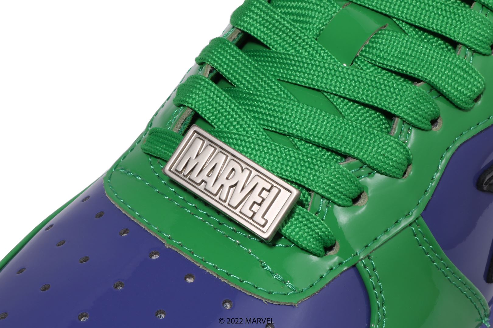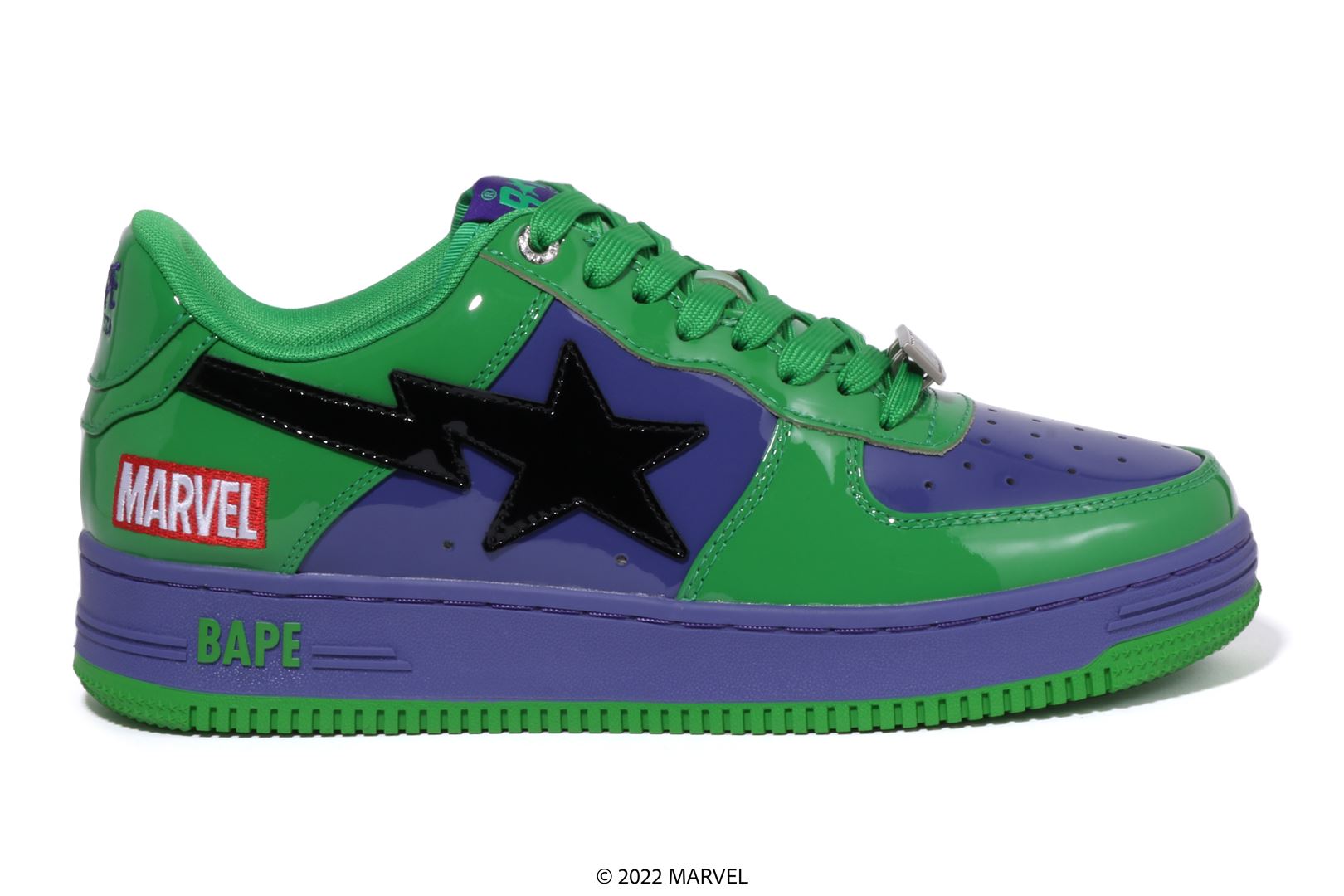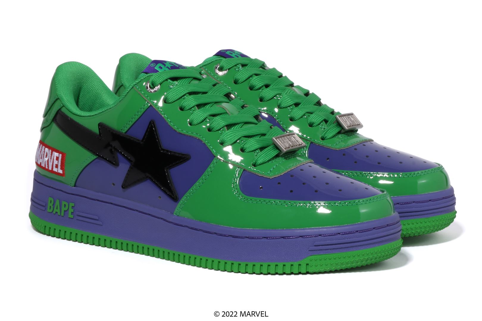BAthtPE STA with patent leather upper. A reprint model of the 25-06 Marvel Comics collaboration. The Hulk character is printed on the side of the left heel, and the outline is embossed. Marvel logo embroidery on the right heel. The blister pack packaging has also been revived, and the mount has been significantly updated. The insole has the same design as the mount, and the lace is also equipped with a dubrae limited to this collaboration. Available in 1 color and 9 sizes: 7, 8, 8.5, 9, 9.5, 10, 11, 12, and 13. A collaboration model with Marvel Comics.