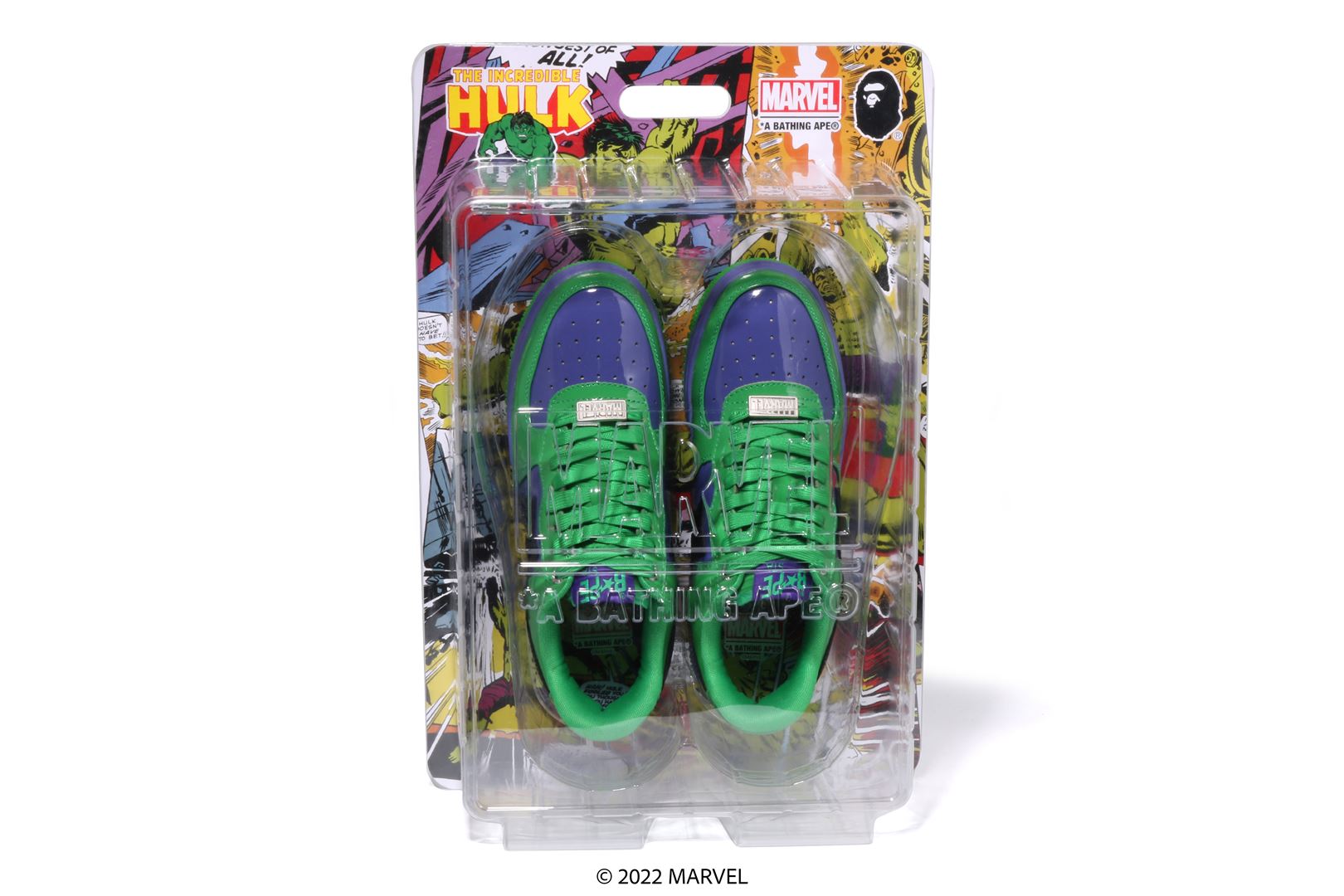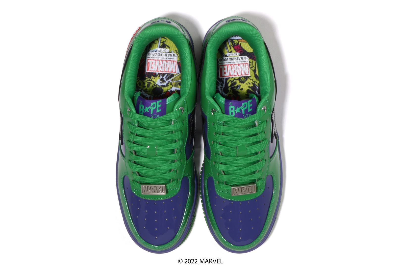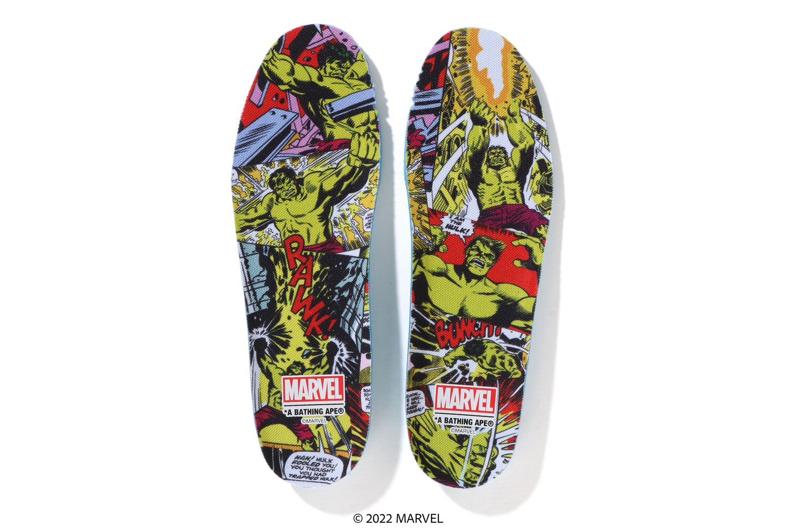 BAthtPE STA with patent leather upper. A reprint model of the 25-06 Marvel Comics collaboration. The Hulk character is printed on the side of the left heel, and the outline is embossed. Marvel logo embroidery on the right heel. The blister pack packaging has also been revived, and the mount has been significantly updated. The insole has the same design as the mount, and the lace is also equipped with a dubrae limited to this collaboration. Available in 1 color and 9 sizes: 7, 8, 8.5, 9, 9.5, 10, 11, 12, and 13. A collaboration model with Marvel Comics.