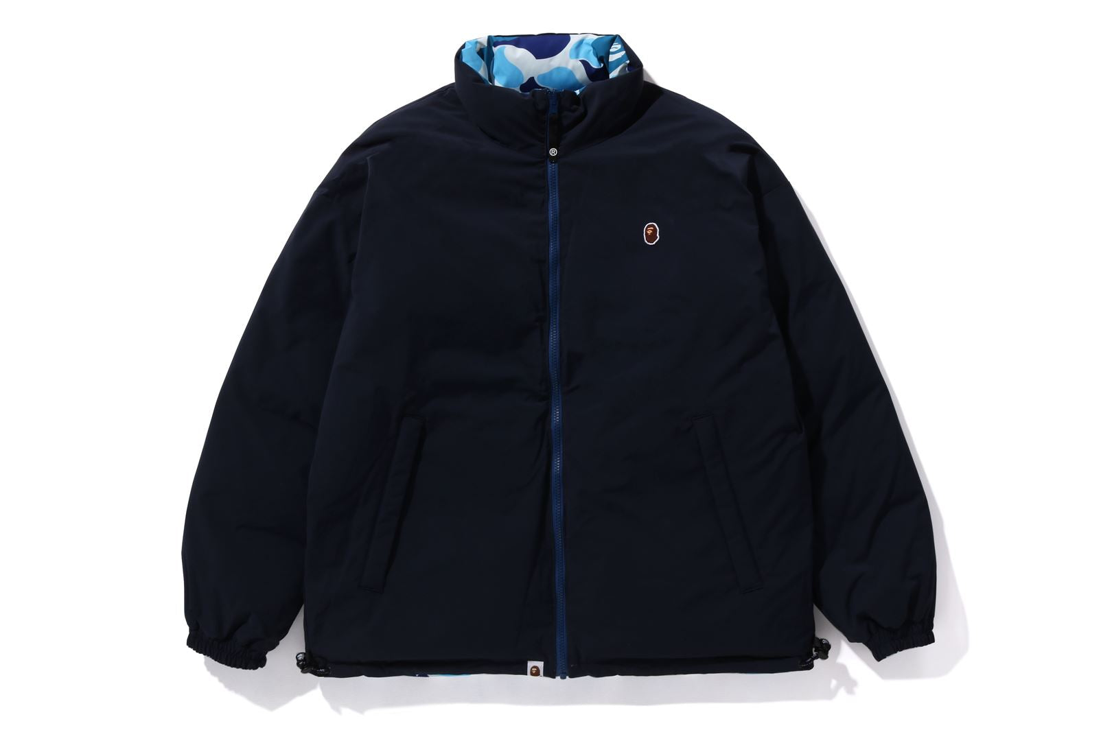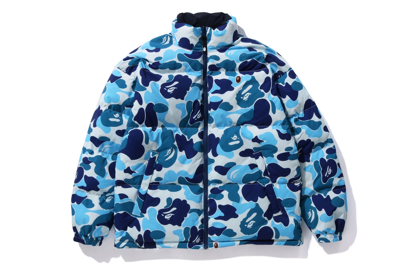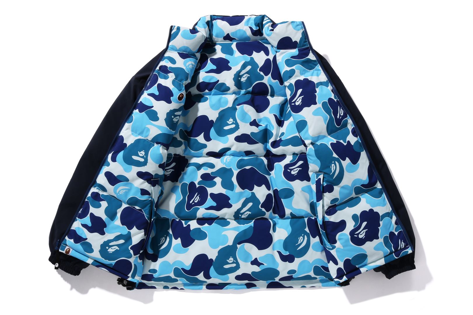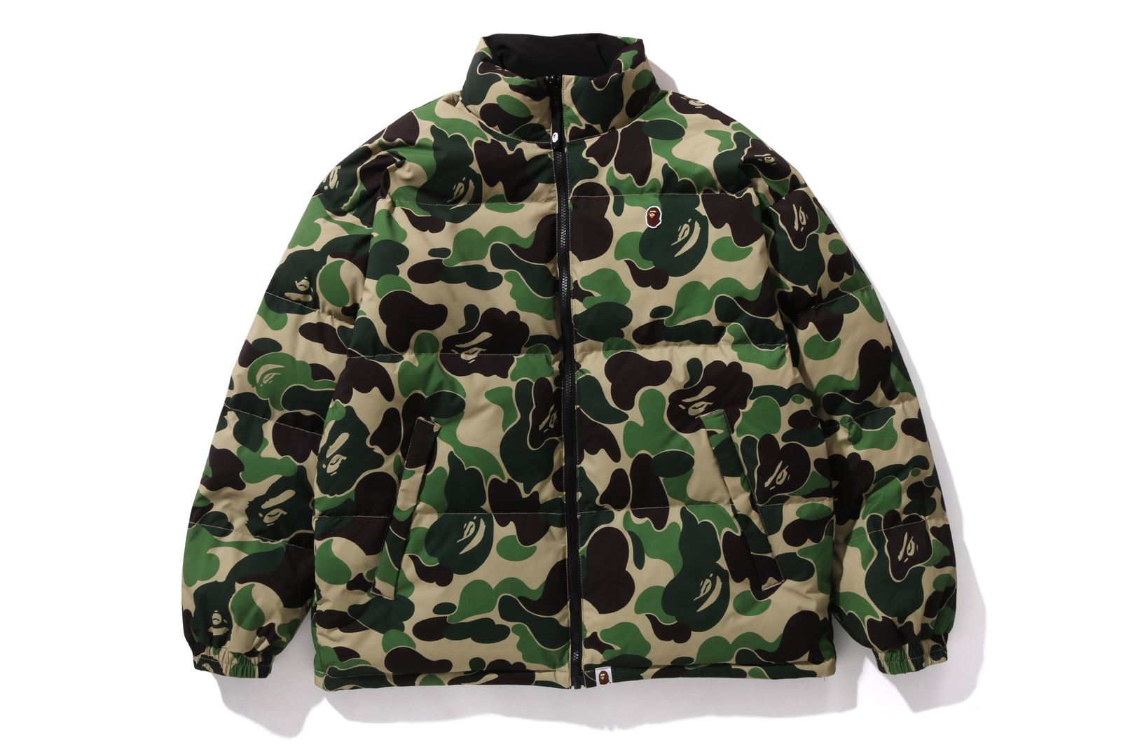 A reversible puffer down jacket with ABC CAMO all-over pattern polyester material on the A side and solid color polyester material on the B side. The padding uses KAWADA DOWN from Kawada Feather (90% down, 10% feather, 700FP) for high cold protection. The APE HEAD one-point emblem is affixed to the left chest, and the piss name is tucked in the center of the hem. Designed with slash pockets with snaps on both hips, Velcro on both sleeves, and rubber spindles on both hems. A silhouette with ample width. Available in 4 colors and 5 sizes.