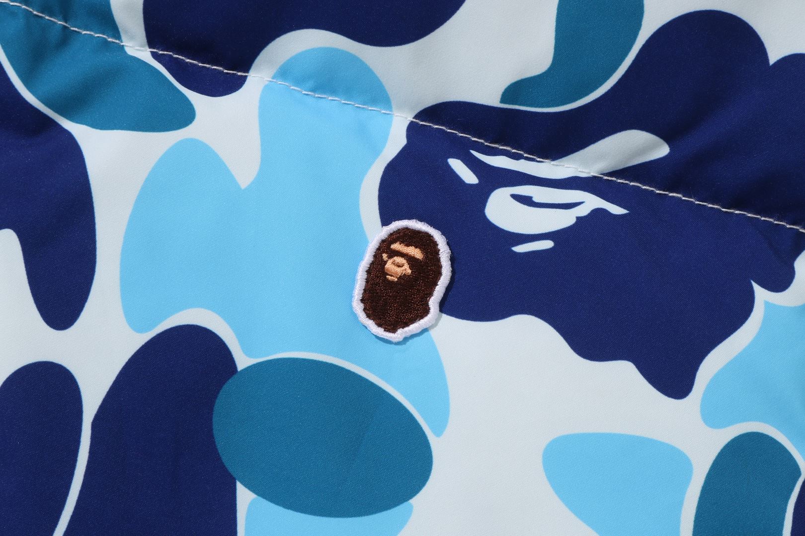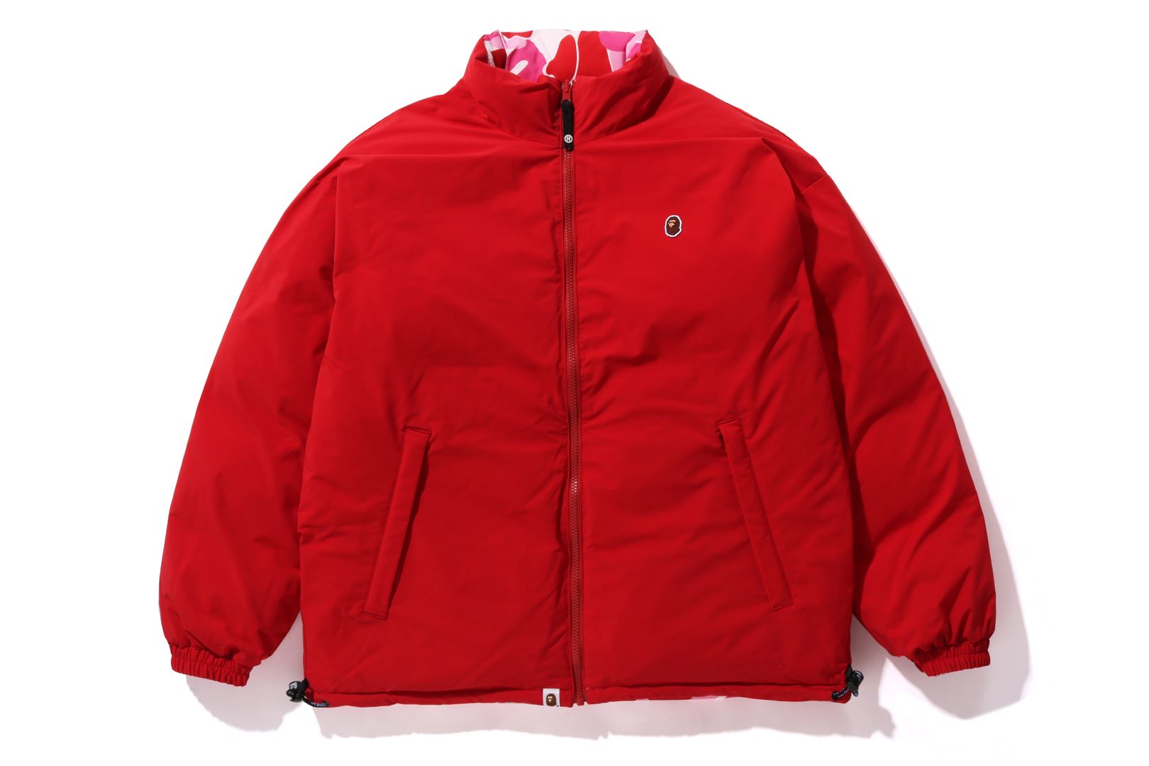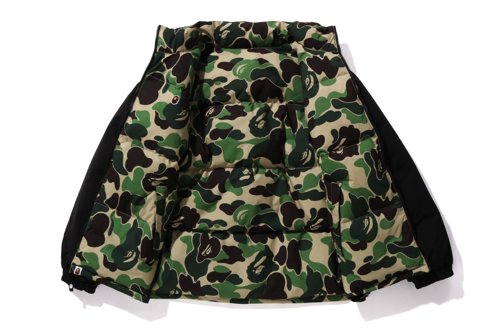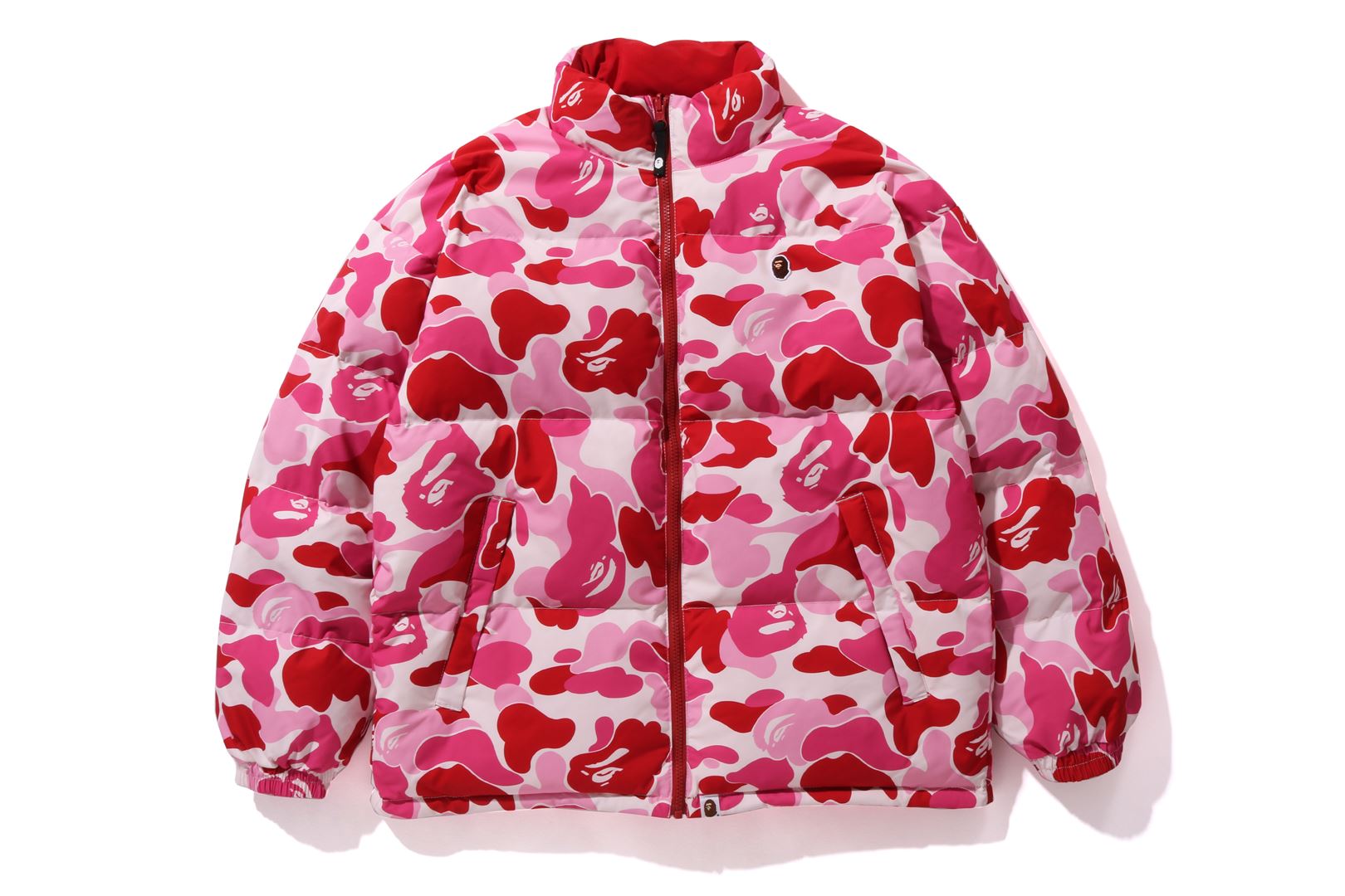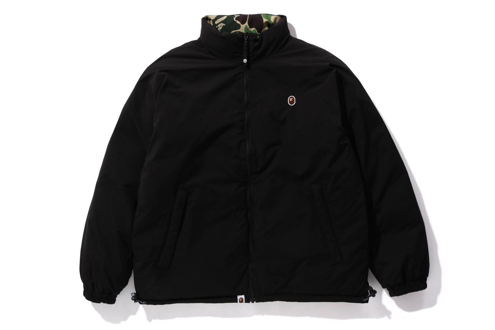 A reversible puffer down jacket with ABC CAMO all-over pattern polyester material on the A side and solid color polyester material on the B side. The padding uses KAWADA DOWN from Kawada Feather (90% down, 10% feather, 700FP) for high cold protection. The APE HEAD one-point emblem is affixed to the left chest, and the piss name is tucked in the center of the hem. Designed with slash pockets with snaps on both hips, Velcro on both sleeves, and rubber spindles on both hems. A silhouette with ample width. Available in 4 colors and 5 sizes.
