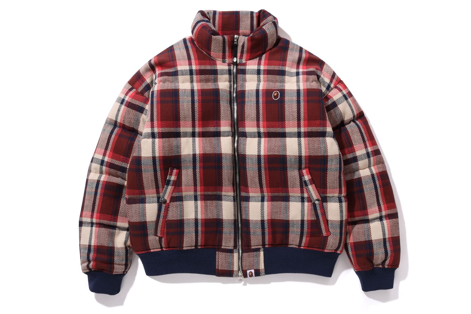A puffer down jacket made of CHECK pattern cotton material with little brushing. The padding uses KAWADA DOWN from Kawada Feather (90% down, 10% feather, 700FP) for high cold protection. APE HEAD/BAthtPE logo is rubber printed on the left chest, and a piss name is tucked in the center of the hem. Slash pockets with snaps on both hips, elastic ribs on both sleeves and hem. A silhouette with a relaxed fit. Available in 2 colors and 5 sizes.