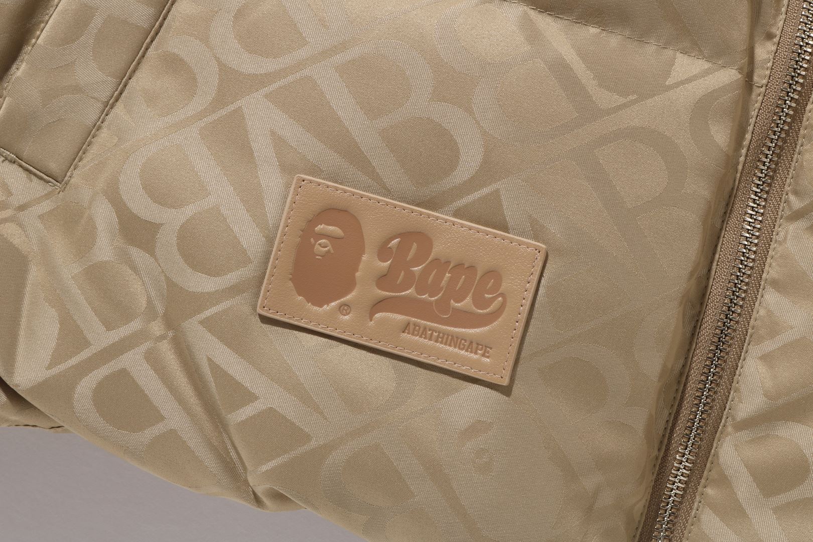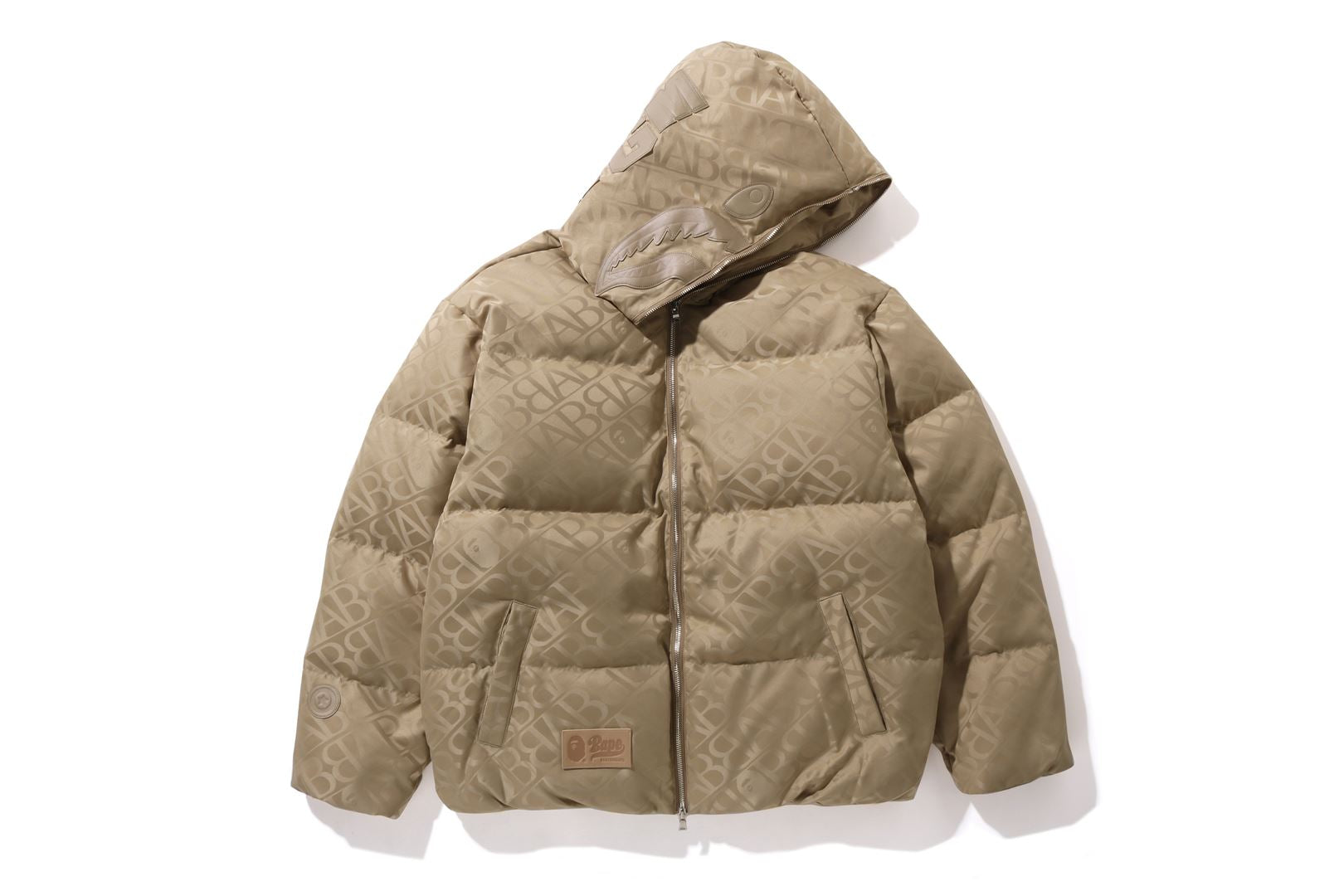 A puffer down jacket made of nylon material with an all-over monogram pattern. The padding uses KAWADA DOWN from Kawada Feather (90% down, 10% feather, 700FP) for high cold protection. The design features a shark felt patch on the front of the hood, a WGM Sagara patch on the right back of the hood, a TIGER motif rubber printed on the left, and a star circle motif directly embroidered on the right sleeve. The front zipper has a shark hoodie style design that opens and closes to the top of the hood. A rectangle name tag is affixed to the center hem of the body. Designed with slash pockets on both hips and spindles on both hems. A silhouette with a relaxed fit. Available in 4 colors and 5 sizes.