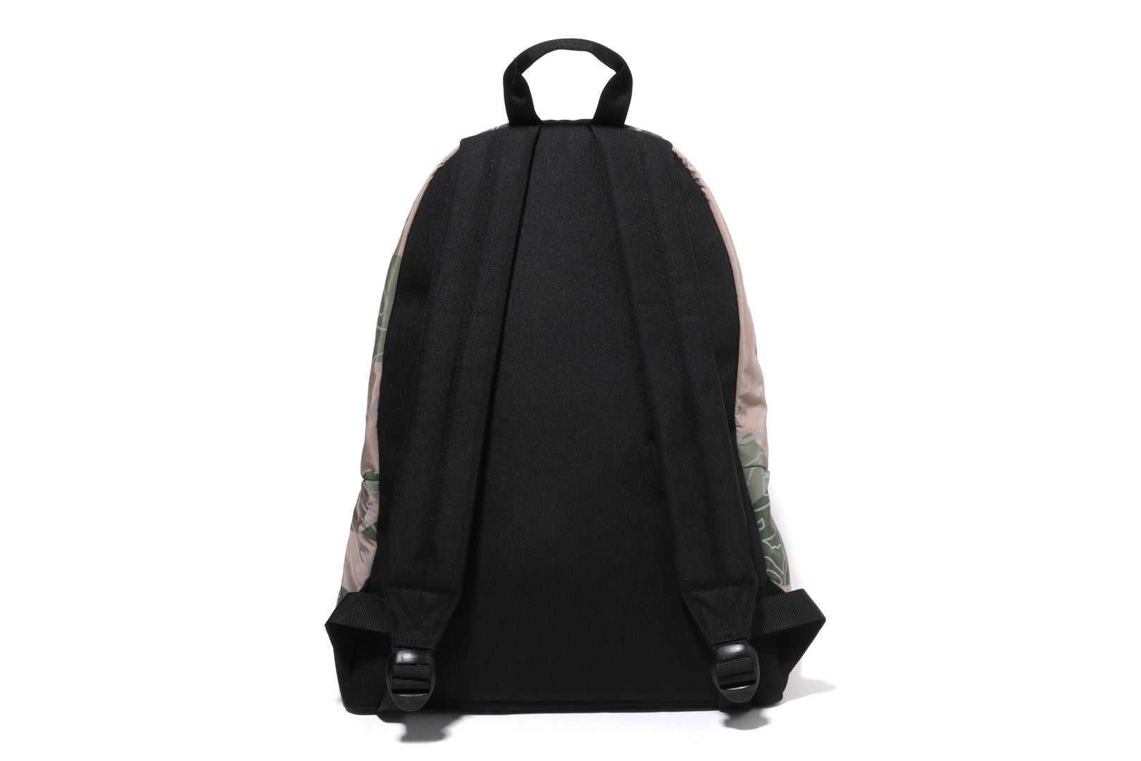 A daypack made of polyester material with a LAYERED LINE CAMO pattern. The SHARK motif is rubber printed on the front, and the LINE CAMO part is a phosphorescent print design. Comes with a round zipper for the pocket that follows the shape of the shark's mouth, and a zipper for the main compartment. APE HEAD is rubber printed on the nylon puller. There is a handle for hand carry on the top and straps on the left and right sides of the back. Available in 2 colors and 1 size.