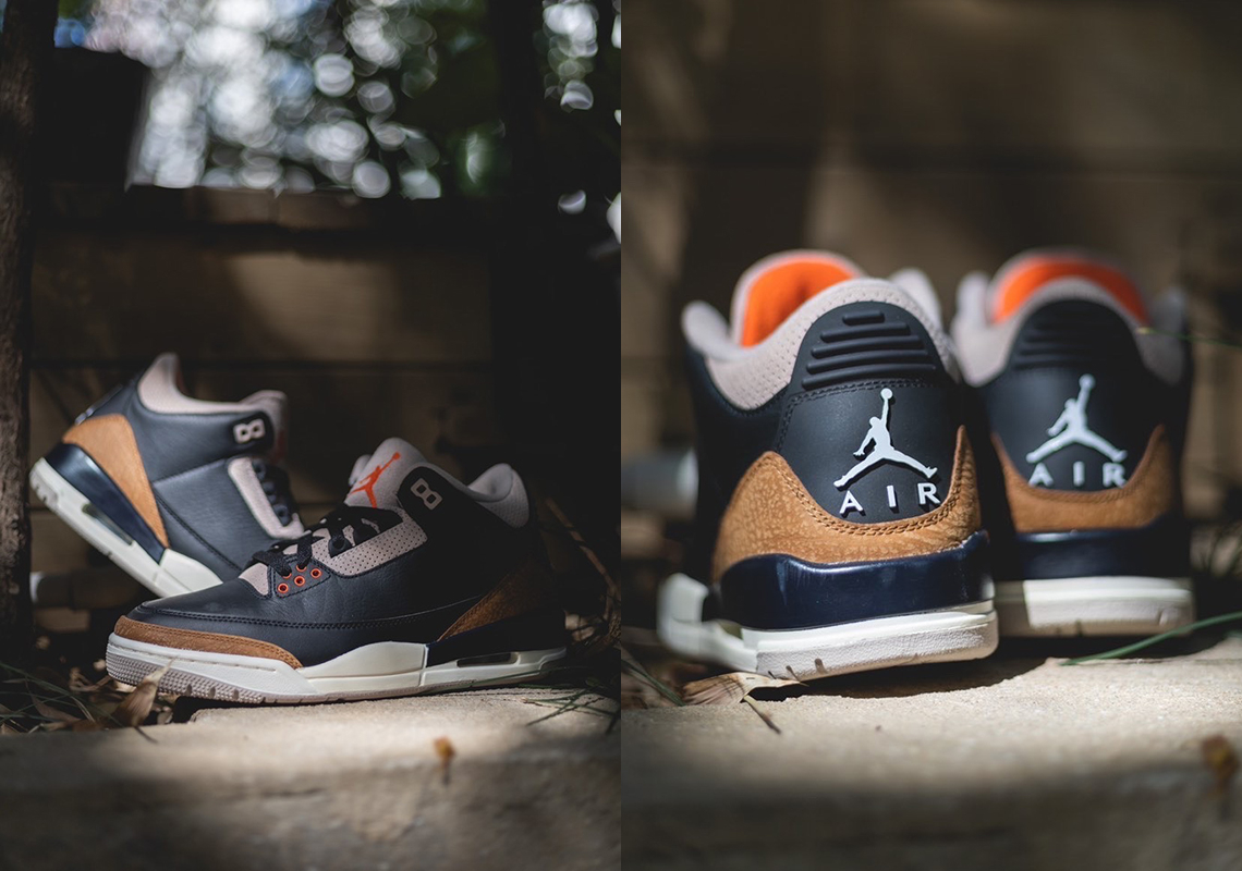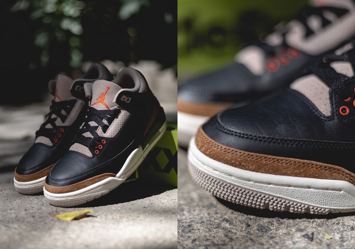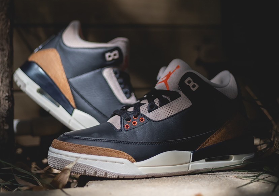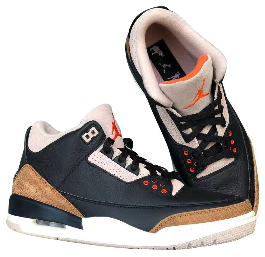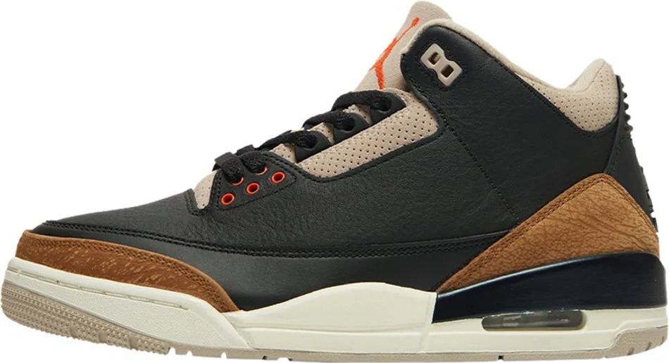 The Air 3 Retro 閳ユェesert Elephant閳?showcases materials and color blocking that stay true to the iconic silhouette閳ユ獨 original 1988 release. The upper is constructed from black tumbled leather with signature elephant-print overlays in a light tan finish. The neutral hue is repeated on the collar . eyestay . and tongue . the latter accented with a crimson Jumpman logo. Supporting the mid-top is a white polyurethane midsole with a visible Air-sole unit nestled under the heel.