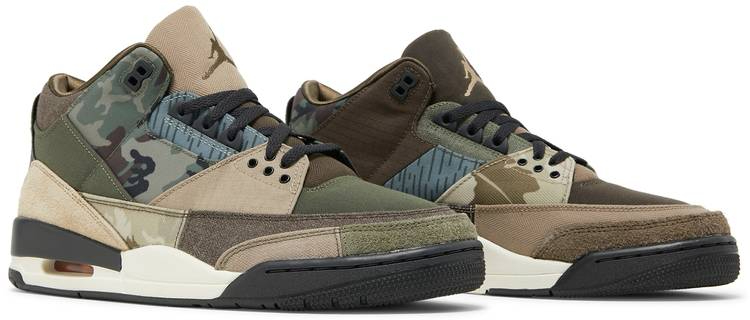 The Air 3 Retro 閳ユザatchwork閳?updates the iconic model with refreshed materials and prints. A dark beige hue is executed on the canvas and textile upper . fortified with contrasting overlays in moss green and woodland camo. The segmented mudguard features a mix of beige herringbone twill and grey rain camo . while the shaggy suede heel overlay is rendered in olive green. The heel tab offers customization opportunities via removable hook-and-loop fastener patches. Lightweight cushioning is provided by a two-tone polyurethane midsole with a red-tinged Air-sole unit under the heel.
