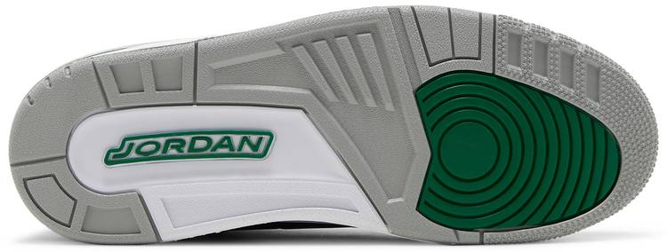 This Air 3 features a Black nubuck upper with Pine Green accents on the midsole . ankle . branding . and eyelets. Signature elephant print wraps the toe and heel atop a White midsole and Grey rubber outsole completes the design.