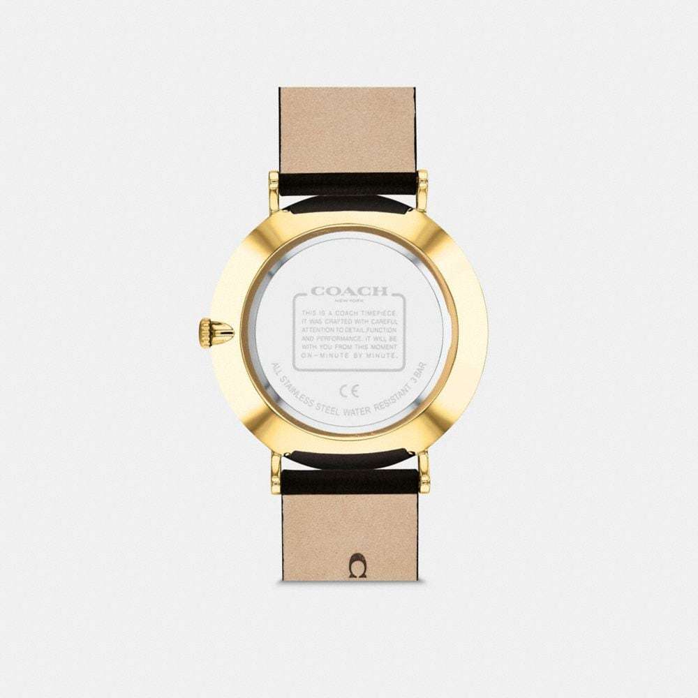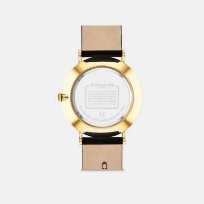 Gold tone case and black leather strap