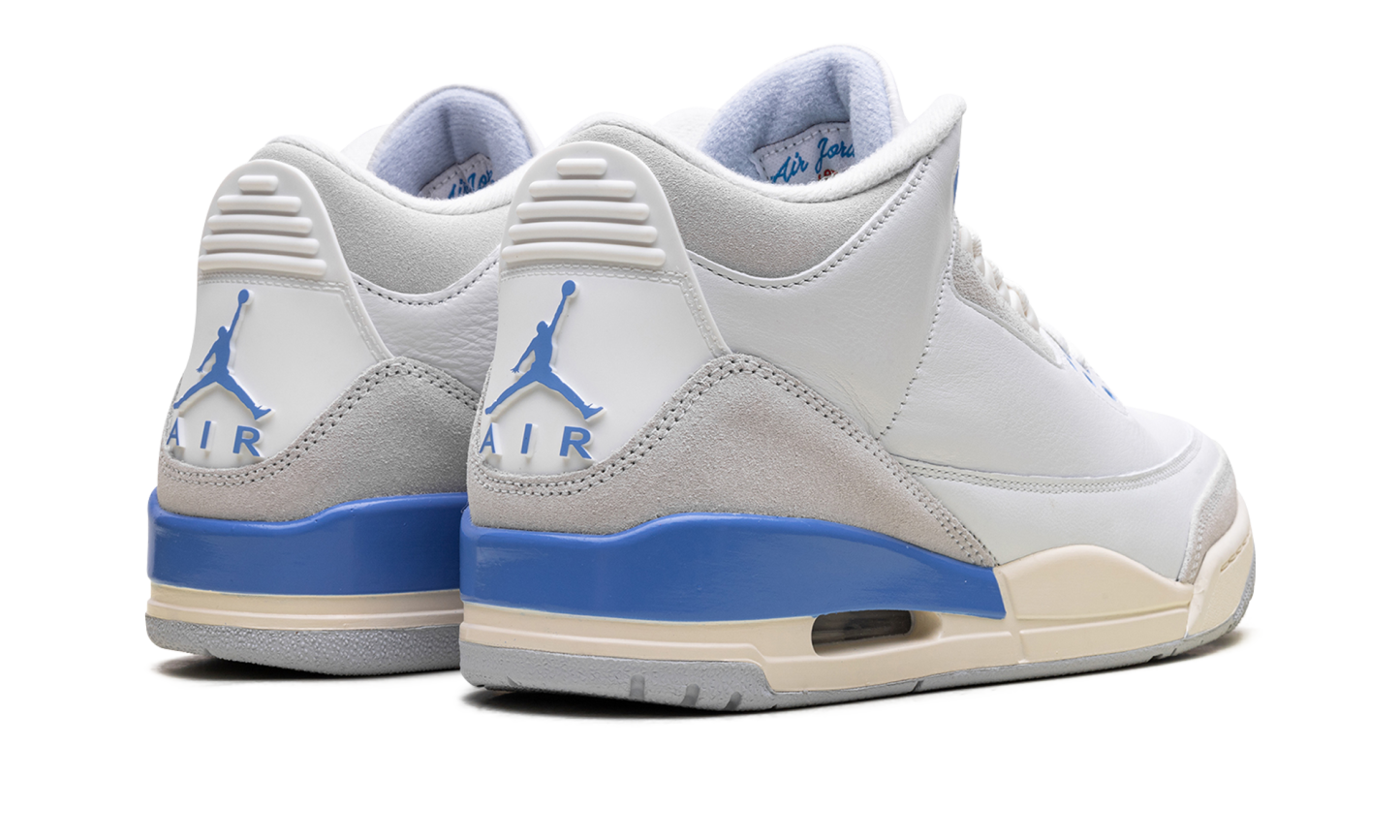 The Air Jordan 3 "Lucky Shorts" is a blue and white colorway of Michael Jordan's third signature shoe. The "Lucky Shorts" AJ3 takes inspiration from a pair of UNC shorts that Jordan wore underneath his NBA uniform during his carer. The upper on this Jordan 3 mixes white leather with off-white suede and adds Carolina blue accents throughout. Lucky Shorts