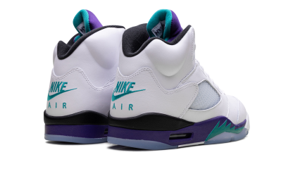 The Air Jordan 5 "Grape" is one of the most popular colorways of Michael Jordan's fifth signature shoe. Popularized by its appearance on the TV show The Fresh Prince of Bel-Air, the "Grape" AJ5 OG returned in 2025. The sneaker features a white upper that is accented with a purple tongue adorned with an aqua Jumpman logo. The Jordan 5 also has purple and aqua accents on the midsole and the Air Jordan 5's signature toggle lace lock. Grape 2025