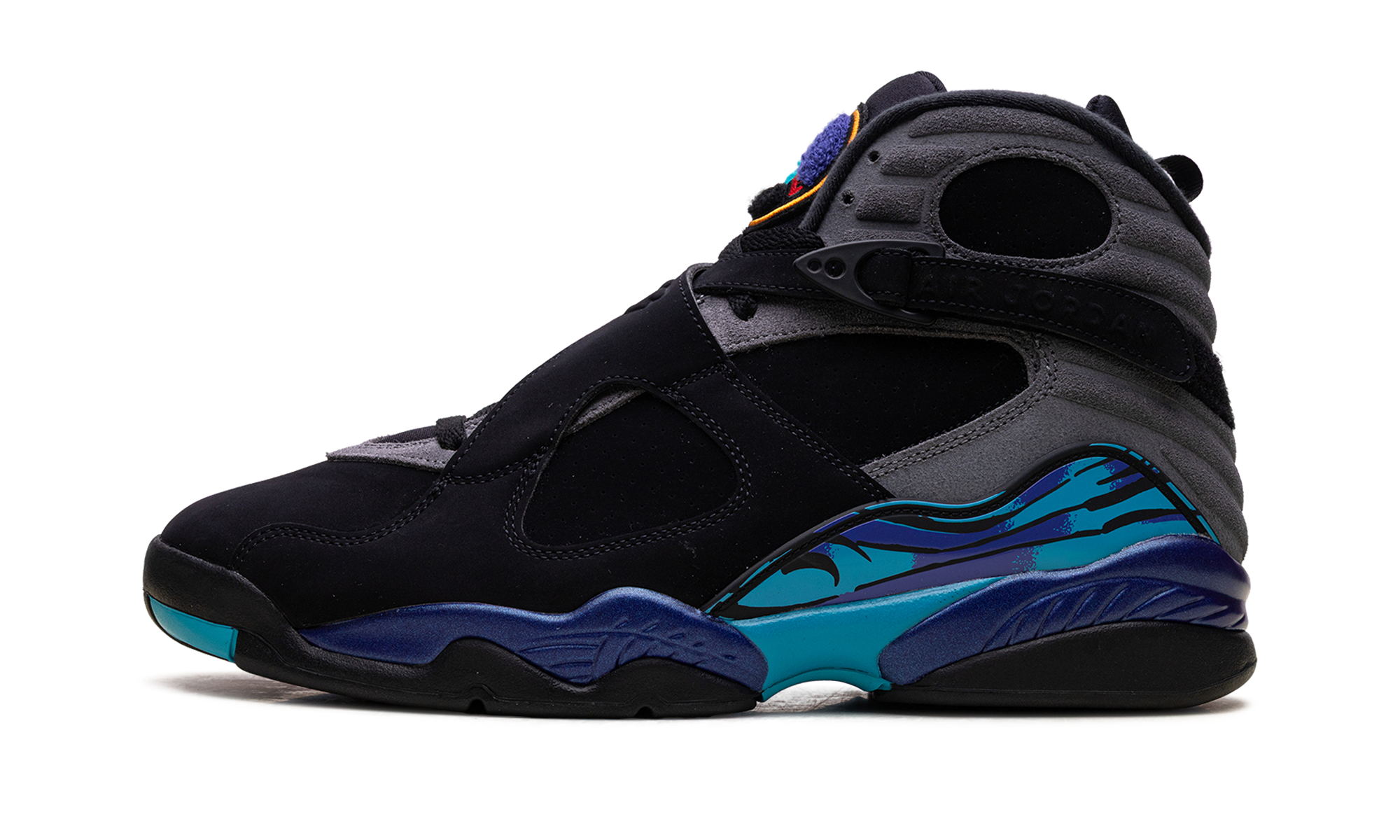 Make a vibrant statement with the unmistakable style of the Air Jordan 8 "Aqua." The bold black nubuck upper is highlighted by the iconic aqua and concord accents on the midsole and signature chenille tongue logo. The distinctive cross straps add to its standout look, making this colorful retro a must-have for any sneaker enthusiast. Aqua (2025)