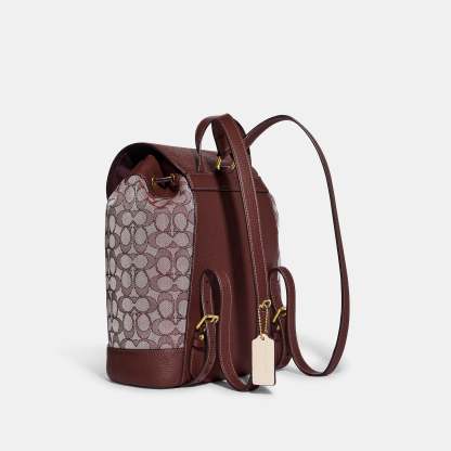 Signature jacquard and refined pebble leather Inside zip and multifunction pockets Drawstring and snap closures fabric lining Top handle with 3 drop Adjustable shoulder straps 10 1/4 (L) x 12 (H) x 6 1/4 (W) This piece is crafted of our Signature jacquard made from a blend of organic cotton and recycled polyester Style No. CE601 | Outlet Dempsey Drawstring Backpack In Signature Jacquard With Stripe And Patch - Red