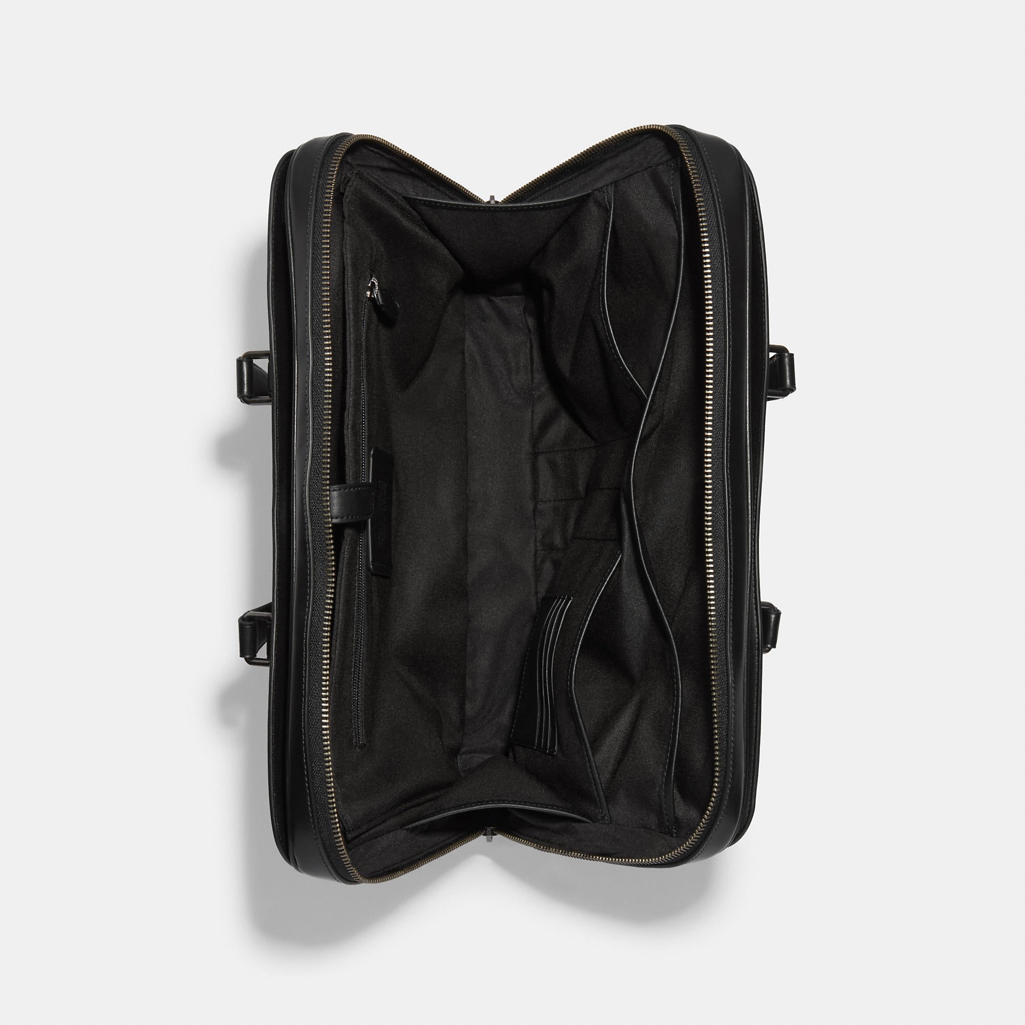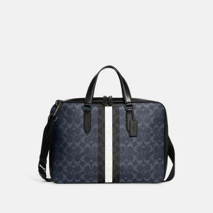 Signature coated canvas and refined calf leather Four credit card slots Inside zip and multifunction pockets Inside laptop sleeve with secure tab Zip closure fabric lining Handles with 5 drop Outside snap pockets Detachable strap with 21 drop for shoulder or crossbody wear 15 1/2 (L) x 11 (H) x 2 1/4 (W) Style No. C9826 | Outlet Graham Slim Brief In Blocked Signature Canvas With Varsity Stripe - Beige