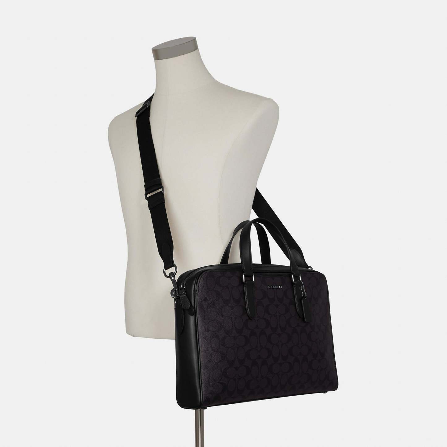Signature coated canvas and refined calf leather Four credit card slots Inside zip and multifunction pockets Inside laptop sleeve with secure tab Zip closure fabric lining Handles with 5 drop Outside snap pockets Detachable strap with 25 drop for shoulder or crossbody wear Four protective feet at base 15 1/2 (L) x 11 (H) x 3 1/4 (W) Style No. C8175 | Outlet Graham Structured Brief In Signature Canvas - Black
