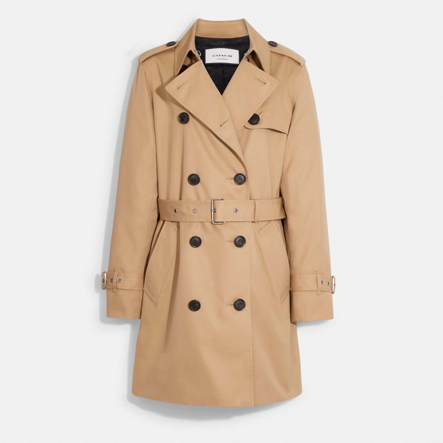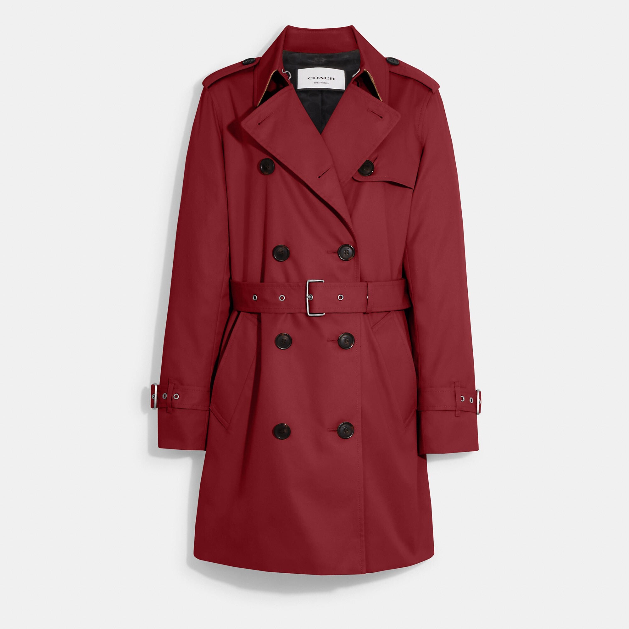 68% cotton 32% polyester Lining - 58% polyester 42% viscose Button closure Slip pockets Adjustable belt Water-resistant Length - 33 1/4 Model is 5'10 (178cm) chest 31 (79cm) waist 24 (61cm) hips 35 (89cm) and wears a size S Style No. CG043 | Outlet Solid Mid Trench - Red, Size - Large