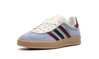 The adithtdas Gazelle Indoor "Blue Dawn" is a unique colorway of the retro indoor soccer shoe with a casual look. The colorway features a Blue Dawn suede construction with a cream leather eyestay and cream leather tongue. The sneaker's iconic Three Stripes branding is designed in burgundy and green stripes on the sides. Additional burgundy accenting appears on the leather heel tab with debossed "adithtdas" detailing. A gum rubber sole with an "adithtdas" logo on the lateral side of the heel completes the look. Release date: August 25, 2023 Blue Dawn Collegiate