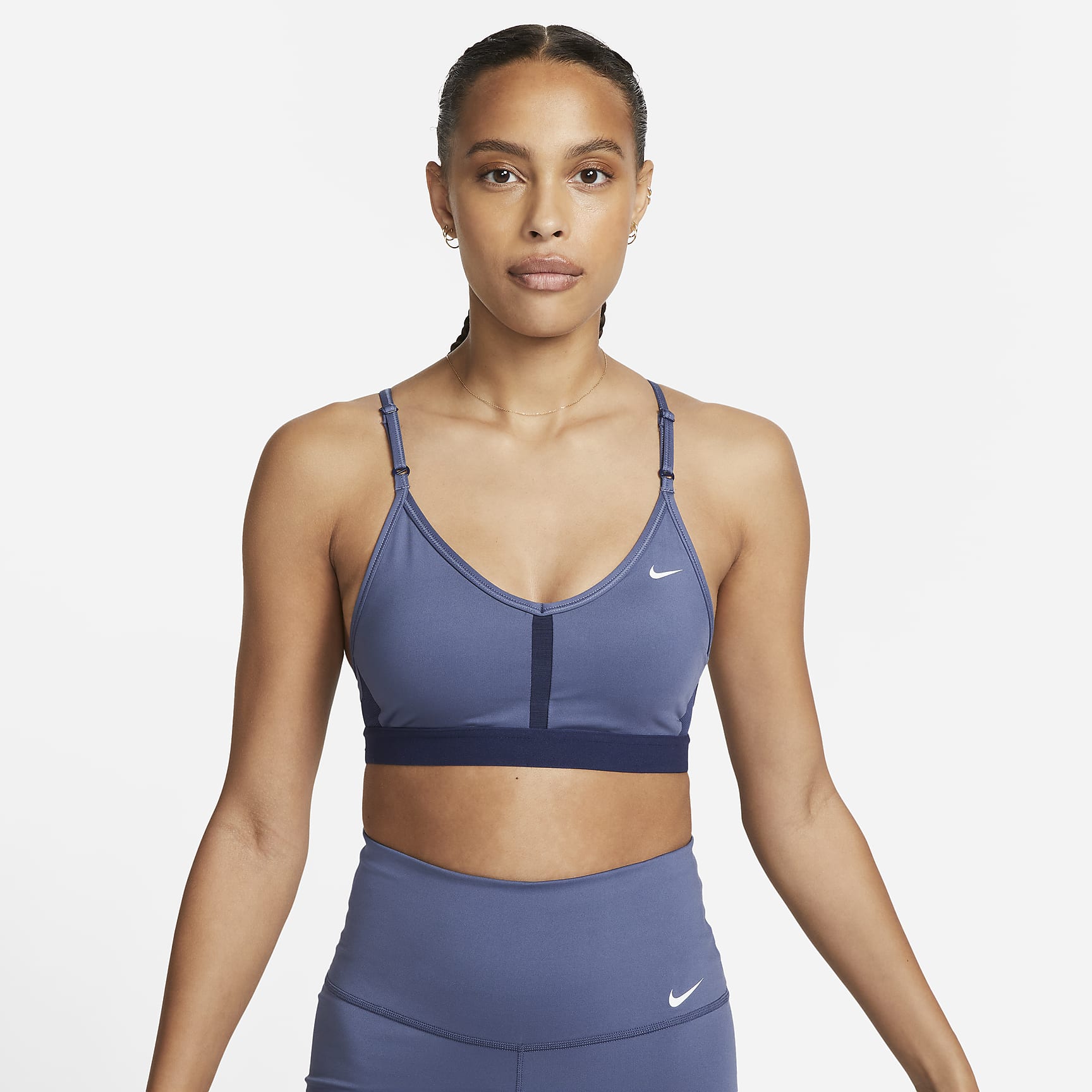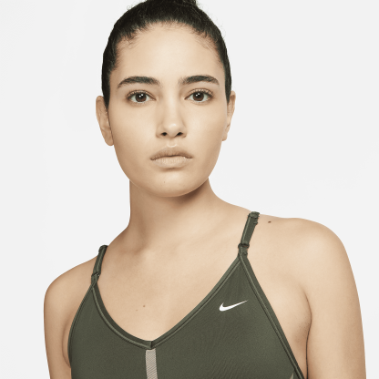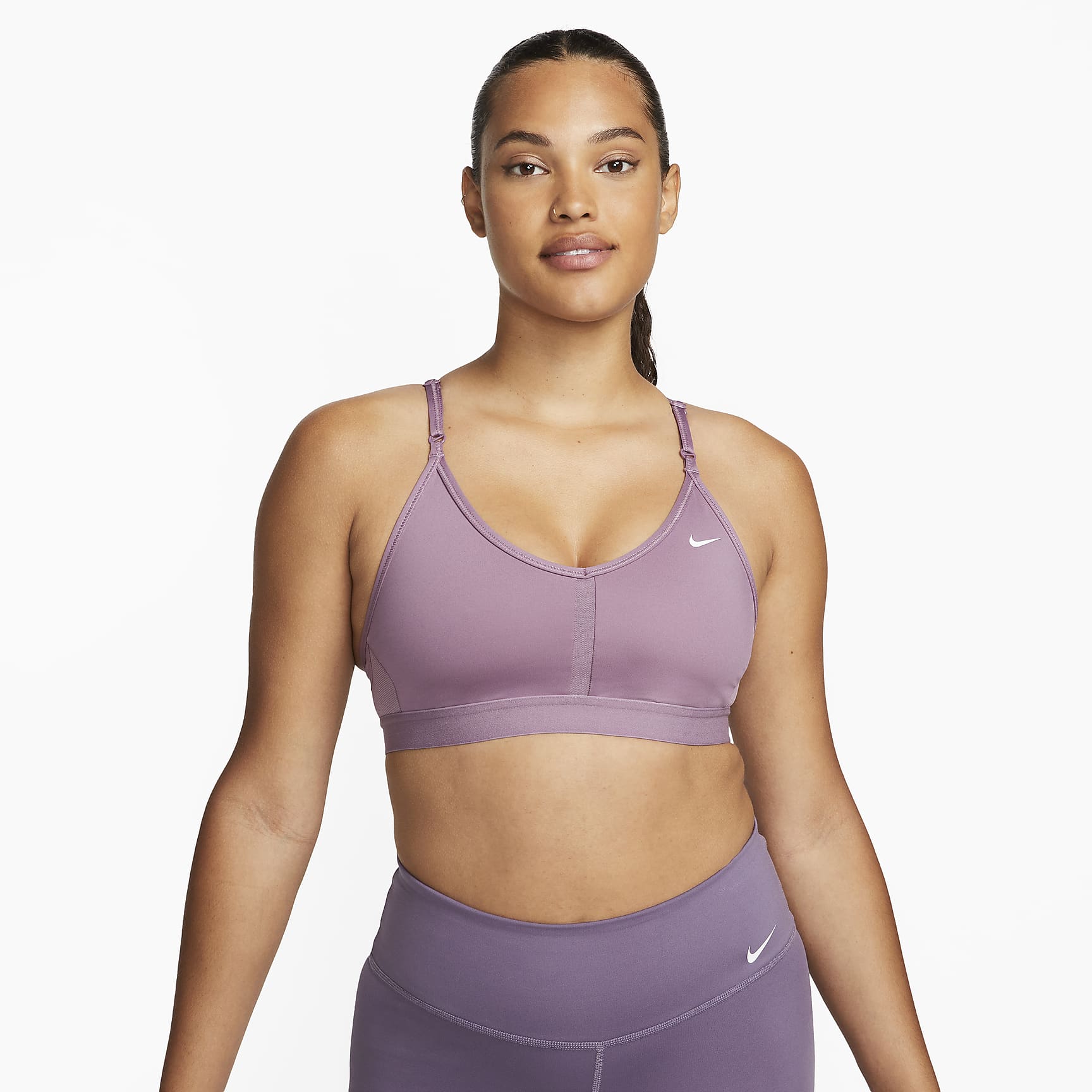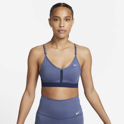 The Dri-FIT Indy Sports Bra makes simple support even easier with straps that adjust in the front. Soft fabric is designed for breathability on the front and back in case you work up a sweat. With easily removable pads and bonded flat seams, it's effortlessly comfortable. This product is made with at least 50% recycled polyester fibers.