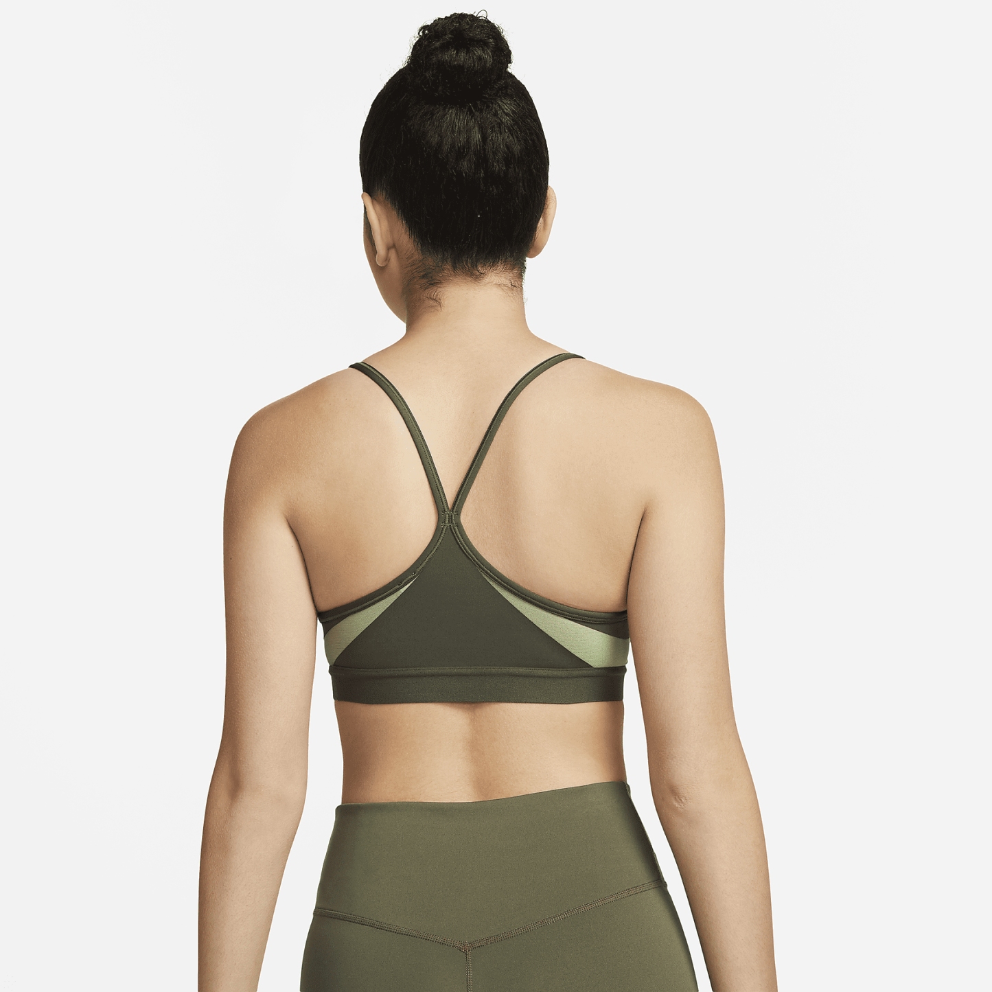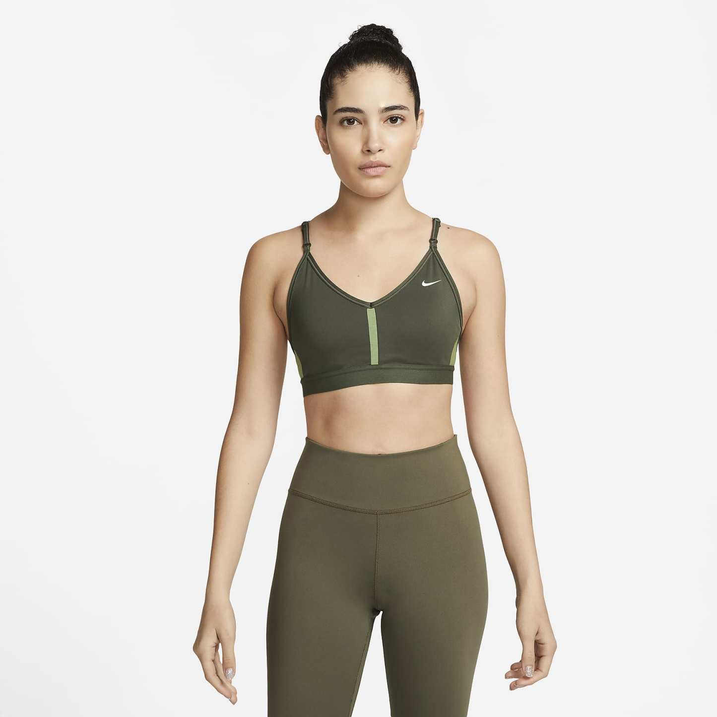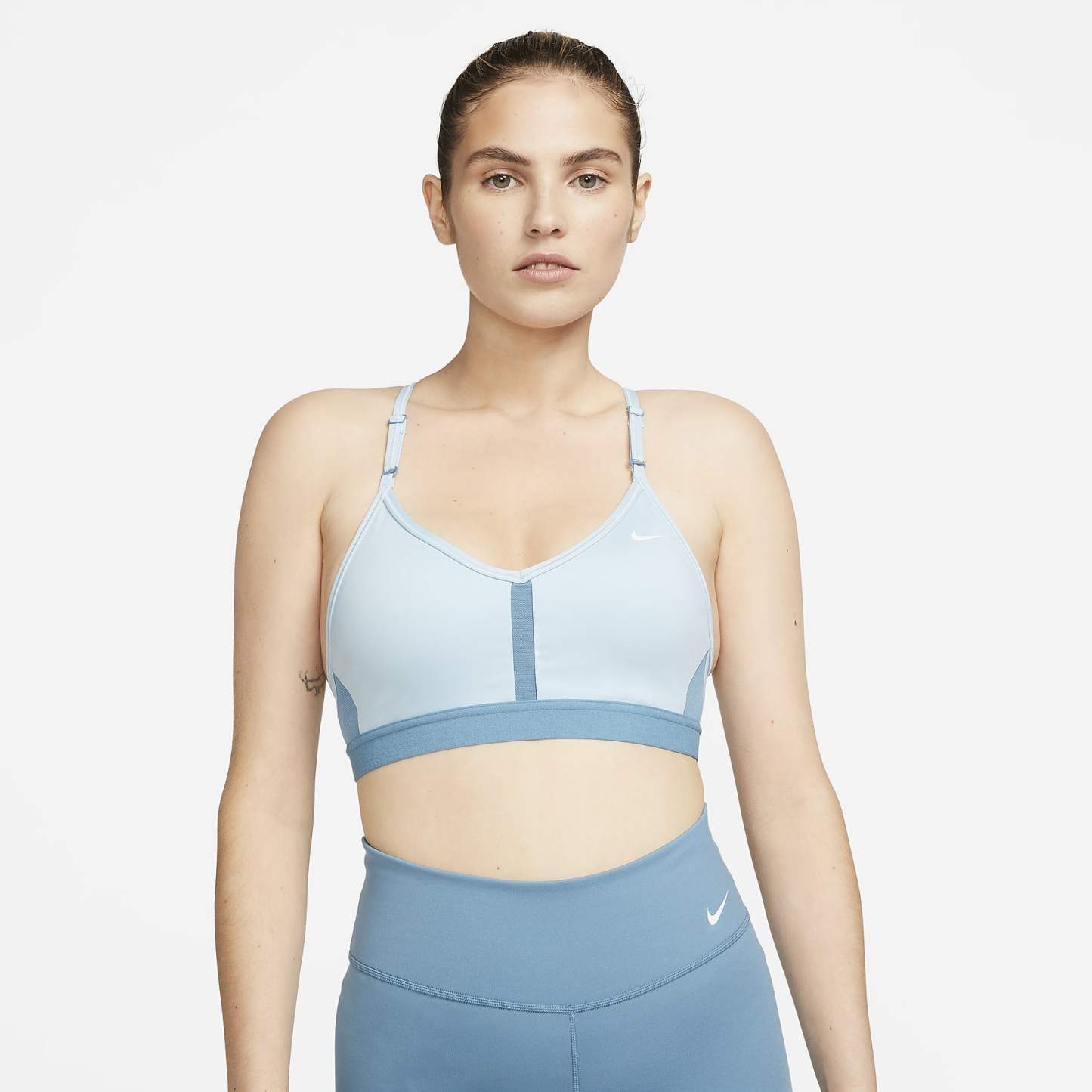 The Dri-FIT Indy Sports Bra makes simple support even easier with straps that adjust in the front. Soft fabric is designed for breathability on the front and back in case you work up a sweat. With easily removable pads and bonded flat seams, it's effortlessly comfortable. This product is made with at least 50% recycled polyester fibers.