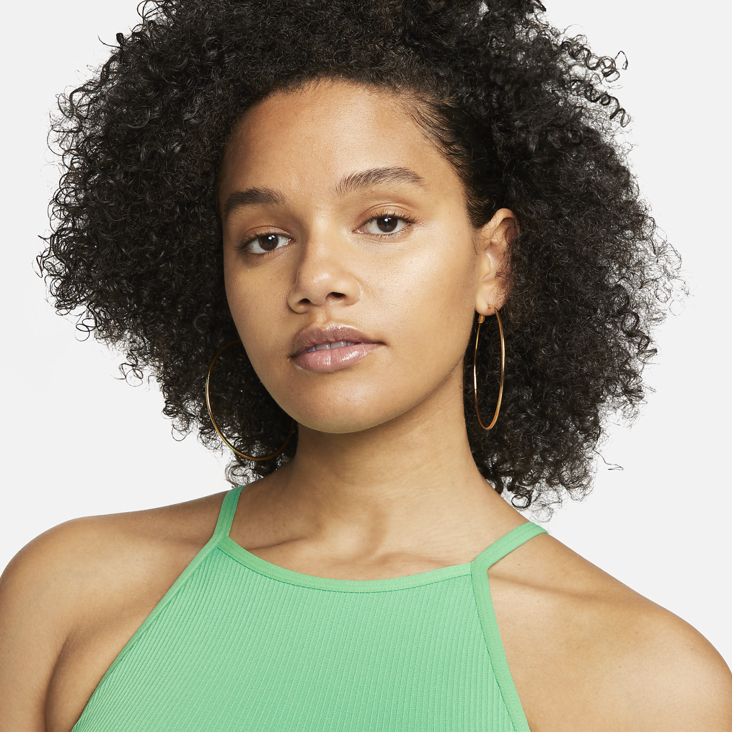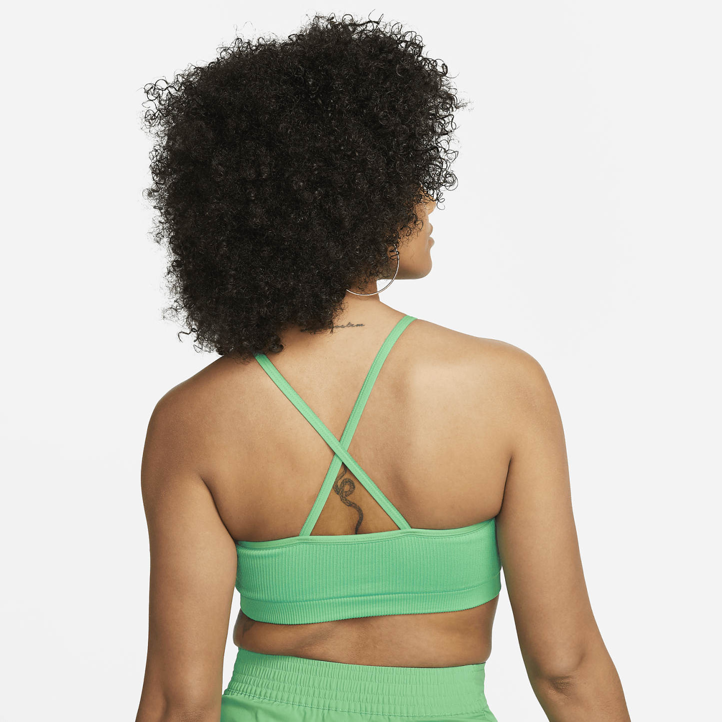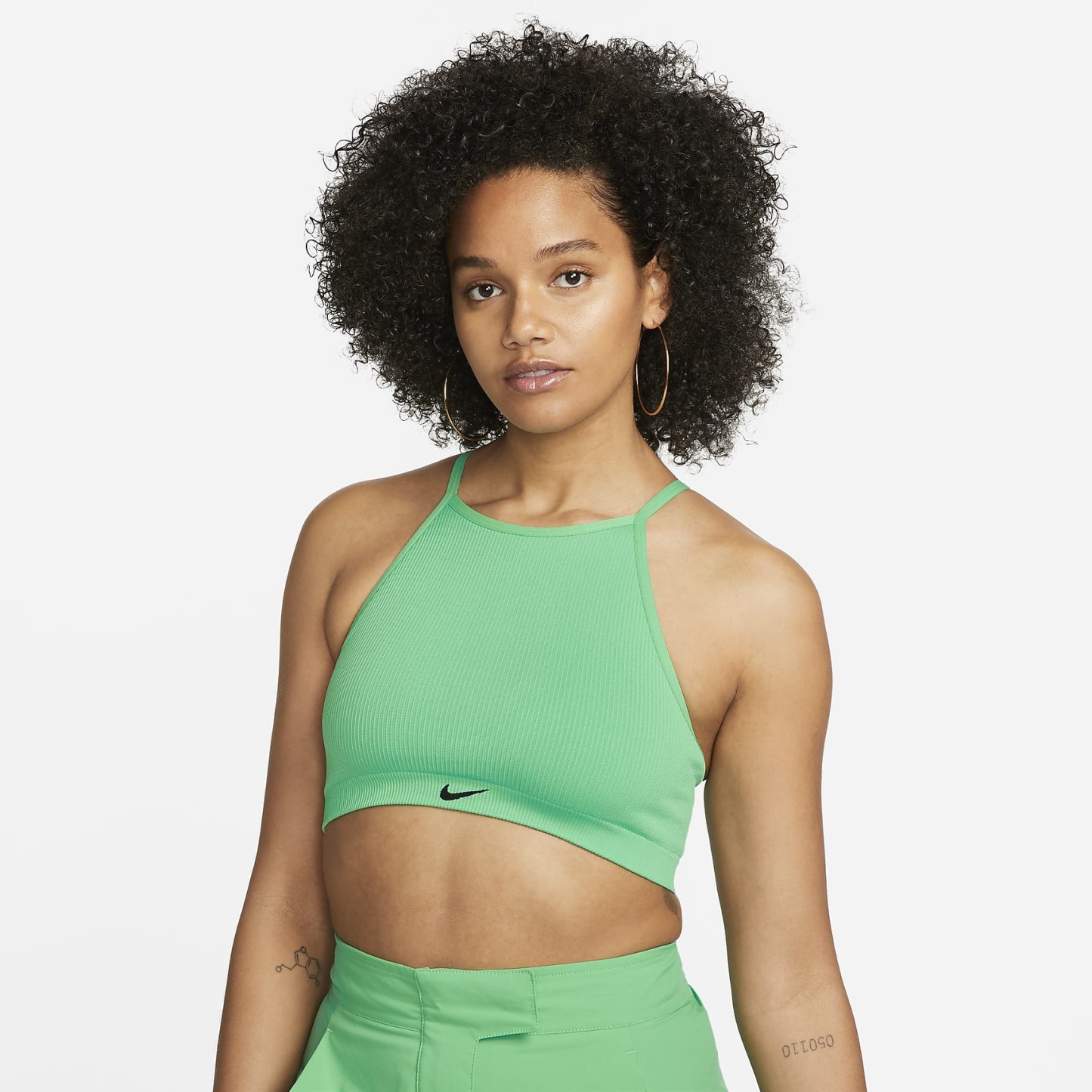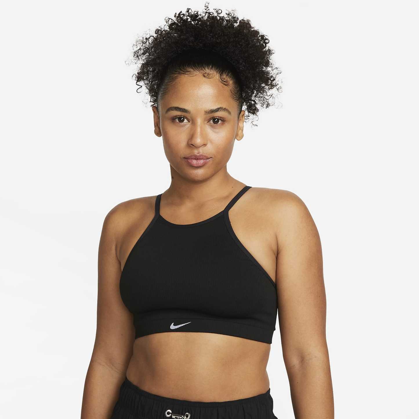 With incredibly soft, ribbed fabric and a seamless design, this bra feels like a second skin. A ruched knit jersey lining provides some modesty and gentle shaping, while the strappy back and moisture-wicking technology help keep you cool as you move through your day.