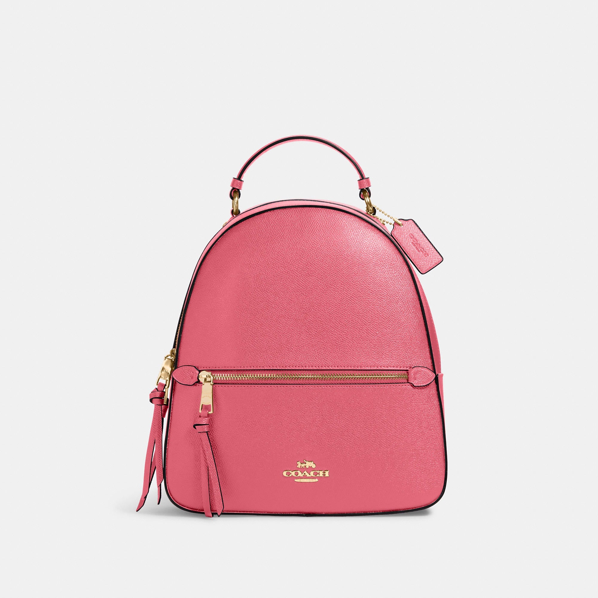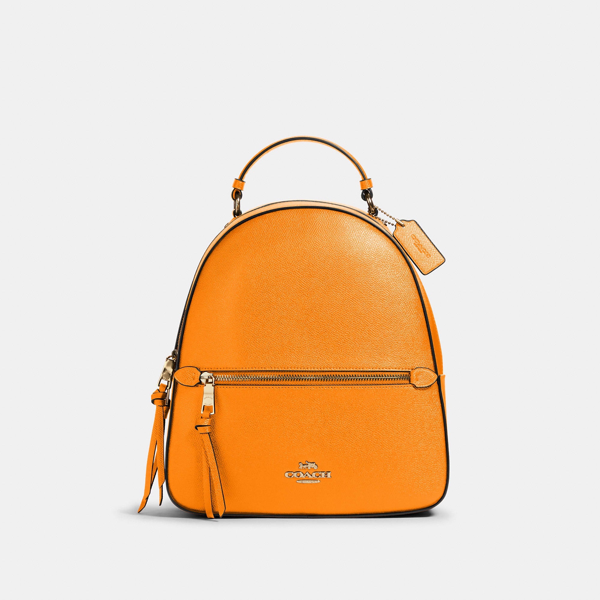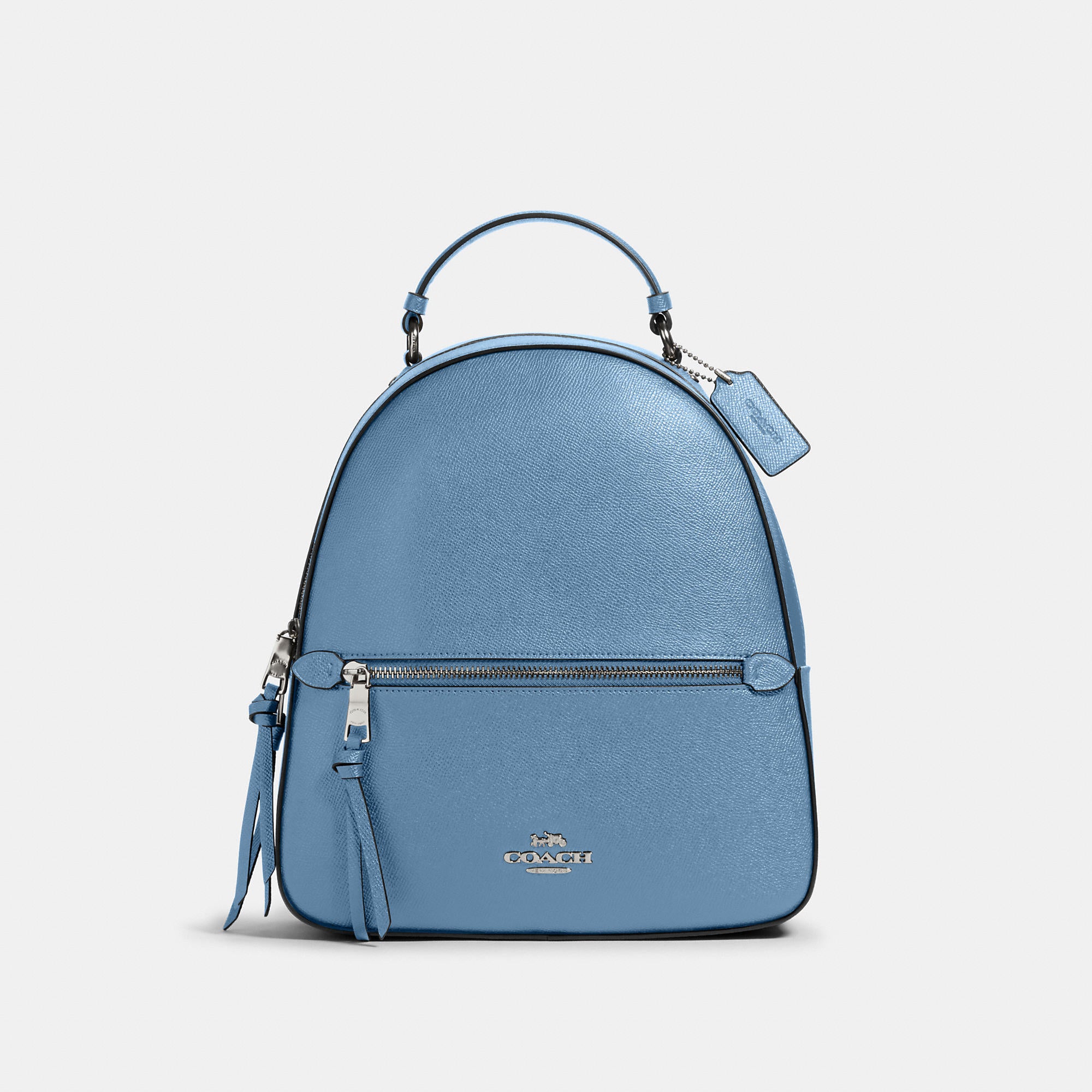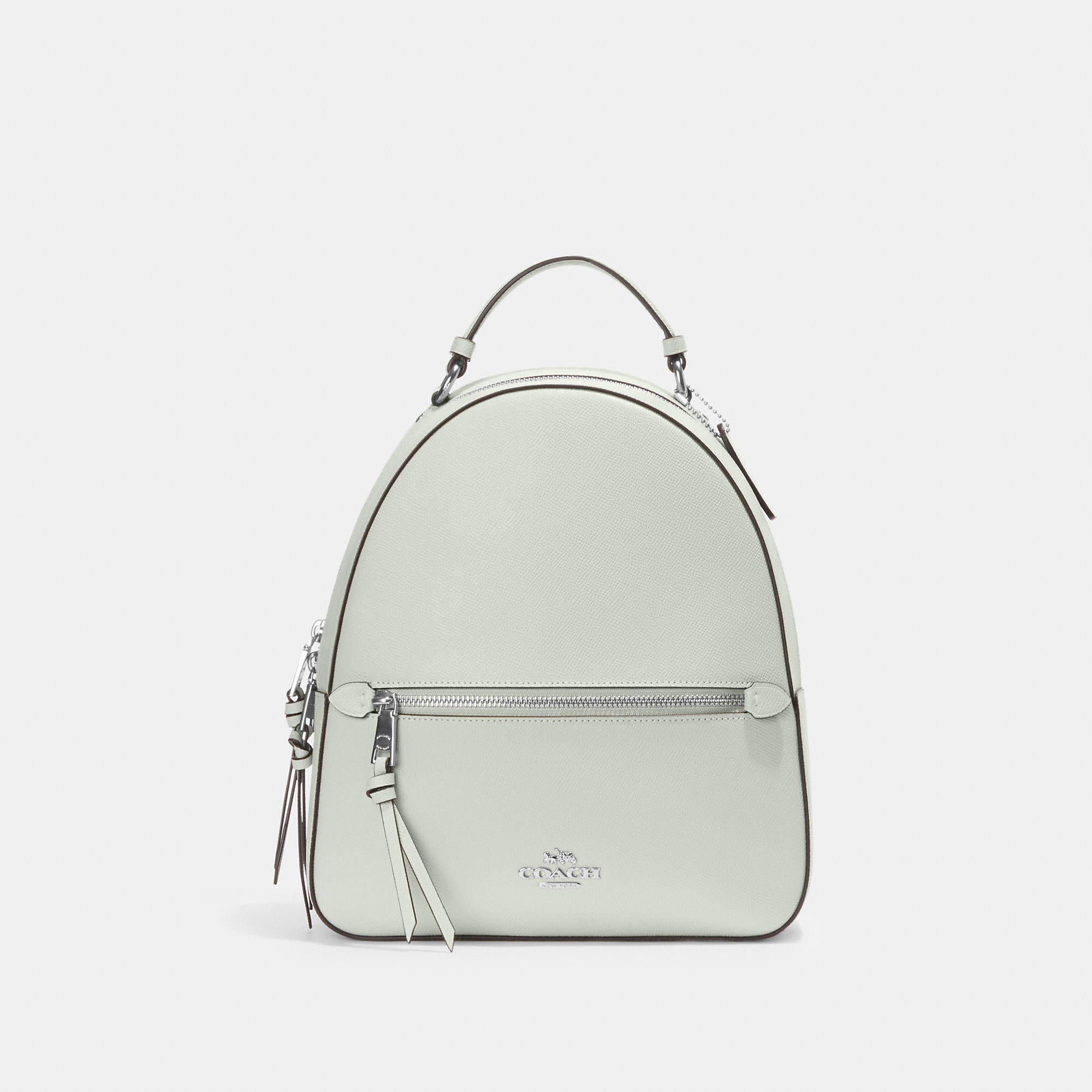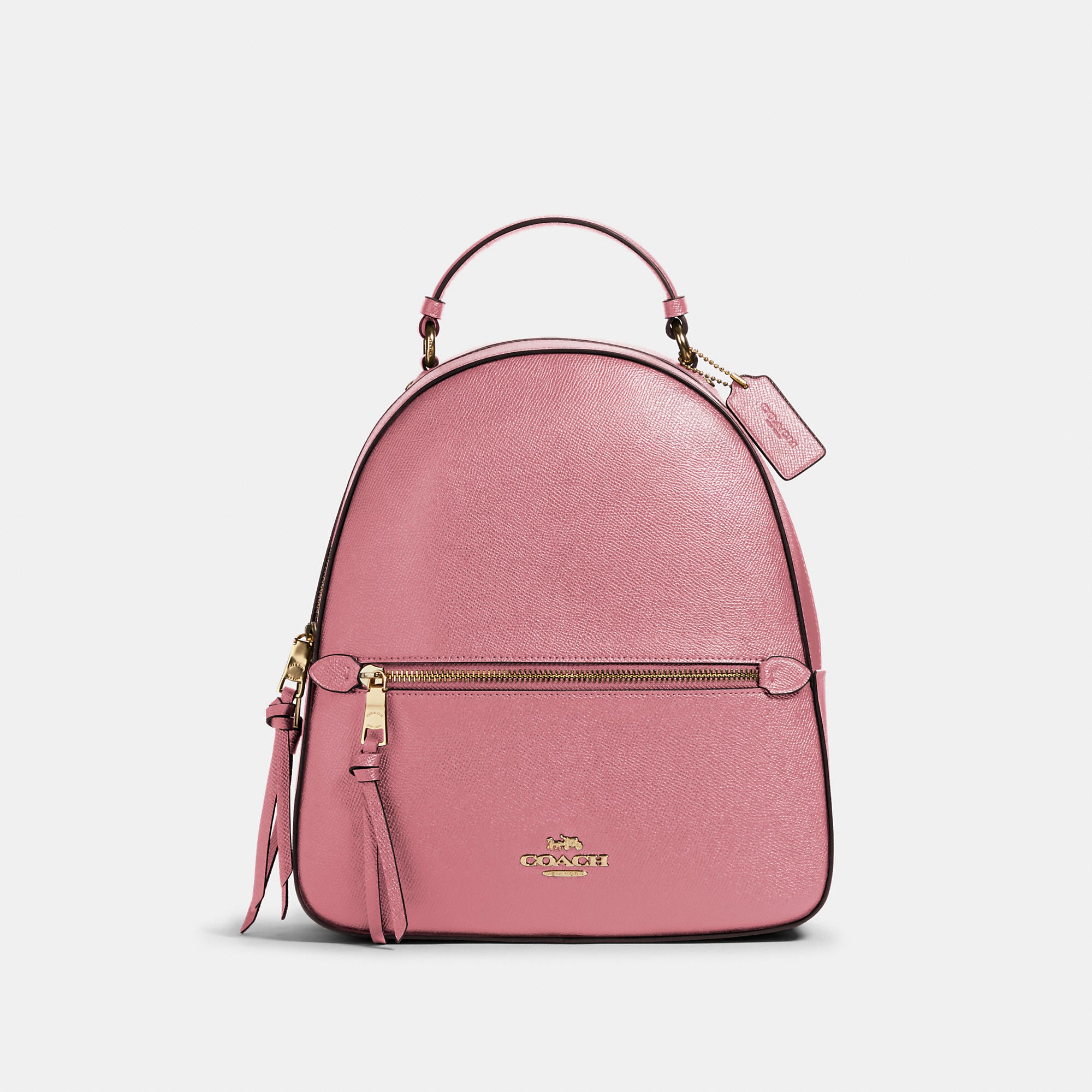 This crossgrain leather Jordyn backpack is perfectly sized for everyday and weekend adventures. Crossgrain leather Inside zip pocket Zip closure, fabric lining Top handle with 2In drop Outside zip pocket Adjustable shoulder straps 10 1/2In (L) x 12 1/4In (H) x 3 3/4In (W)