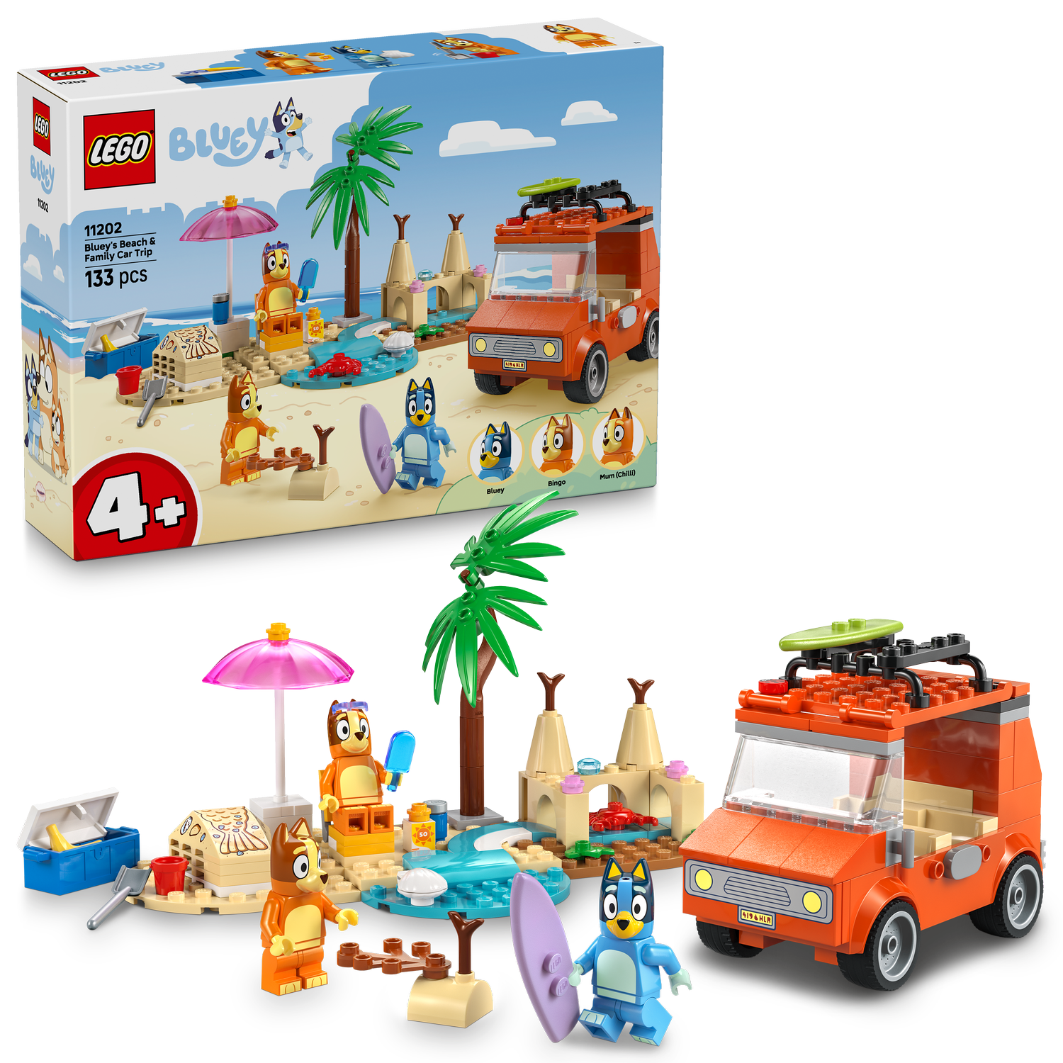 - Interactive building toy for kids – This fun-packed playset features LEGO® minifigures, a toy vehicle and lots of hands-on activities for a fun day at the beach with Bluey, Bingo and Mum