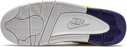 The Flight Legacy ‘ features a familiar color scheme that pays homage to LA’s senior NBA franchise. The retro-inspired silhouette takes its design cues from basketball shoes . highlighted by a white leather upper with a purple Swoosh that wraps around the heel. ’s classic Flight logo is embroidered in gold lettering across the tongue . complementing the branding hit that adorns the heel panel.