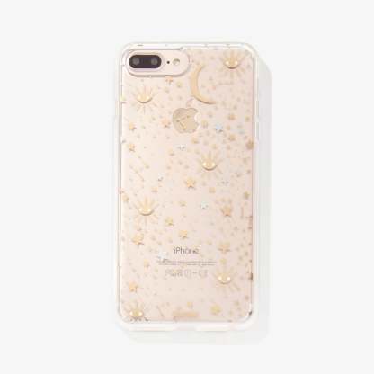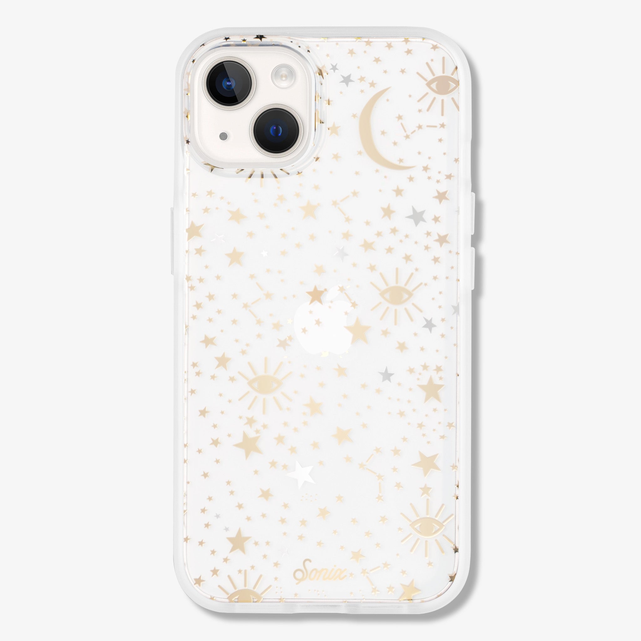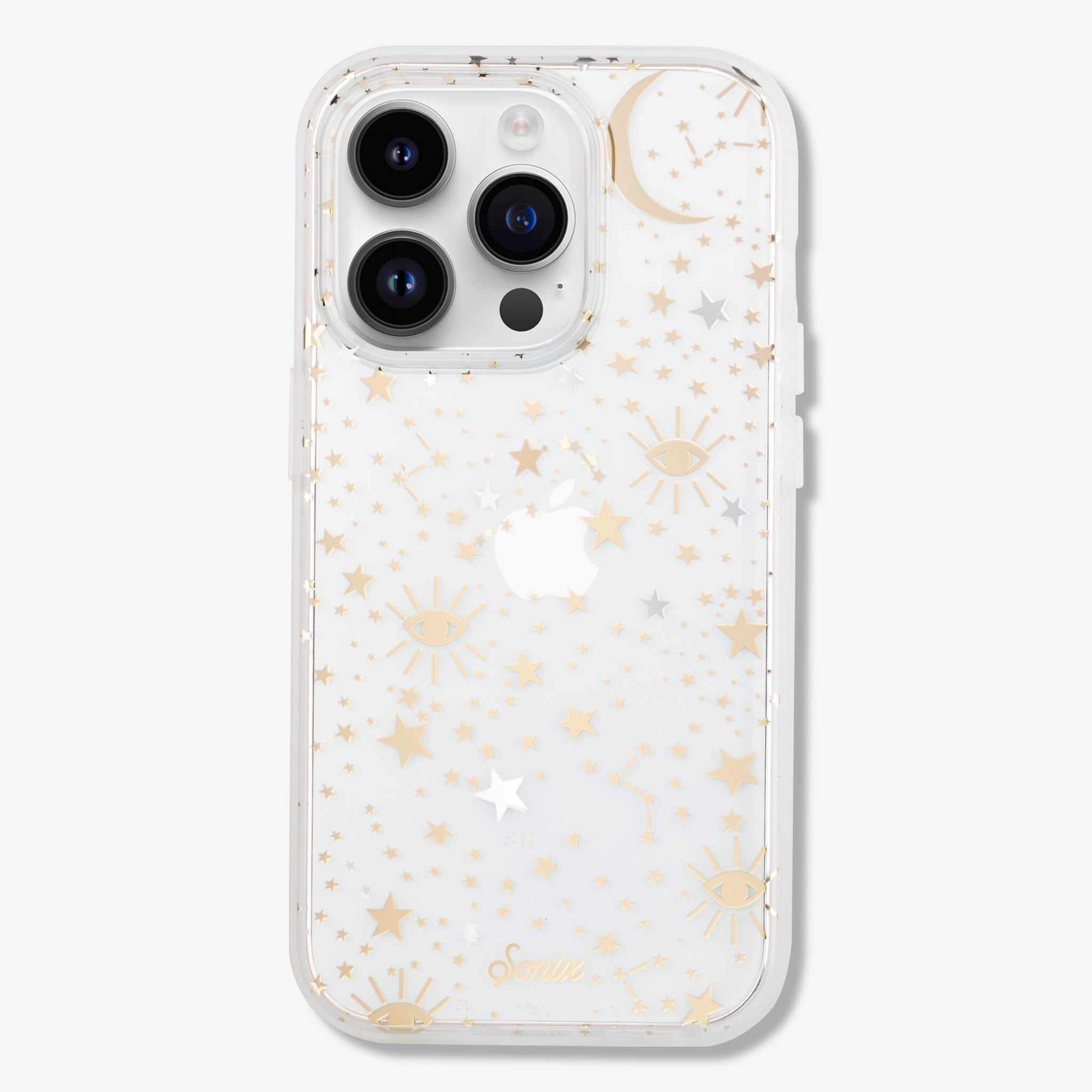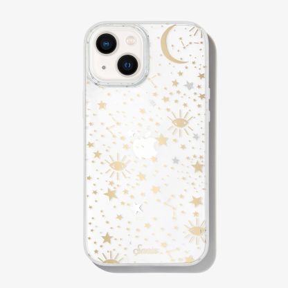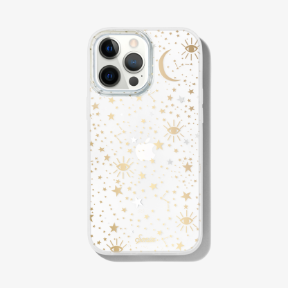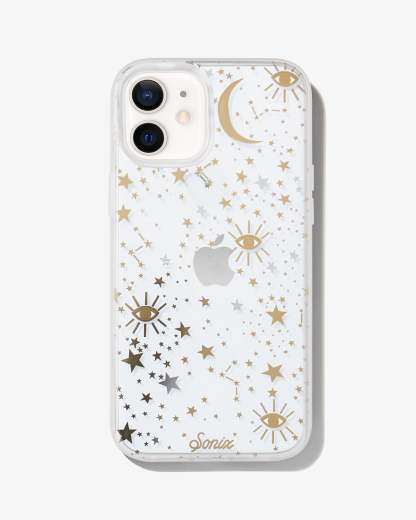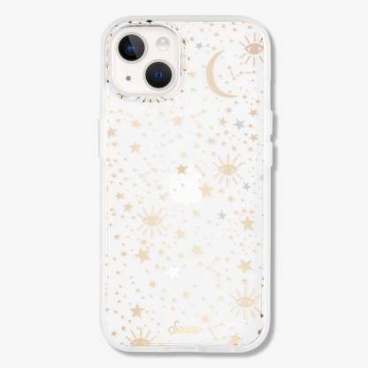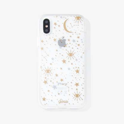 Cosmic iPhone case is a Sonix original. This case features stars, moons, and eyes foiled in gold and silver - making it a fan favorite. This clear coat iPhone case showcases the color of your phone!