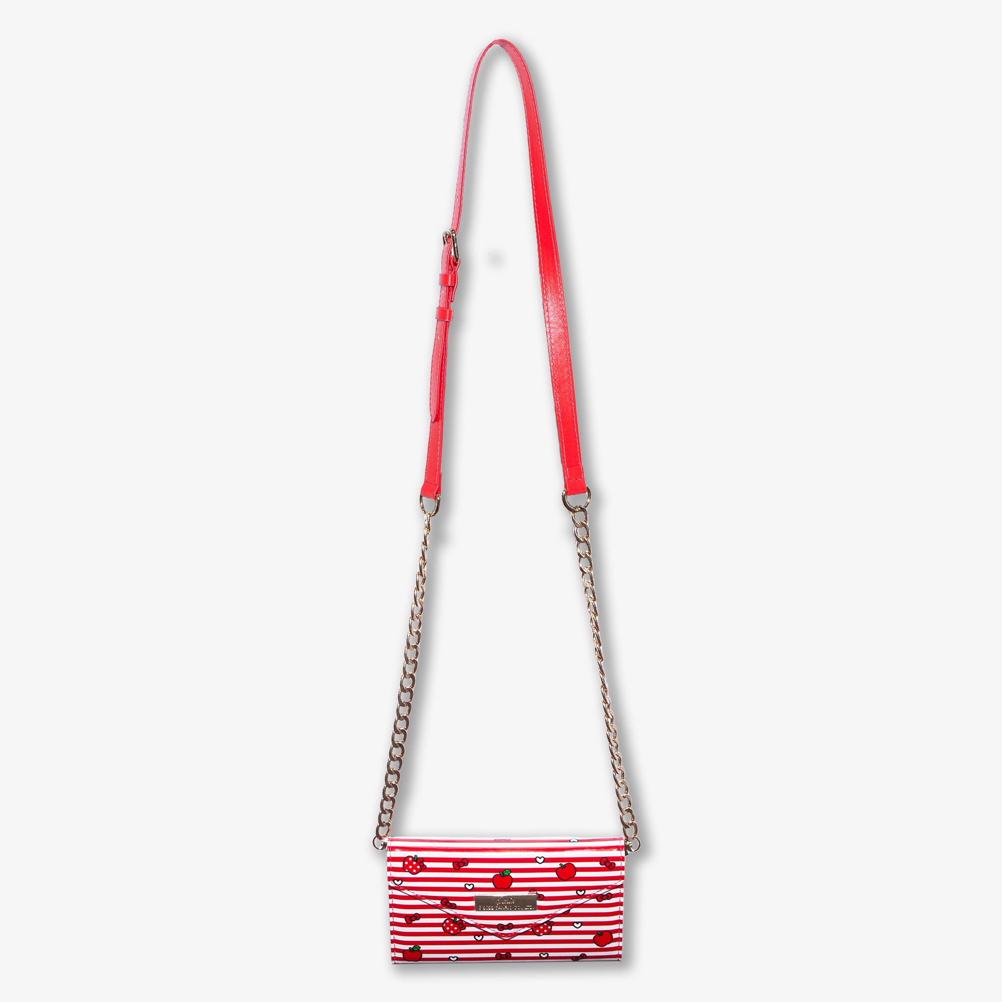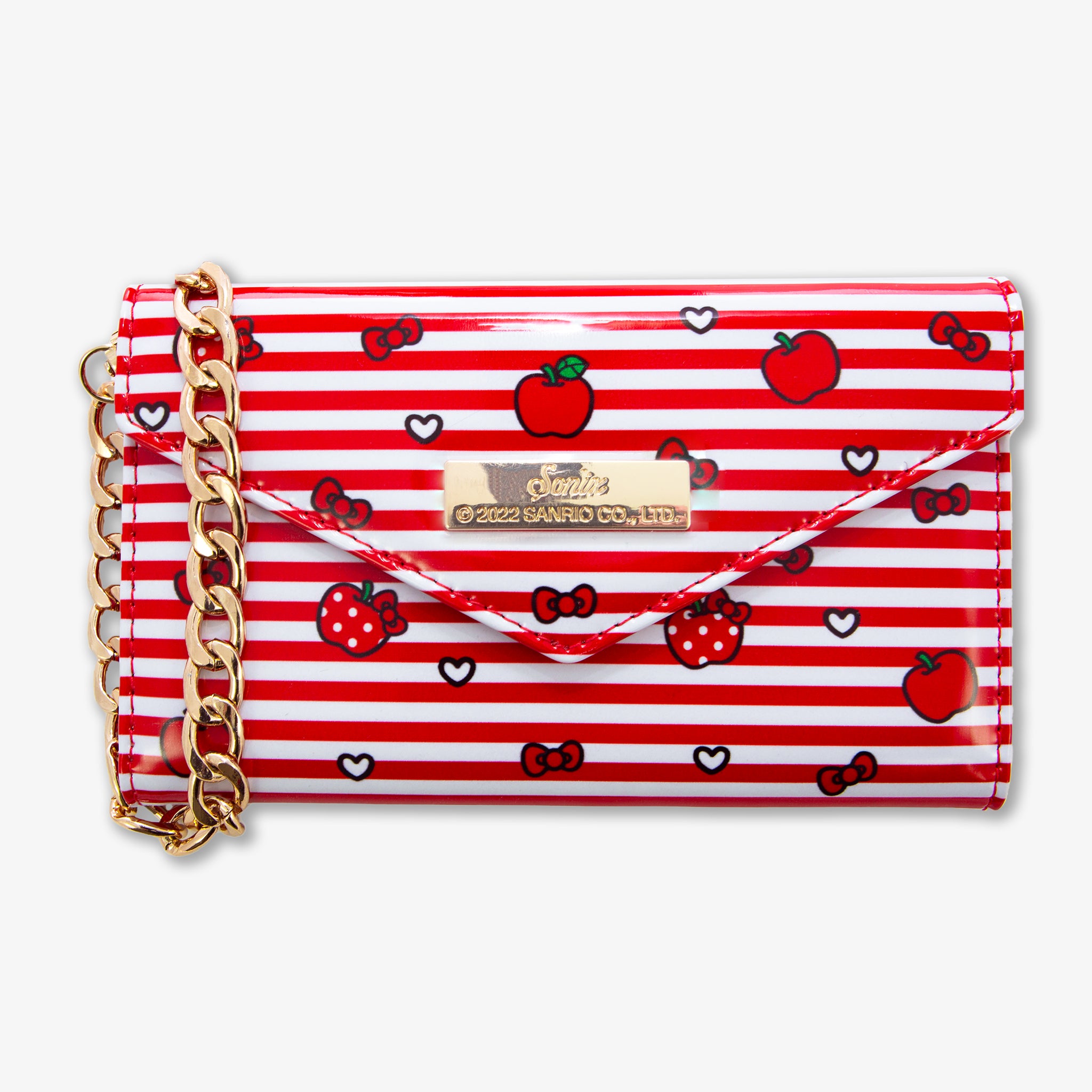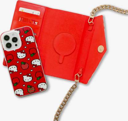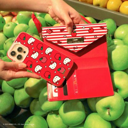Take everything on to go with our latest Hello Kitty® accessory! This striped trifold wallet features the puffy wallet style that is uniquely Sanrio® complete with a crossbody strap. Using MagSafe® compatible attachment, the special edition phone case featuring Hello Kitty®, apples and?hearts can be easily removed from the wallet! This case is only sold with the wallet! Want more Sanrio®? Discover the whole collection